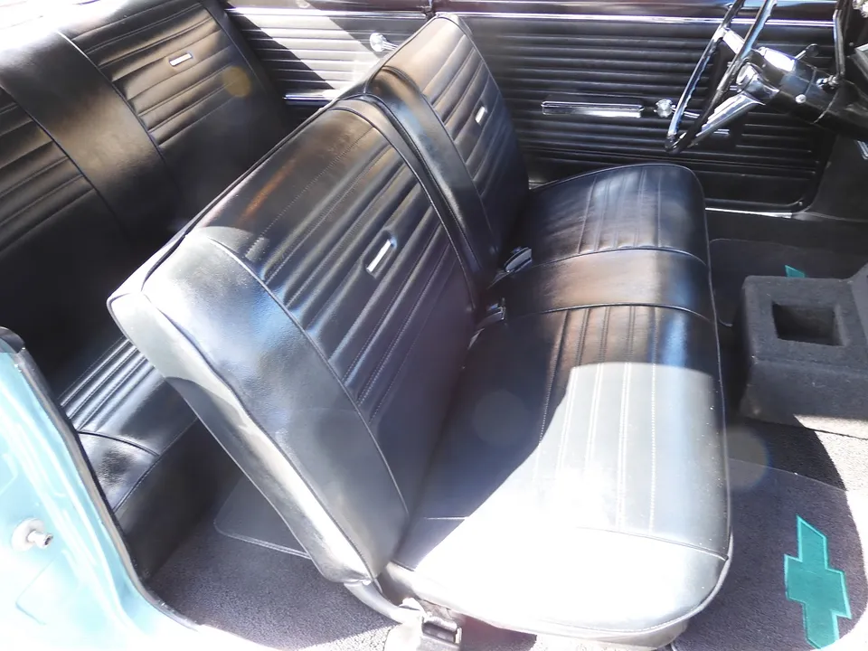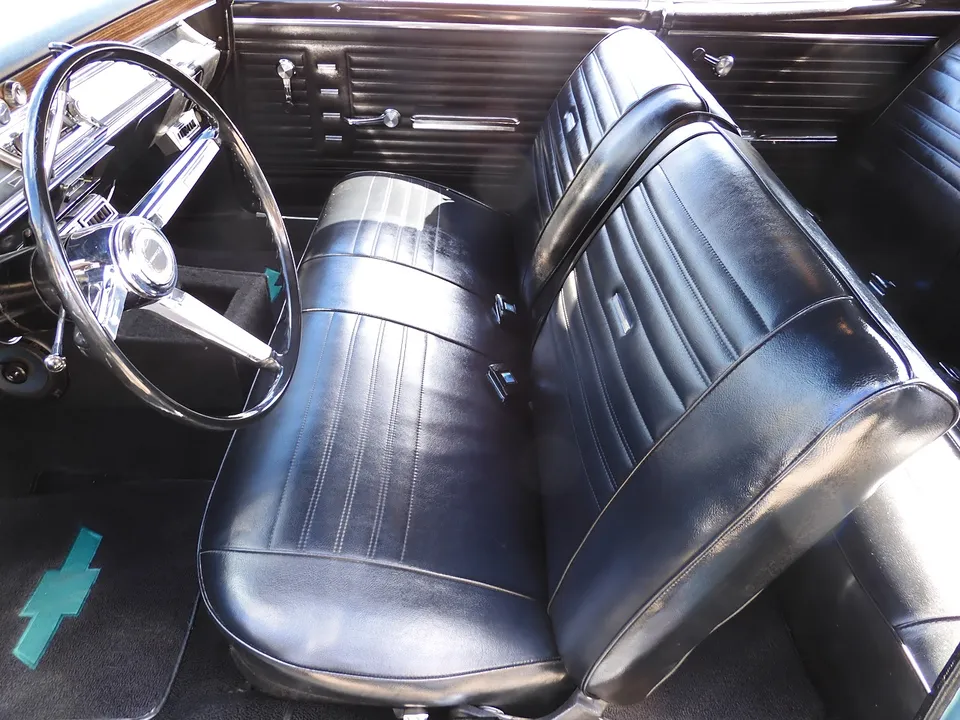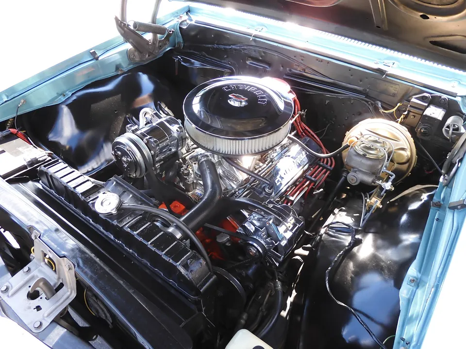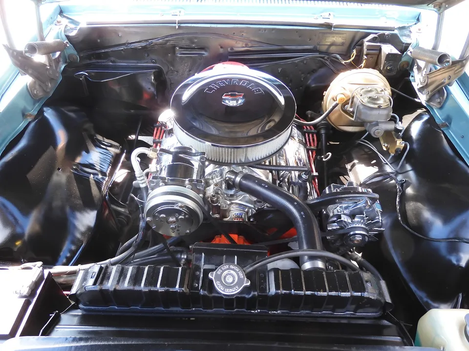 Beautiful factory (K) Emerald turquoise metallic, factory (2) black vinyl top, factory (761) black vinyl interior, matching numbers 283 ci engine, Edelbrock Thunder AVS 800 cfm 4 bbl, Edelbrock Performer EPS polished aluminum intake, Edelbrock Performer Plus camshaft, factory exhaust manifolds, chrome air cleaner & valve covers, Mallory HEI distributor, power steering, power front disc brakes, Vintage air conditioning, automatic transmission, factory bench seat, factory dash, am radio, Pioneer aftermarket radio, Flowmaster dual exhaust with chrome tips, factory 10 bolt 3.23 rear end, 215/60R16 BF Goodrich Advantage TA tires, 16” American Racing Torque Thrust II wheels, 65,000 original miles, 2019 Hot Rod Power Tour Participant, One Clean Bowtie!IN STOCK