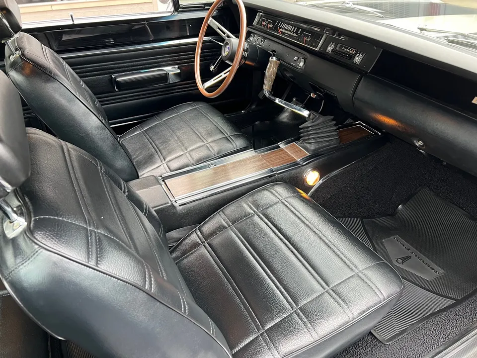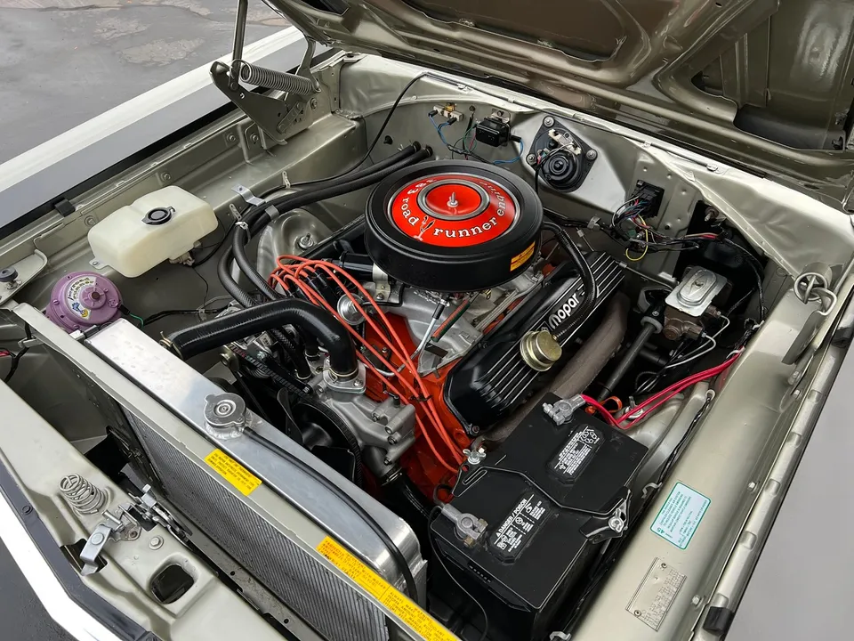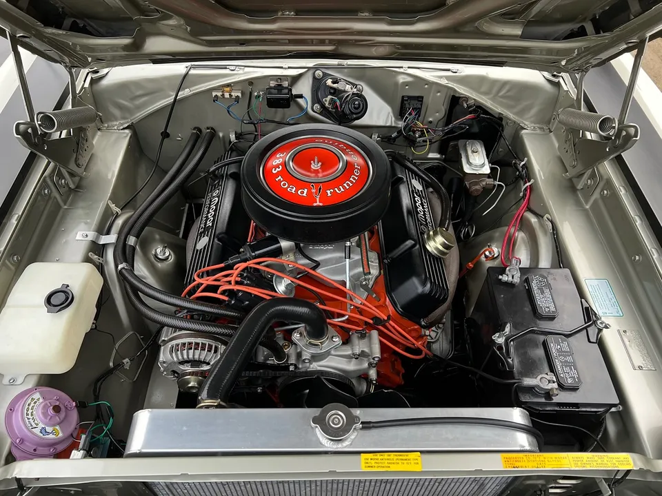 1900 miles on Nut-N-Bolt Rotisserie Restoration, clean original Oklahoma car, True (RM) Road Runner, factory (A) silver metallic, factory black vinyl top, factory black vinyl interior, matching numbers 383 ci engine, 4 bbl, Mopar Performance aluminum intake, factory exhaust manifolds, factory air cleaner, Mopar Performance valve covers, aluminum water pump, aluminum radiator, matching numbers 4 speed manual transmission, factory bucket seats with console, Pistol Grip shifter, factory dash & gauges, am radio, Dynomax dual exhaust with chrome tips, factory 8 ¾ 3.55 Sure Grip rear end, 275/60R15 BF Goodrich Radial TA rear tires, 225/70R15 fronts, 15” Magnum 500 wheels, factory jack with spare, original temp tag, original Broadcast Sheet, Beep! Beep!IN STOCK