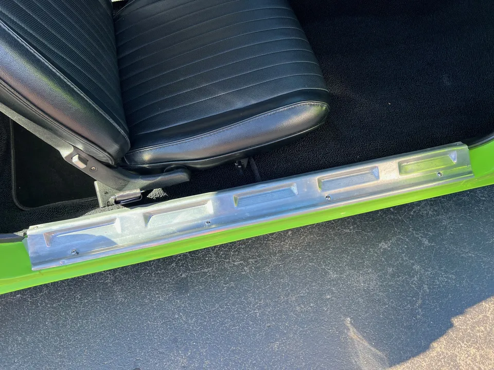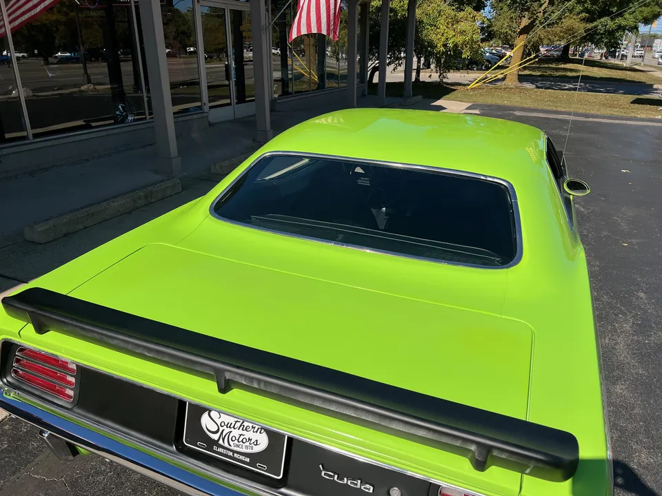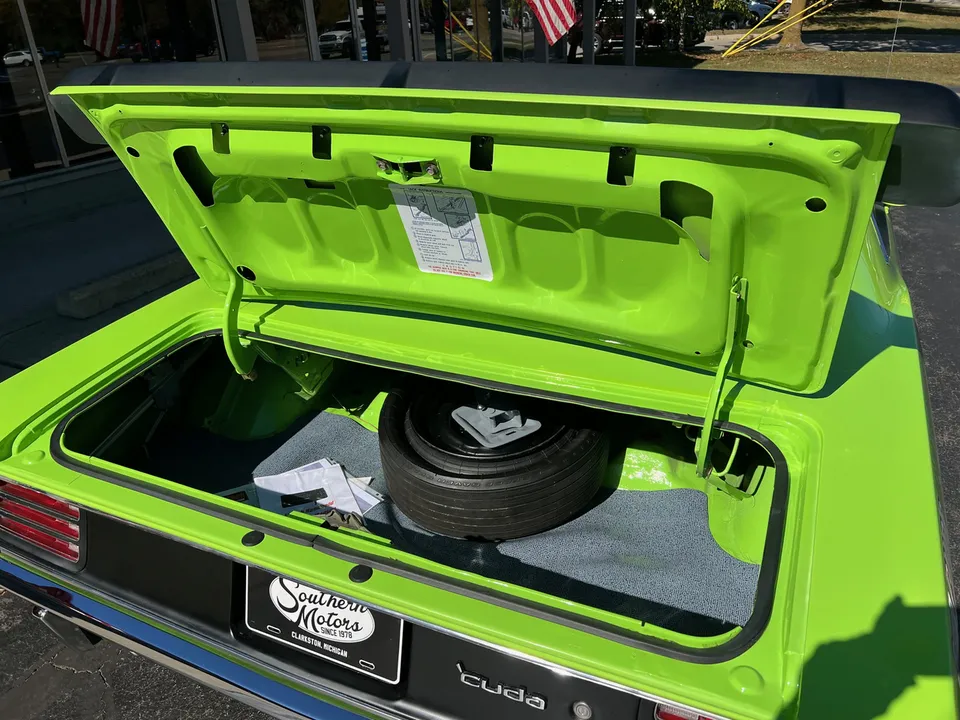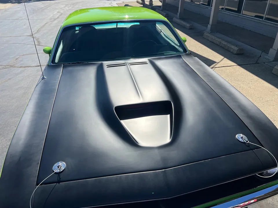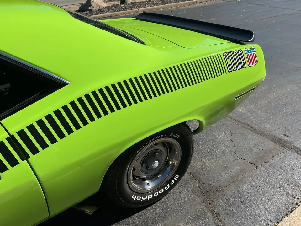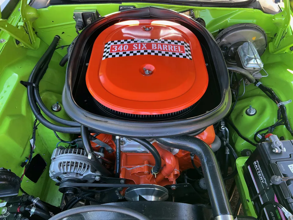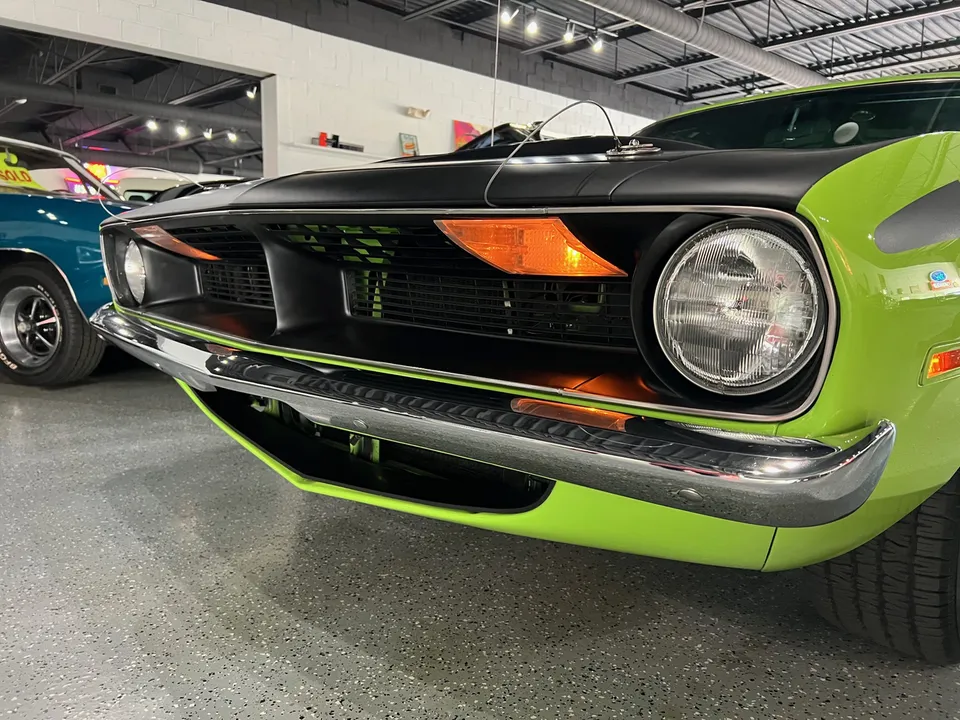 Clean Georgia car, Recent Body-Up Restoration, AAR tribute, beautiful Hi-Impact Limelight green paint, black vinyl interior, 340 ci engine, Fi-Tech Six Pack EFI kit, Edelbrock aluminum intake, Hooker headers, Six Pack air cleaner, power steering, power front disc brakes, 727 Torqueflite automatic transmission, bucket seats with center console, Rally dash with tach & gauges, Kenwood sound system, remote driver’s mirror, Flowmaster T/A exhaust with chrome tips, 8 ¾ 3.55 Sure Grip rear axle, factory jack with space-saver spare, 255/60R15 BF Goodrich Radial T/A rear tires, 225/60R15 fronts, 15” Rally wheels, T/A fiberglass hood with pins, rear deck spoiler, Mopar Muscle!