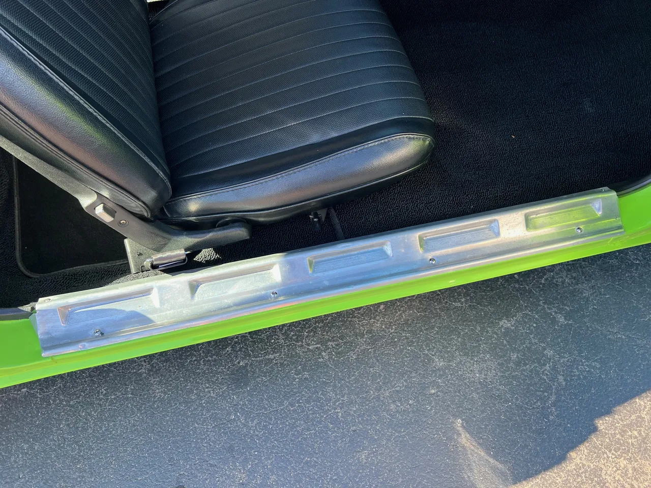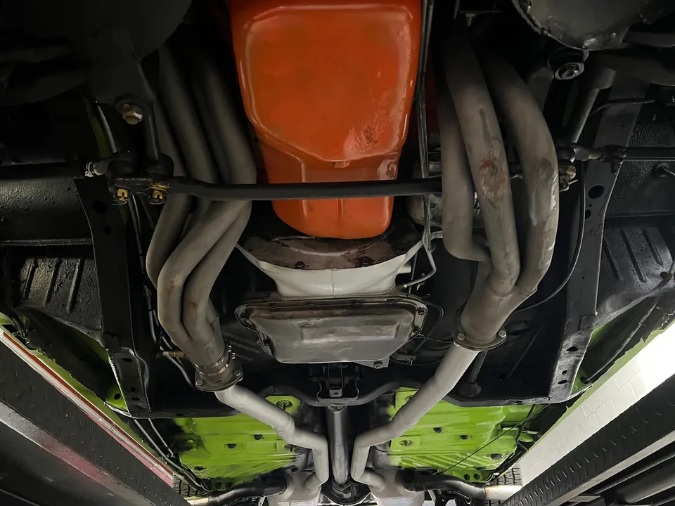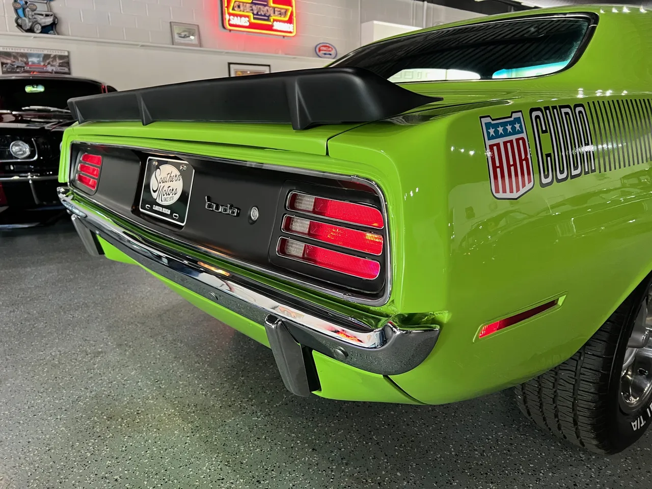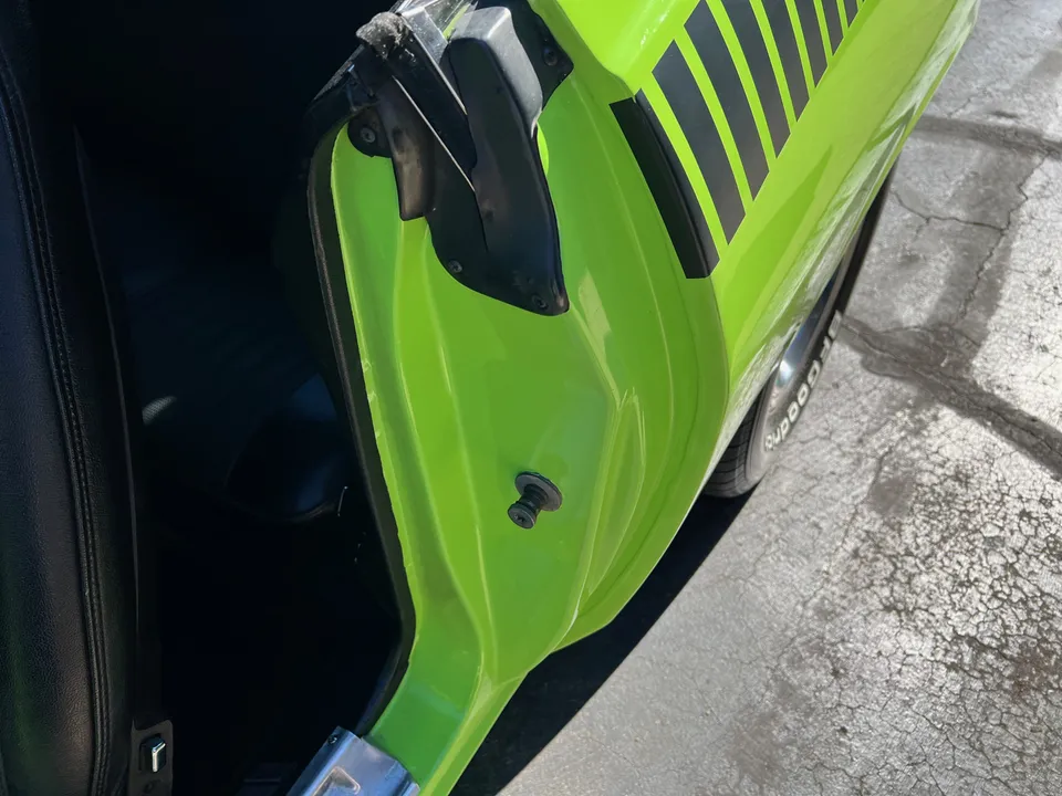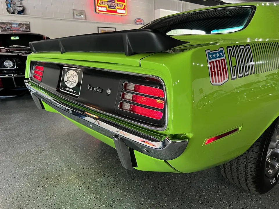 Clean Georgia car, Recent Body-Up Restoration, AAR tribute, beautiful Hi-Impact Limelight green paint, black vinyl interior, 340 ci engine, Fi-Tech Six Pack EFI kit, Edelbrock aluminum intake, Hooker headers, Six Pack air cleaner, power steering, power front disc brakes, 727 Torqueflite automatic transmission, bucket seats with center console, Rally dash with tach & gauges, Kenwood sound system, remote driver’s mirror, Flowmaster T/A exhaust with chrome tips, 8 ¾ 3.55 Sure Grip rear axle, factory jack with space-saver spare, 255/60R15 BF Goodrich Radial T/A rear tires, 225/60R15 fronts, 15” Rally wheels, T/A fiberglass hood with pins, rear deck spoiler, Mopar Muscle!