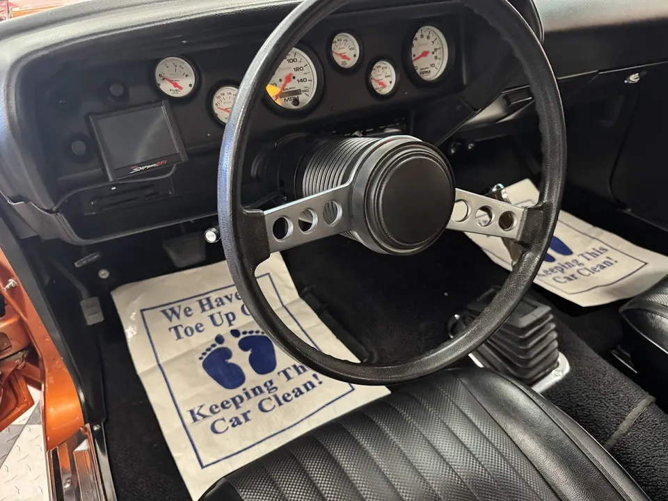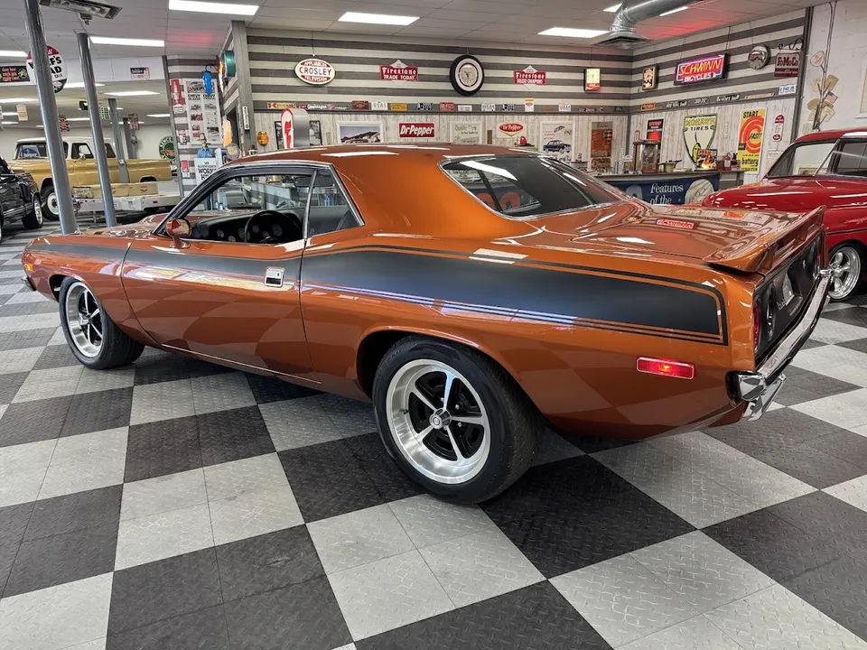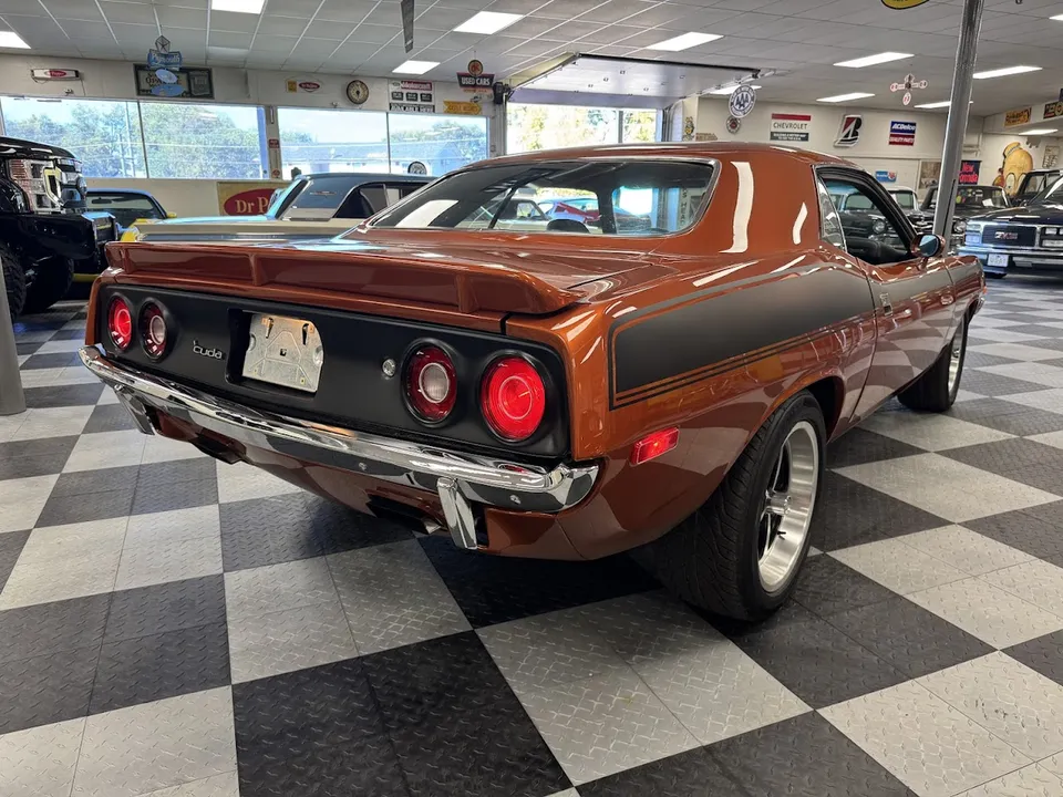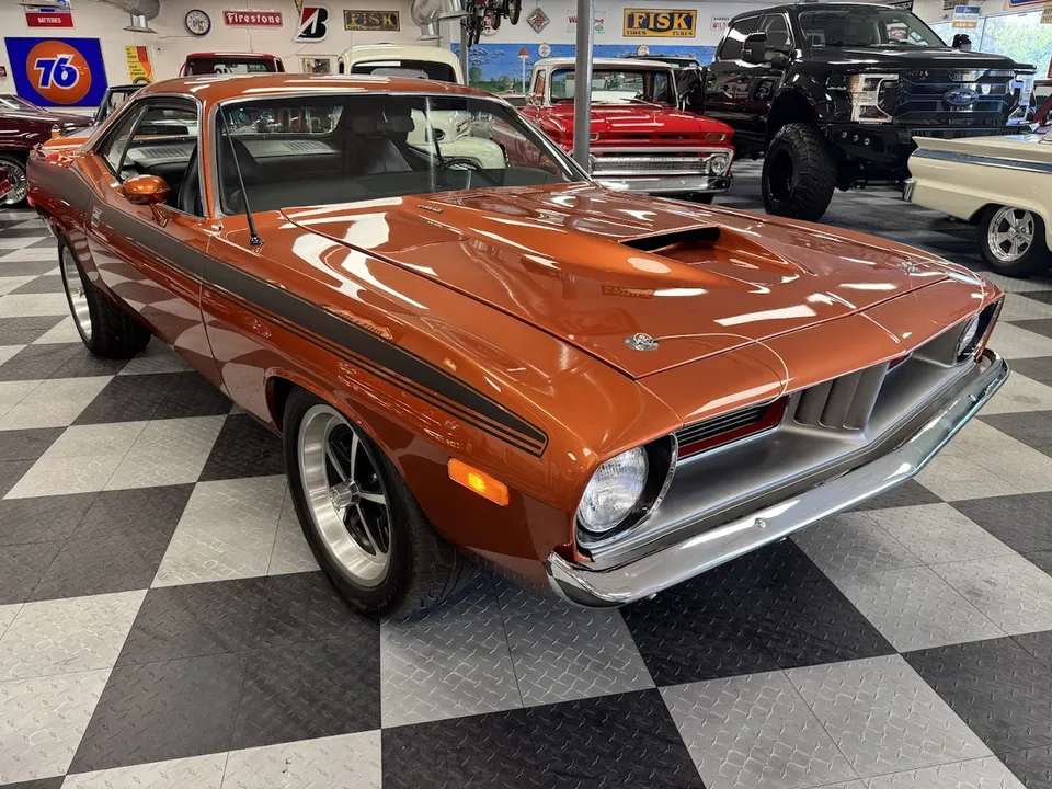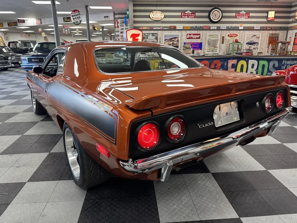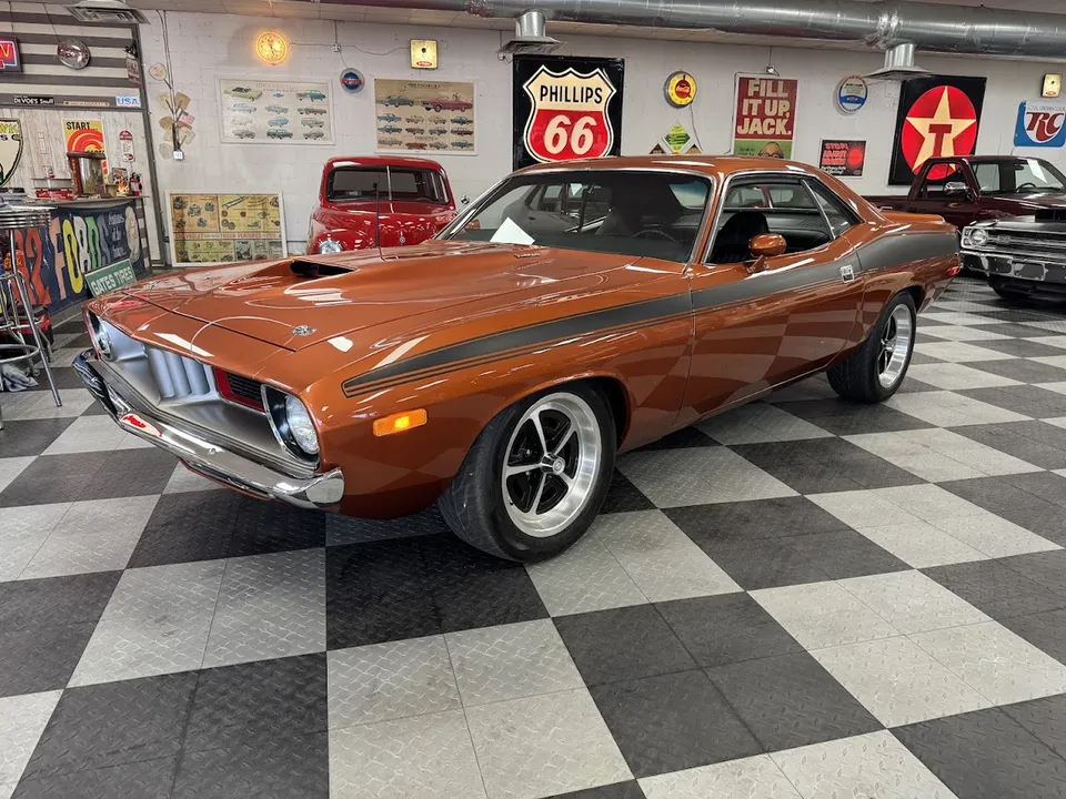 Coming Soon! 1974 Plymouth Barracuda Restomod, beautiful K5 bronze metallic, black vinyl interior, 440 ci engine, Holley Sniper Fuel Injection, Tremec 5 speed manual, aluminum heads, power 4-Wheel Disc Brakes, Borgeson Power steering, Hooker headers, buckets seat interior, Autometer tach & gauges, Rally steering wheel, Pistol Grip shifter, front & rear sway bars, Flowmaster dual exhaust, 8 3/4 Rear w/3:55 Posi, 17” Magnum 500 Wheels, AAR style functional hood, rear spoiler, Mopar Muscle $58,900