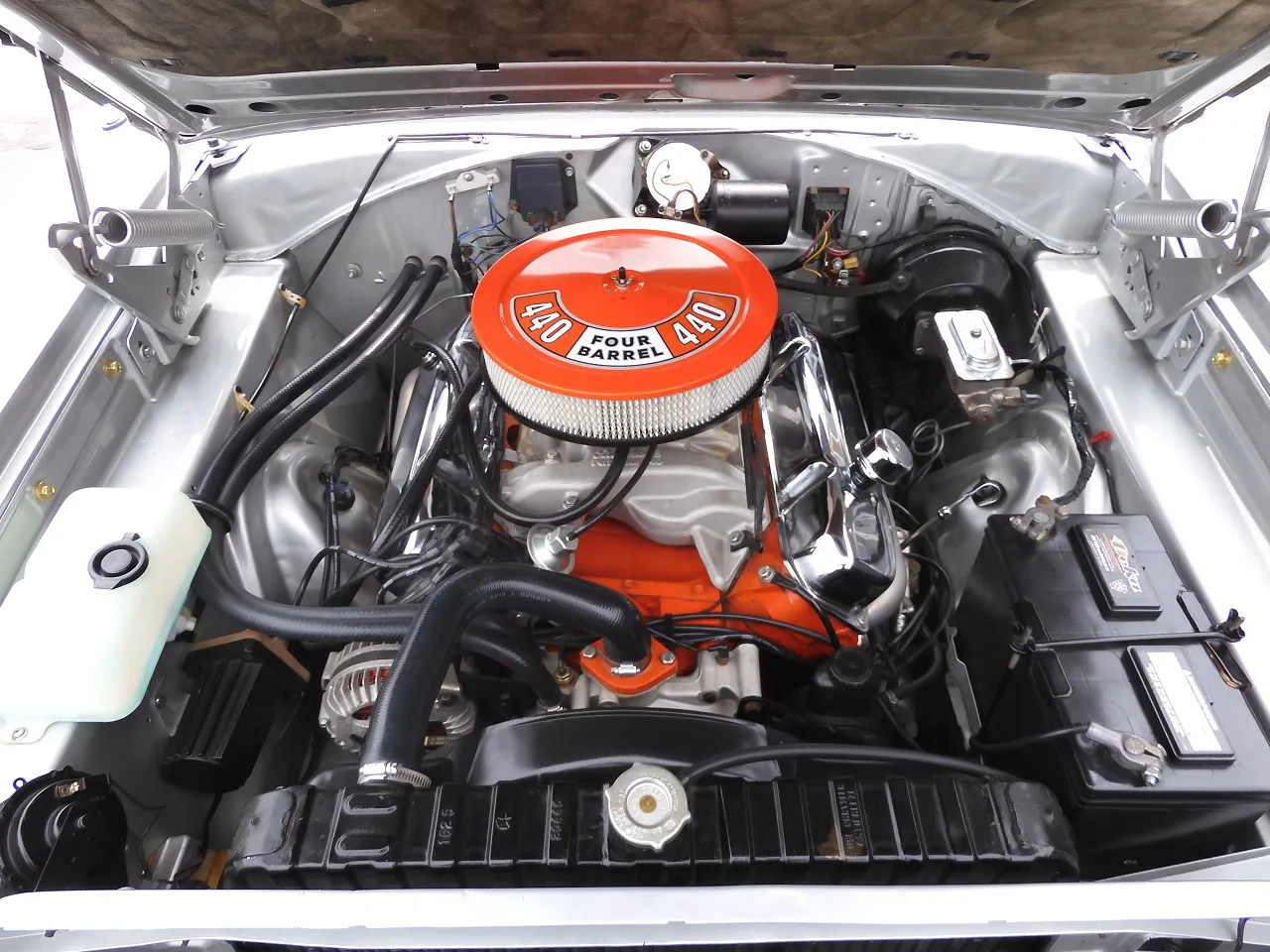 1200 miles on a Complete Body-Up Restoration, True (RS) GTX, beautiful sliver metallic paint, factory black vinyl interior, 68’ date coded 440 ci engine, Edelbrock 750 cfm 4 bbl, Edelbrock Performer 440 aluminum intake, Edelborck Performance Plus camshaft, Hooker ceramic headers, electronic ignition with Accel coil, Hi-Flo aluminum water pump, power steering, power front disc brakes, Mopar radiator with shroud, 727 Torqueflite automatic transmission, bucket seats with console, factory dash, wood wheel, Pioneer am-fm radio, H pipe Flowmaster dual exhaust with correct chrome tips, Dana 60 3.54 Sure Grip rear end, 245/60R15 Cooper rear tires, 215/65R15 fronts, 15” Magnum 500 wheels, factory jack with spare, Mopar Muscle!IN STOCK