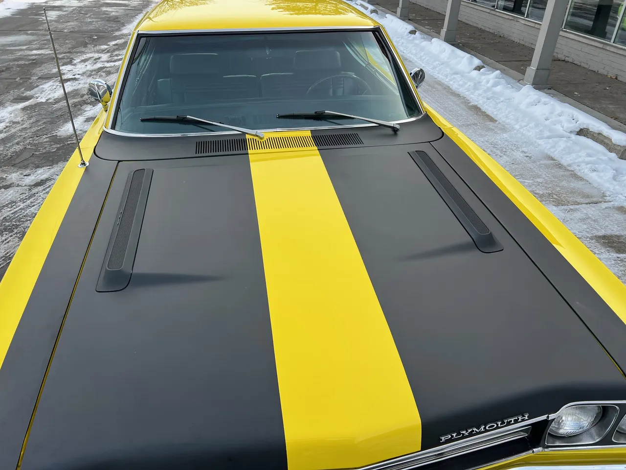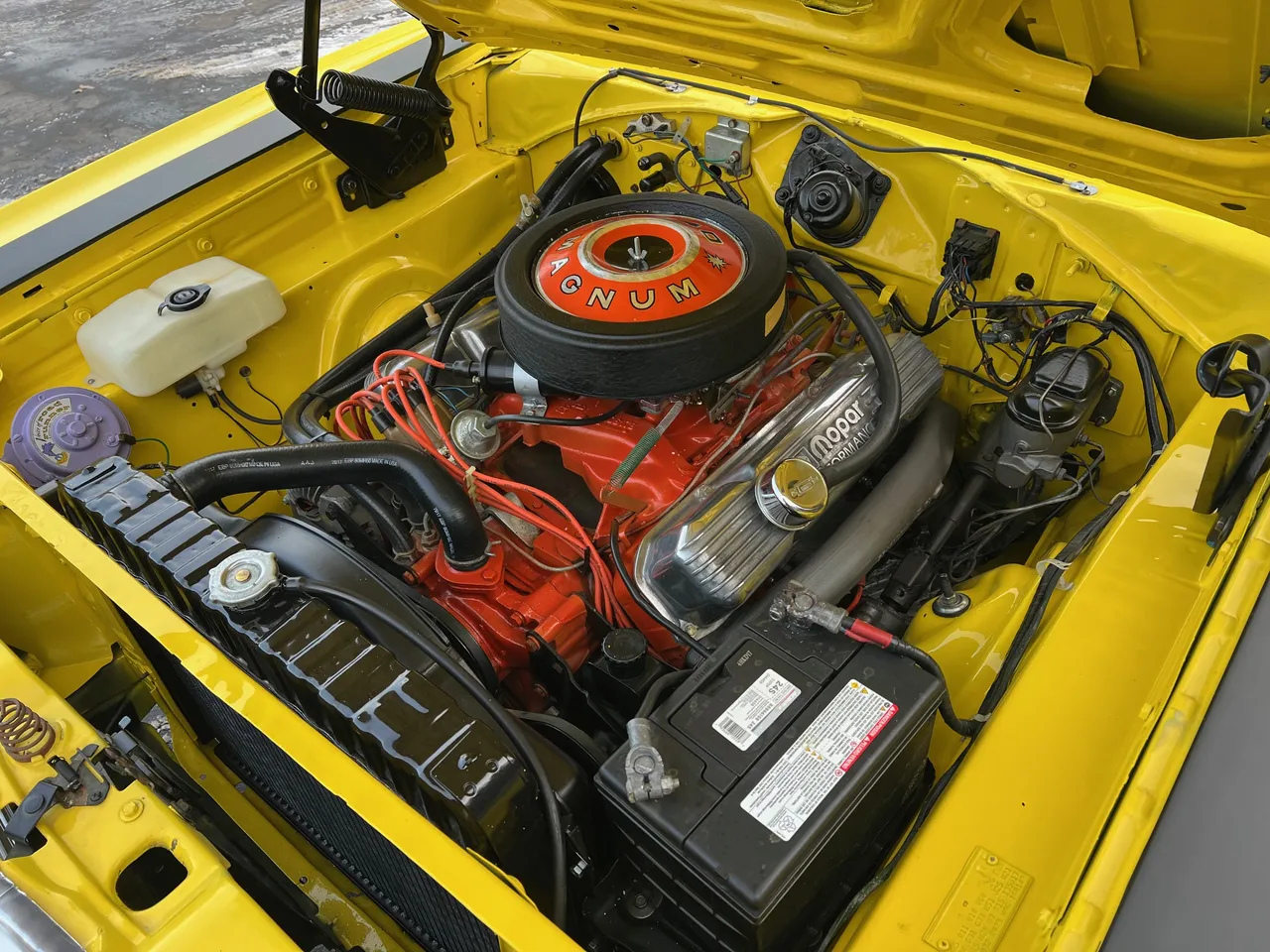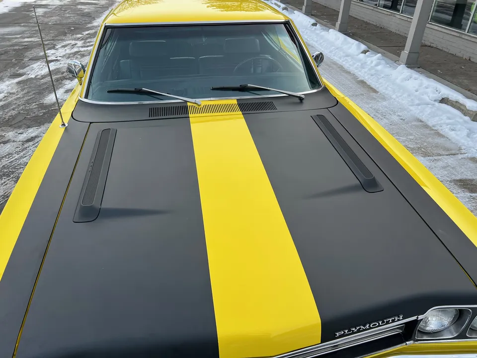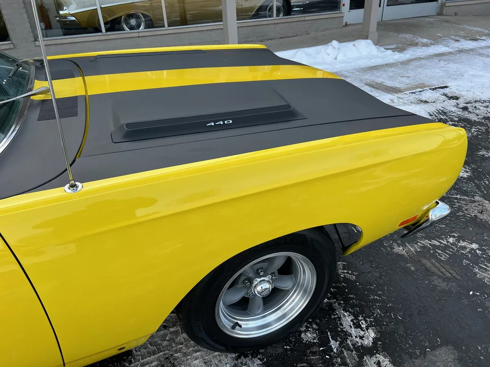 Recent Body-Up Restoration, True (RM) Road Runner, beautiful Competition yellow paint, black vinyl interior, black performance hood striping, mild built 440 ci engine, Edelbrock 4 bbl, factory intake & exhaust manifolds, electronic ignition, factory air cleaner, Mopar Performance aluminum valve covers, power steering, 727 Torqueflite automatic transmission, factory bench seat, factory steering wheel, factory tach & gauges (aftermarket under dash), factory am-fm radio, dual exhaust, factory 8 ¾ 3.23 rear axle, 275/60R15 rear tires, 215/65R15 fronts, 15” American Racing Torque Thrust D wheels, dual chrome mirrors, Mopar Muscle, Beep! Beep!