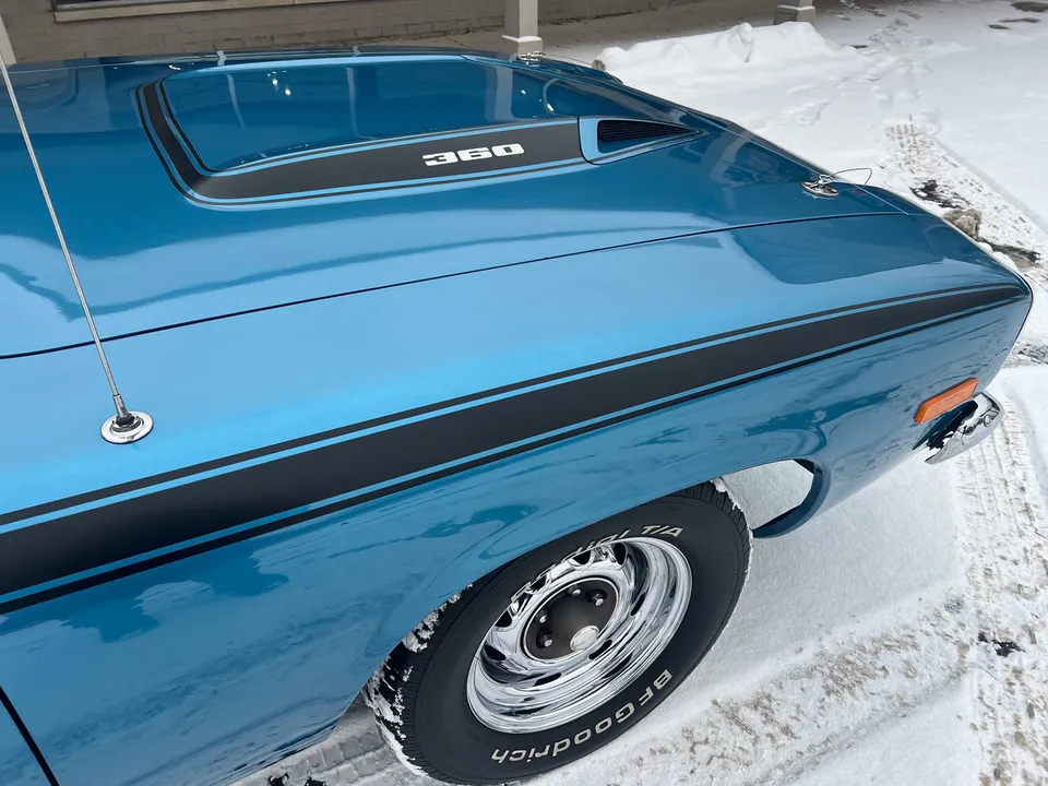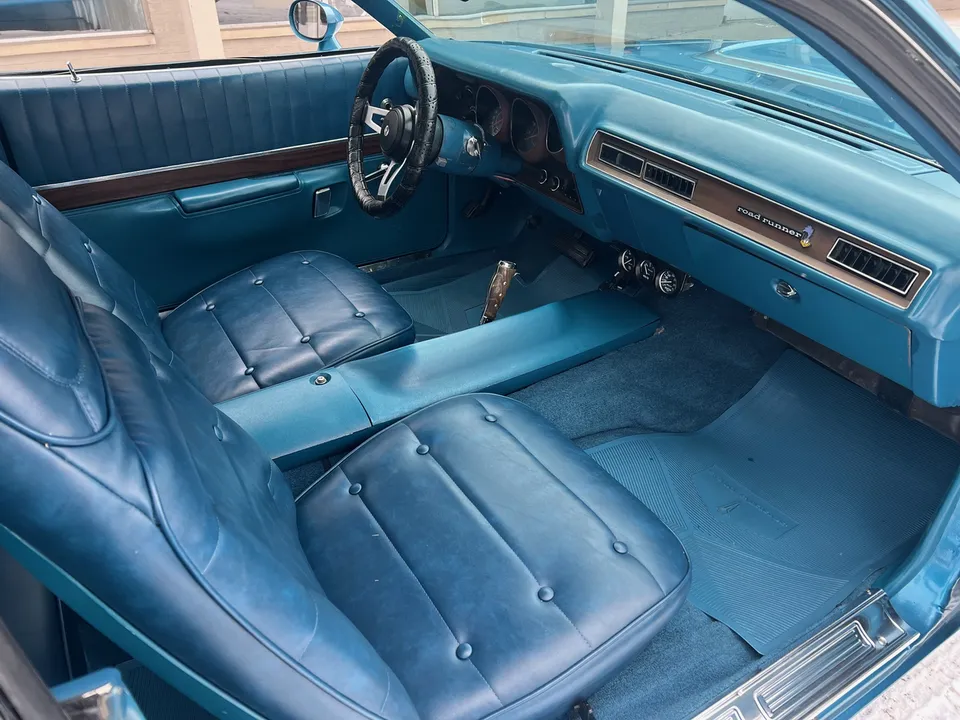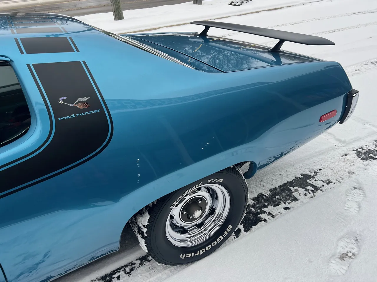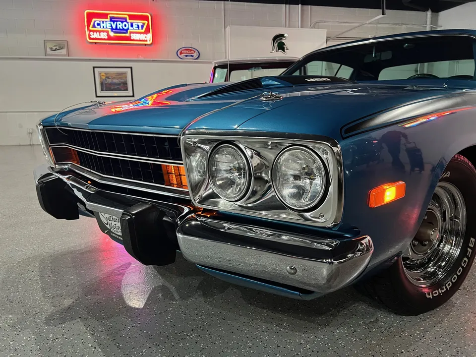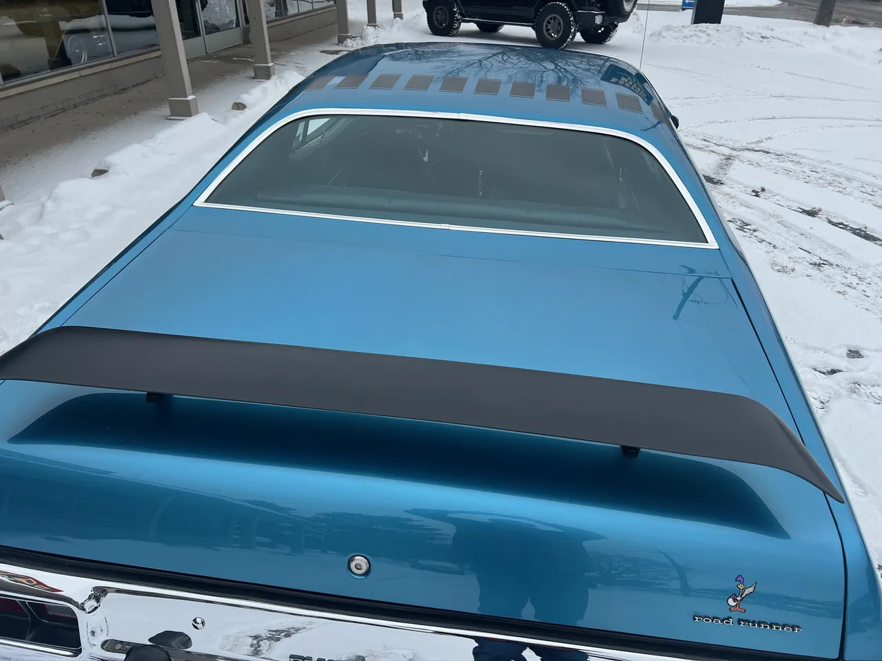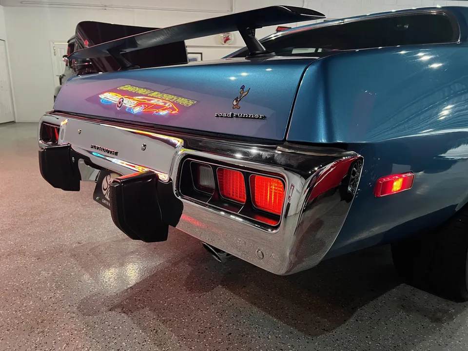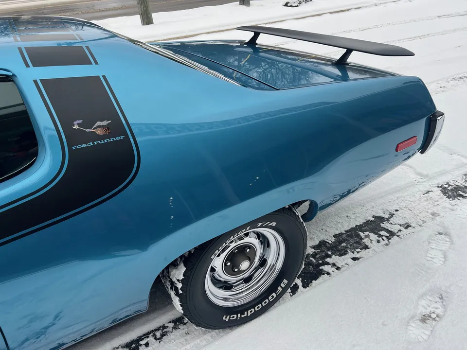 True (RM) Road Runner, factory B5 blue metallic, factory B6 blue vinyl interior, 74’ date coded 360 ci enginge, Demon 4 bbl, Mopar Performance aluminum intake, Doug’s ceramic headers, K&N filter top air cleaner, Mopar Performance valve covers, electronic ignition, March billet pulley’s & brackets, power steering, power front disc brakes, factory air conditioning, aluminum radiator with dual electric fans, 727 Torqueflite automatic transmission, factory bucket seats with center console, Pistol Grip shifter, Tuff wheel, factory Rally dash, Audiosounds radio, remote driver’s mirror, H-pipe dual exhaust with machine gun tips, 8 ¾ 3.23 rear axle with sway bar, 295/60R15 BF Goodrich Radial T/A rear tires, 245/60R15 fronts, 15” chrome Rally wheels, factor Power Bulge hood, Go Wing, hood pins, Mopar Muscle!