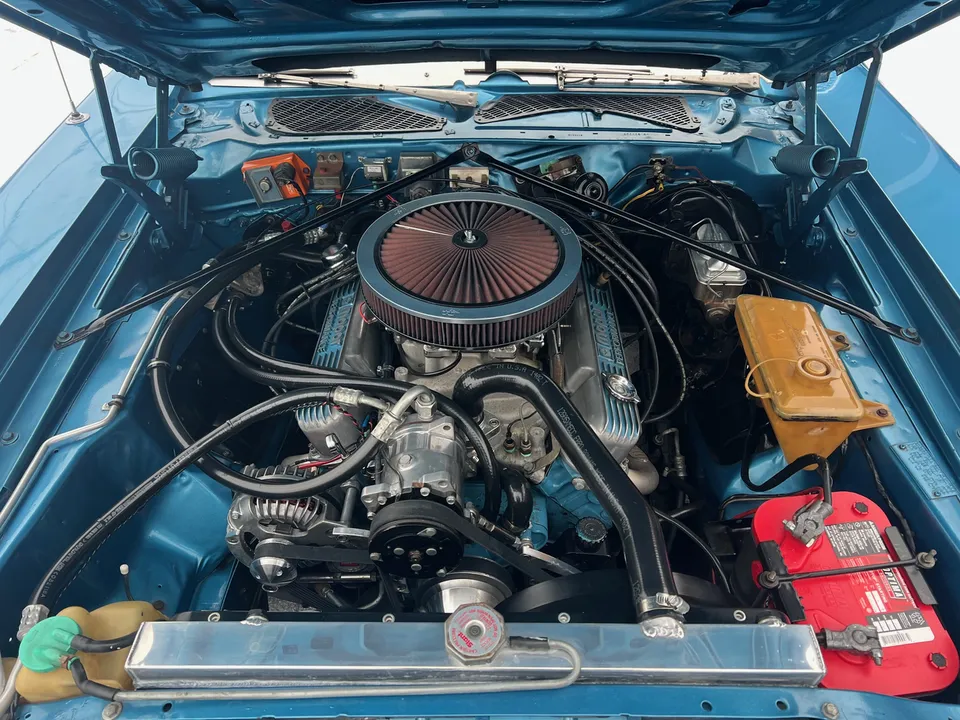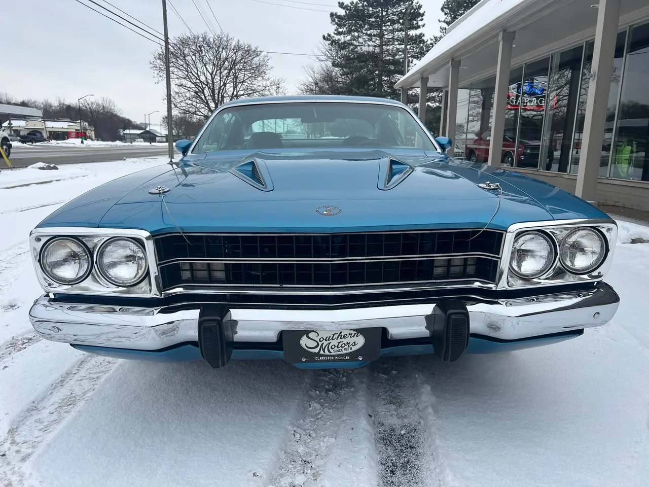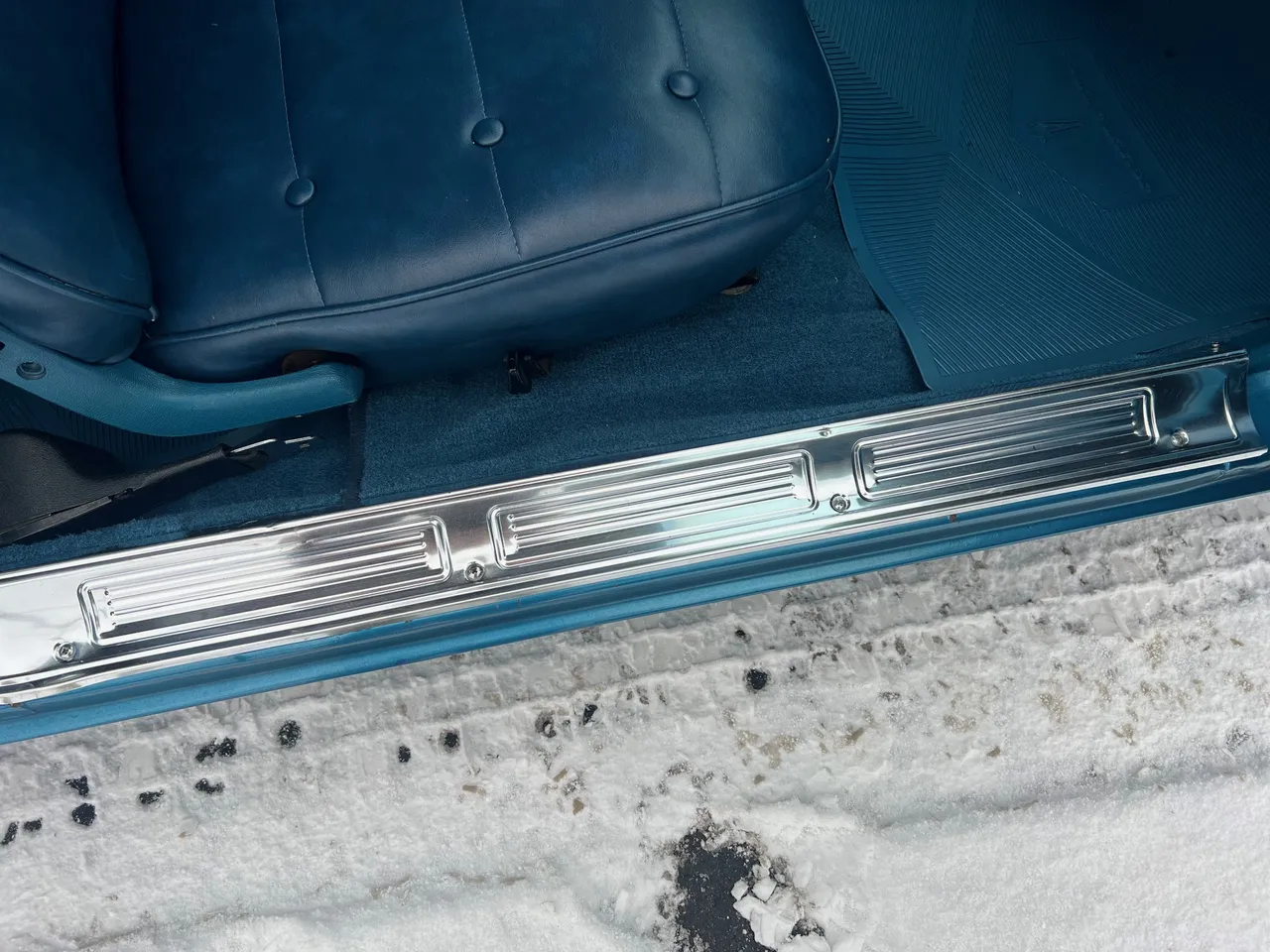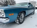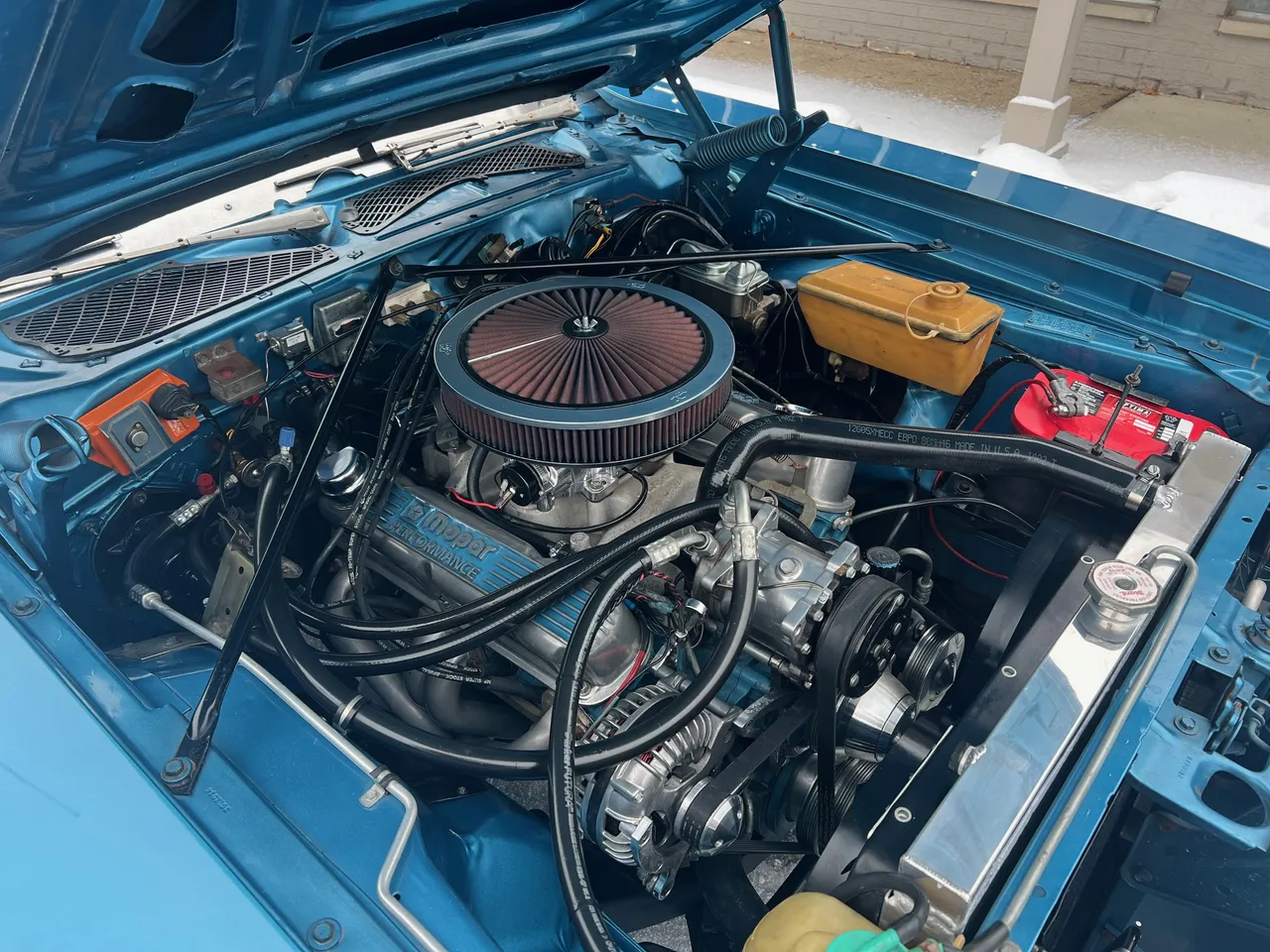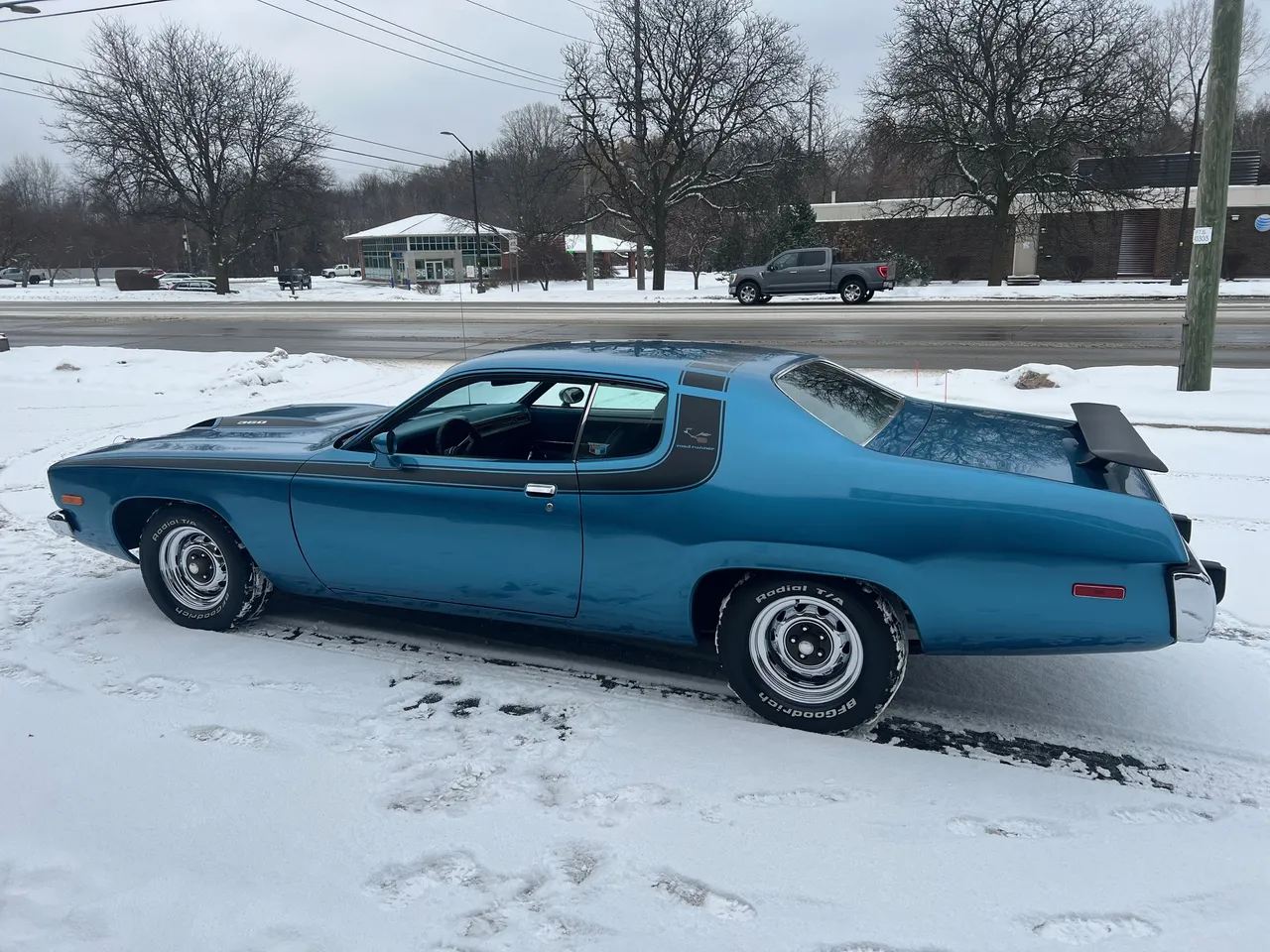 True (RM) Road Runner, factory B5 blue metallic, factory B6 blue vinyl interior, 74’ date coded 360 ci enginge, Demon 4 bbl, Mopar Performance aluminum intake, Doug’s ceramic headers, K&N filter top air cleaner, Mopar Performance valve covers, electronic ignition, March billet pulley’s & brackets, power steering, power front disc brakes, factory air conditioning, aluminum radiator with dual electric fans, 727 Torqueflite automatic transmission, factory bucket seats with center console, Pistol Grip shifter, Tuff wheel, factory Rally dash, Audiosounds radio, remote driver’s mirror, H-pipe dual exhaust with machine gun tips, 8 ¾ 3.23 rear axle with sway bar, 295/60R15 BF Goodrich Radial T/A rear tires, 245/60R15 fronts, 15” chrome Rally wheels, factor Power Bulge hood, Go Wing, hood pins, Mopar Muscle!