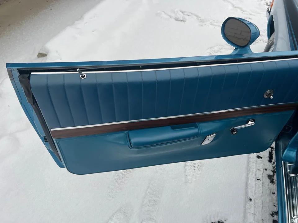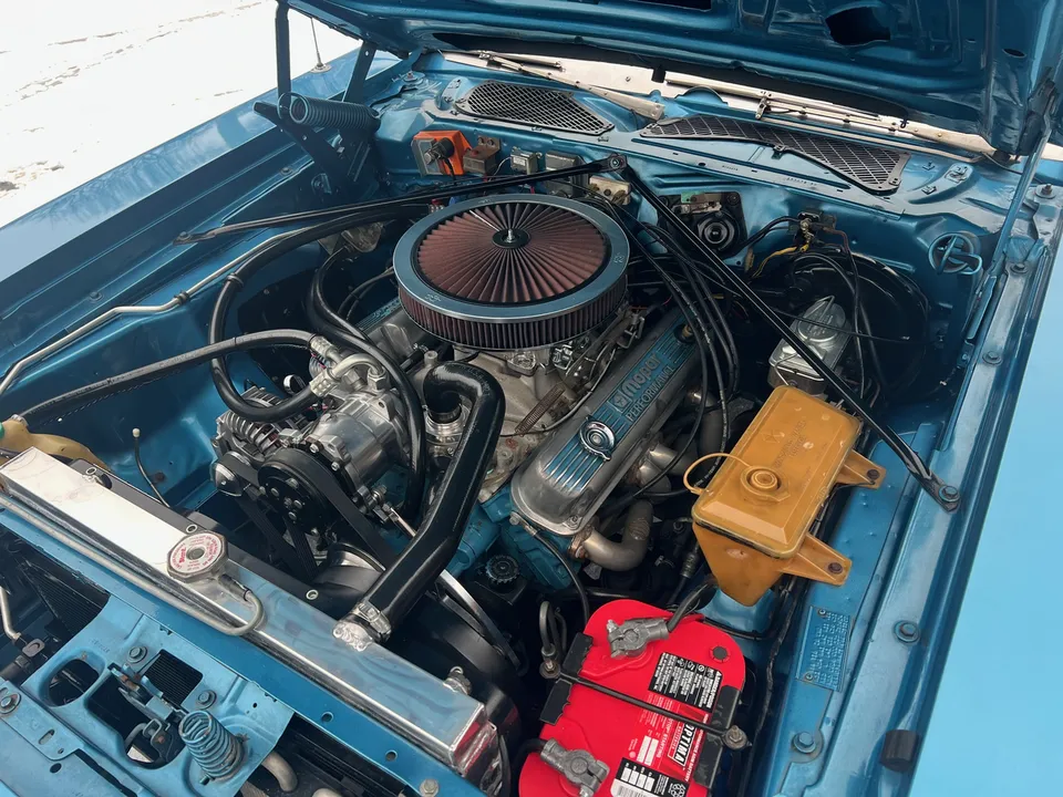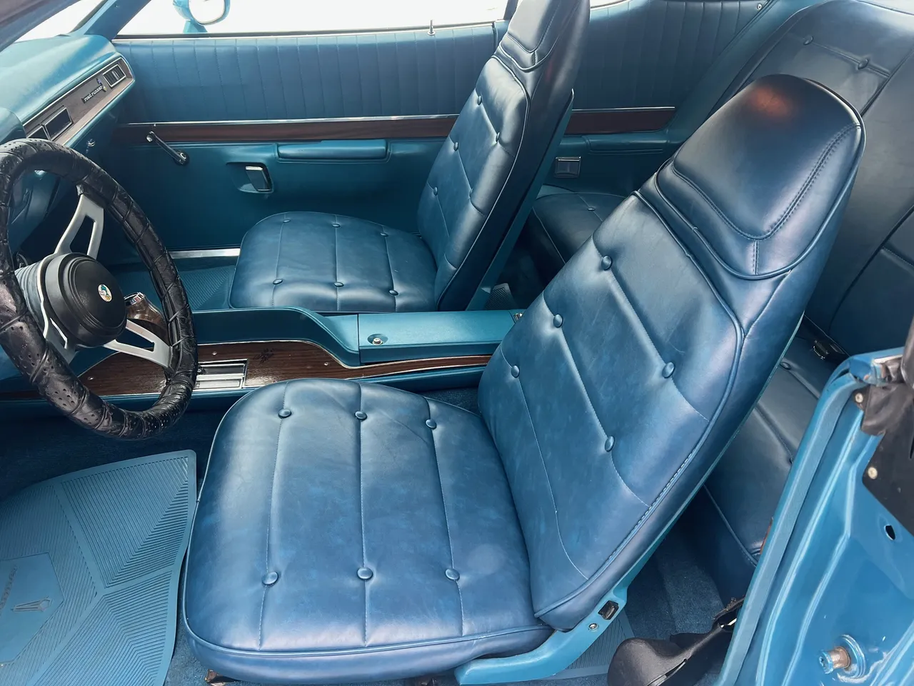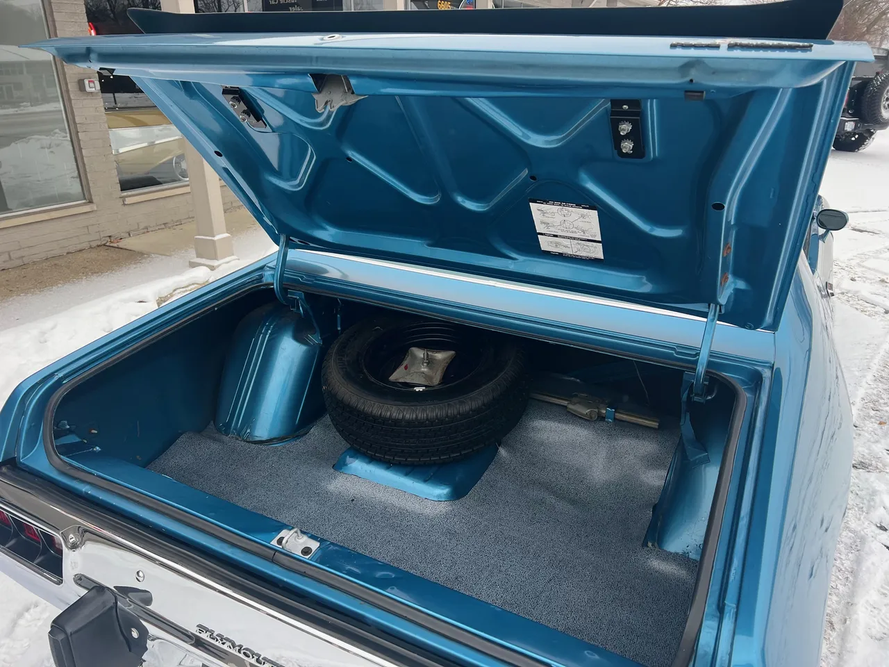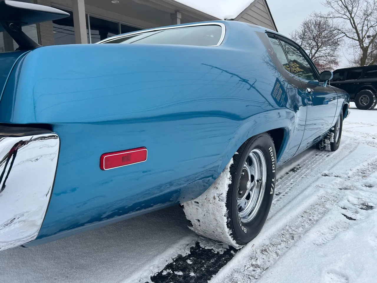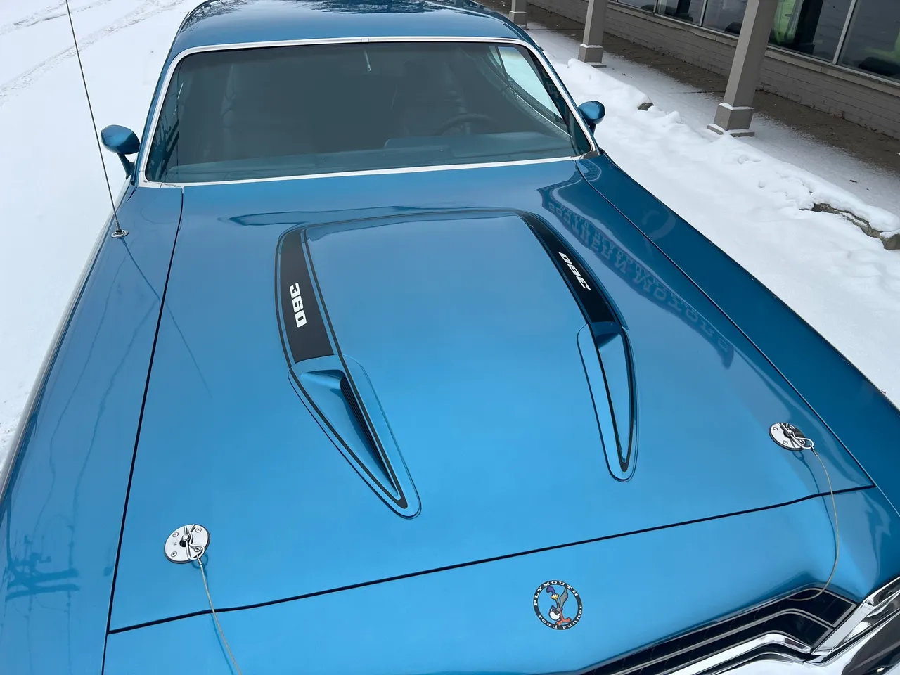 True (RM) Road Runner, factory B5 blue metallic, factory B6 blue vinyl interior, 74’ date coded 360 ci enginge, Demon 4 bbl, Mopar Performance aluminum intake, Doug’s ceramic headers, K&N filter top air cleaner, Mopar Performance valve covers, electronic ignition, March billet pulley’s & brackets, power steering, power front disc brakes, factory air conditioning, aluminum radiator with dual electric fans, 727 Torqueflite automatic transmission, factory bucket seats with center console, Pistol Grip shifter, Tuff wheel, factory Rally dash, Audiosounds radio, remote driver’s mirror, H-pipe dual exhaust with machine gun tips, 8 ¾ 3.23 rear axle with sway bar, 295/60R15 BF Goodrich Radial T/A rear tires, 245/60R15 fronts, 15” chrome Rally wheels, factor Power Bulge hood, Go Wing, hood pins, Mopar Muscle!