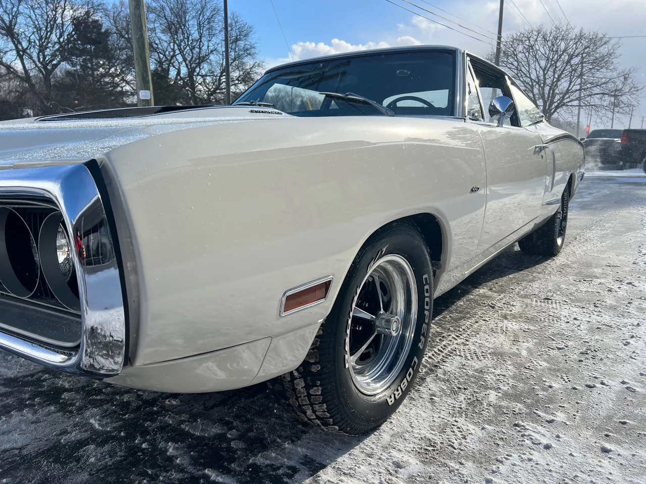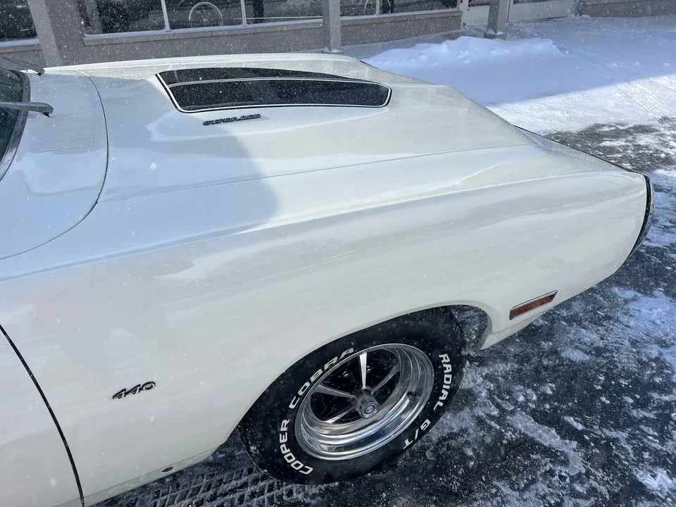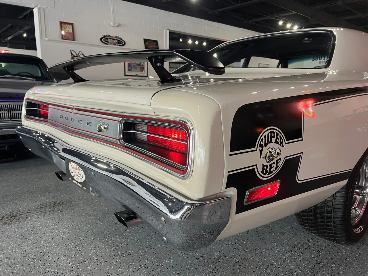 True (WM) Super Bee, clean Georgia car, Recent Body-Up Restoration, beautiful factory (W1) white car, black Bee striping, factory (X9) black vinyl interior, mild build 440 ci engine, factory (D21) 4 speed manual transmission, 650 Edelbrock 4 bbl, factory intake & exhaust manifolds, electronic ignition, dual snorkel air cleaner, factory valve covers, power steering, Wilwood front disc brakes, aluminum radiator, factory bench seat, factory Rally dash, original am radio, Hurst Pistol Grip shifter, rear defog, dual exhaust with chrome tips, factory 8 ¾ 3,23 Sure Grip with rear sway bar, 295/60R15 Cooper rear tires, 245/60R15 fronts, 15X8 billet Magnum 500 wheels, rear spoiler, factory jack with spare, Mopar Muscle!