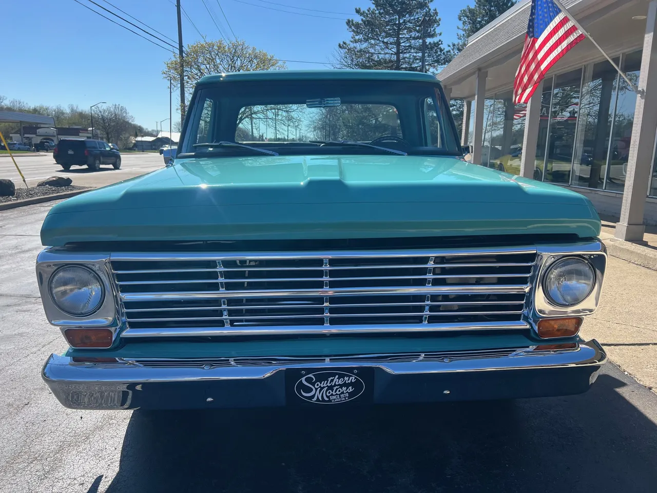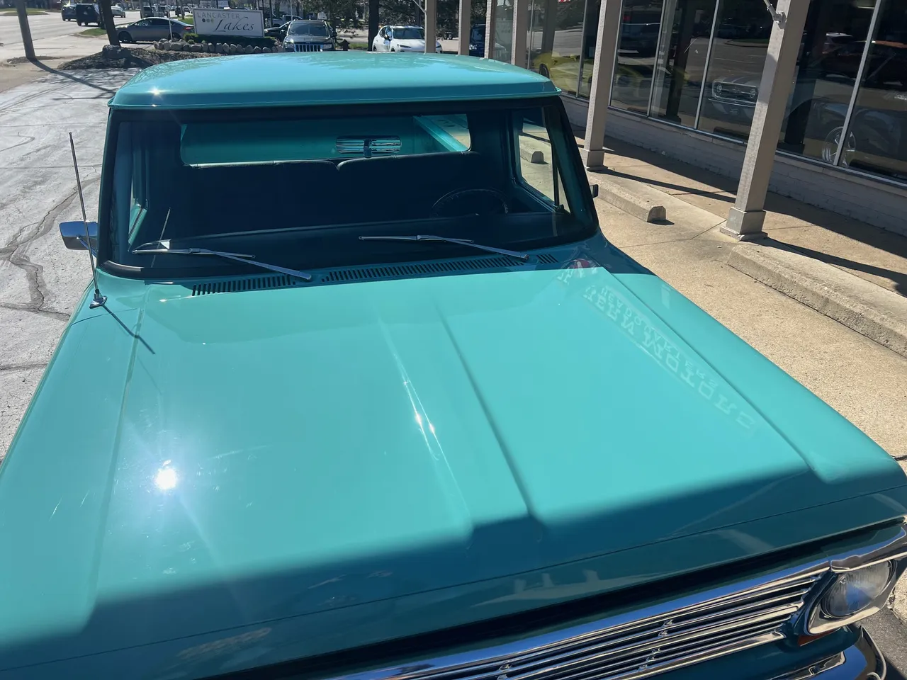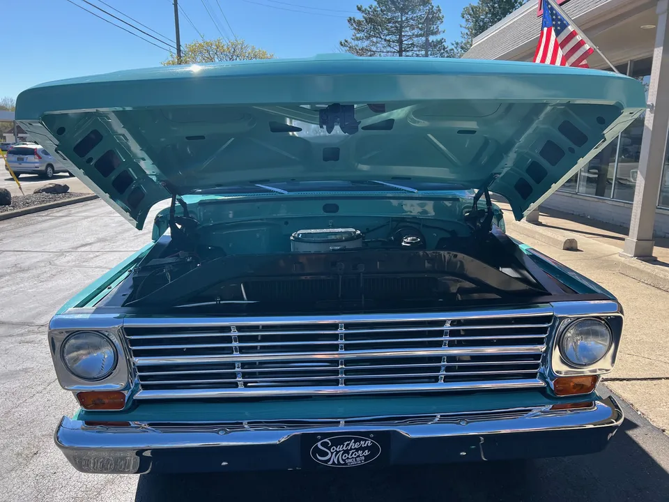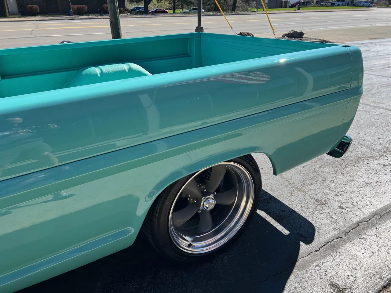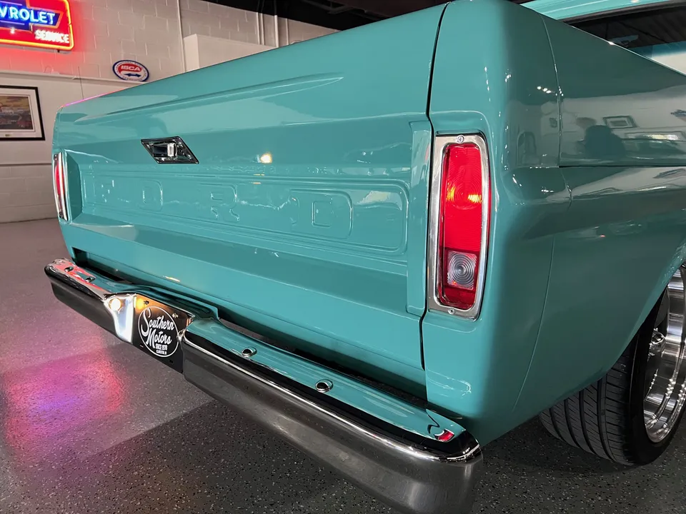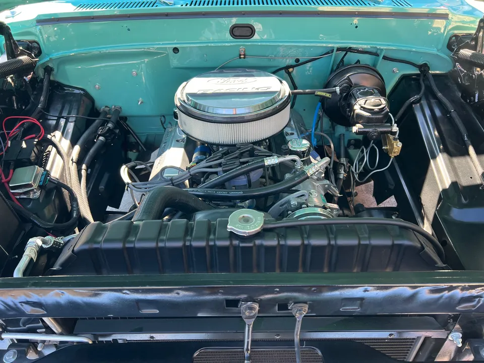 Recent Ground-Up Restored Resto-mod Short Box F100, Clean Texas truck, Show Quality Reef Aqua paint, custom black interior, 302 ci engine, Holley 4 bbl, Edelbrock Performer aluminum intake, mild camshaft, headers, billet air cleaner & valve covers, HEI distributor, Fatman Mustang II IFS with tubular control arms coil-overs, power steering, power front disc brakes, Vintage air conditioning, automatic overdrive transmission, TMI leather seat, tilt column with billet wheel, factory padded dash & gauges, Audiosounds radio, Lokar shifter, dual exhaust, 9” rear axle, rear lowering springs, flip-kit & C-notched frame, 275/40ZR20 rear tires, 245/45ZR20 fronts, 20” American Racing Torque Thrust D wheels, color-matched Rhino lined bed, Carlite glass, dual chrome mirrors, Drive Anywhere!
