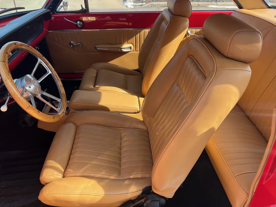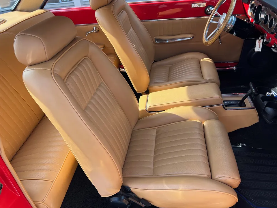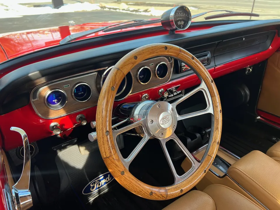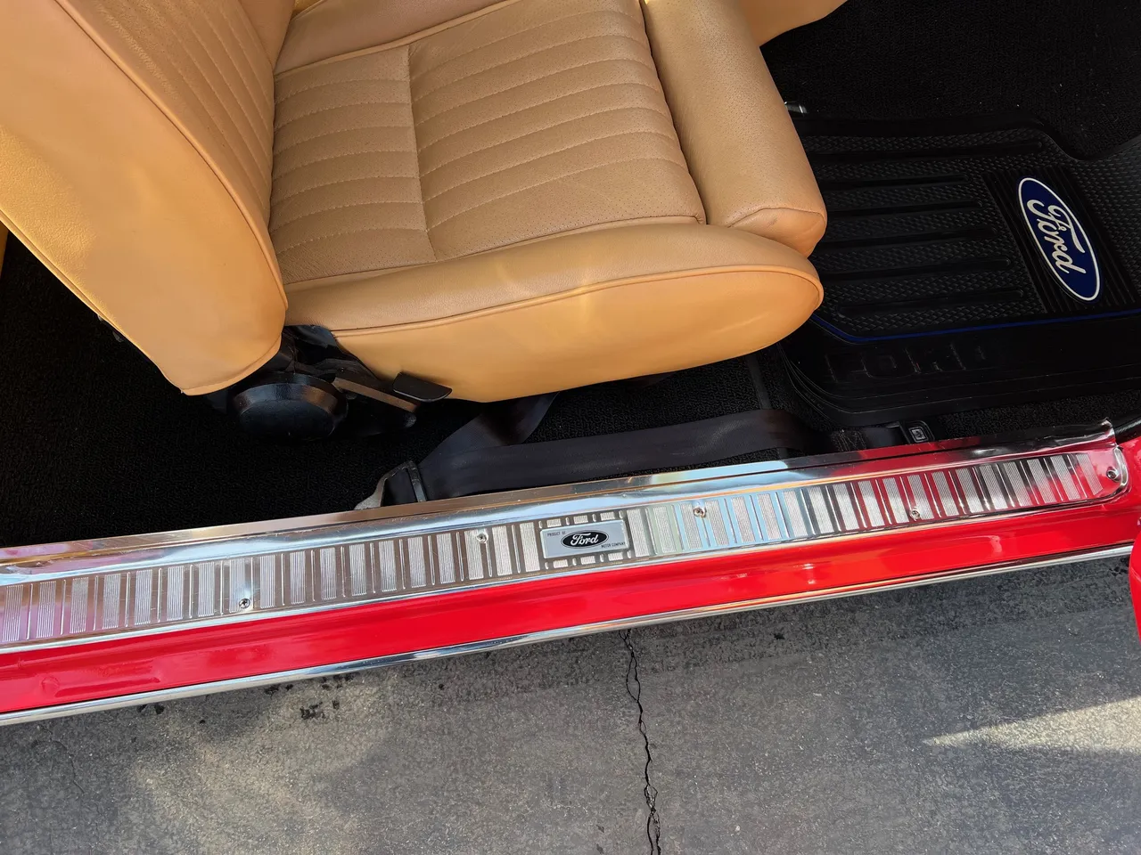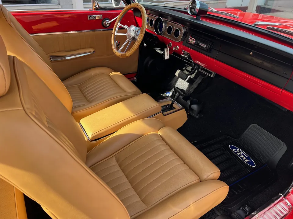Custom Built Restomod, stunning Viper red paint, custom Saddle leather interior, 93’ 302 ci engine, Edelbrock 4 bbl, Edelbrock aluminum intake, headers, chrome air cleaner, Motorsports chrome valve covers, Mallory distributor, power rack & pinion steering, aftermarket front sway bar, power front disc brakes, air conditioning, serpentine pulley system, aluminum radiator with electric fans, automatic overdrive transmission, adjustable bucket seats with center console, tilt column with billet wood wheel, Dakota digital dash, JVC custom sound system with custom kick panel speakers, Flowmaster dual exhaust with chrome tips, Ford 3.50 traction-lock rear axle with traction bars, 245/45ZR17 BF Goodrich GForce Comp 2 rear tires, 215/45R17 fronts, 17” chrome Eagle wheels, finished trunk area, dual chrome mirrors, Drive Anywhere!
