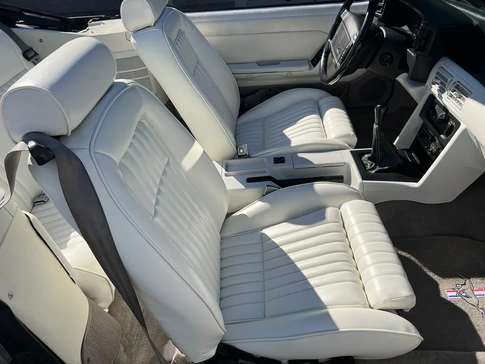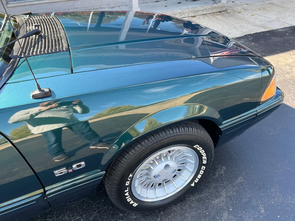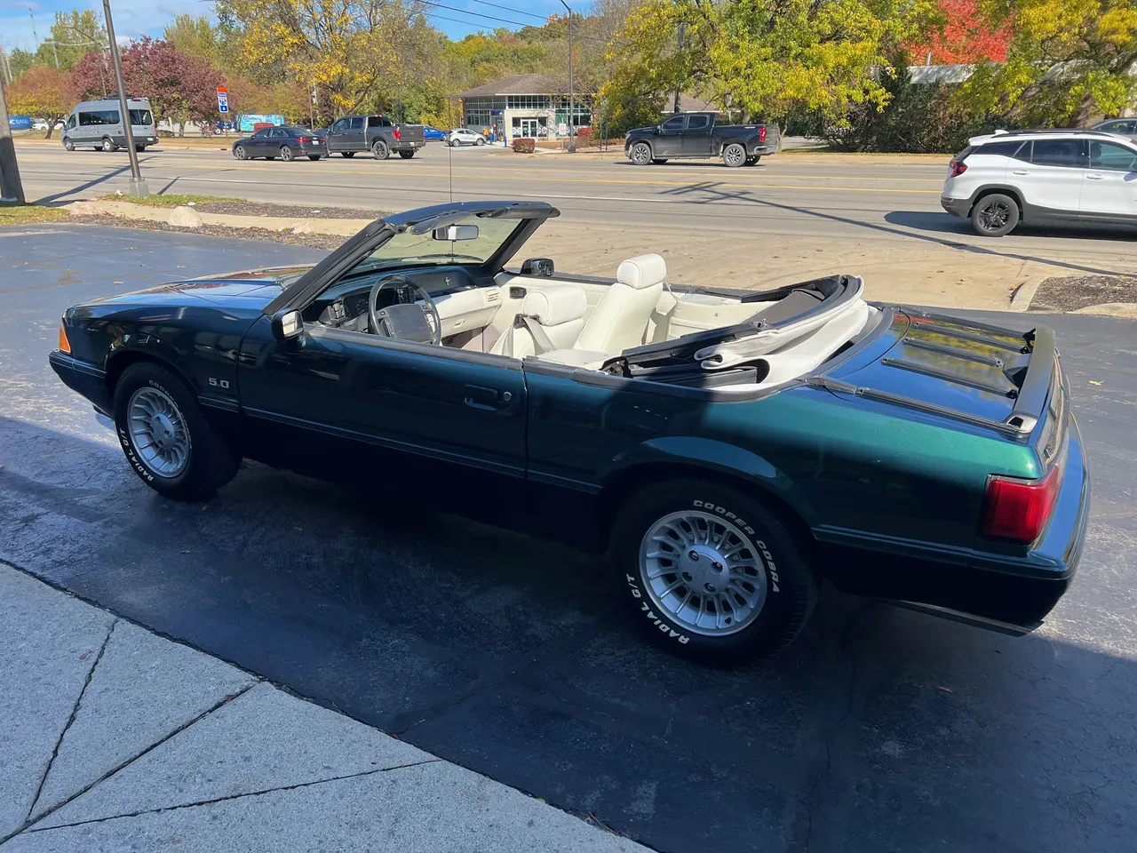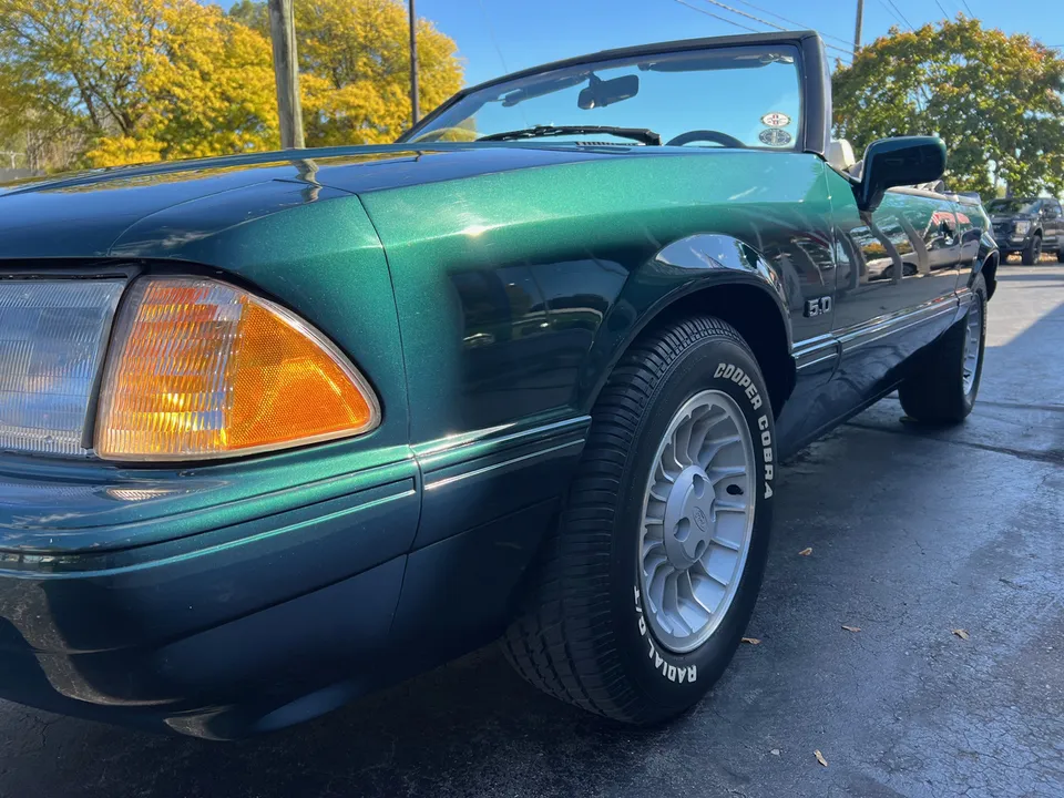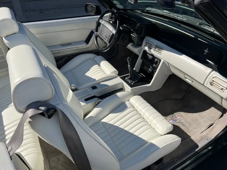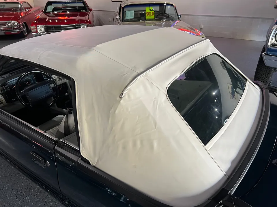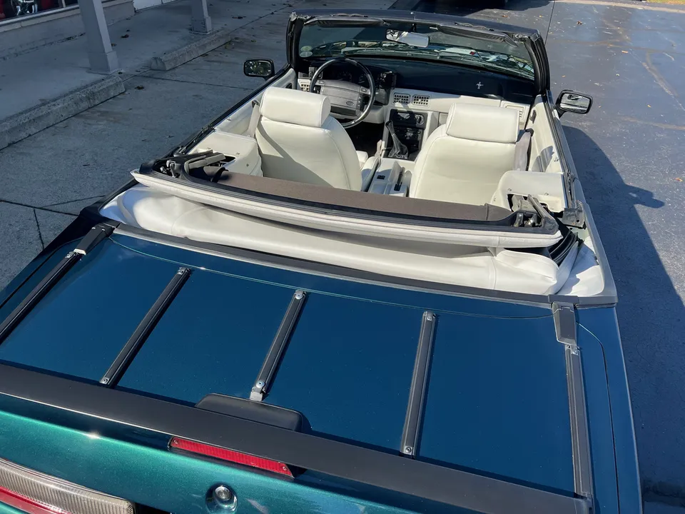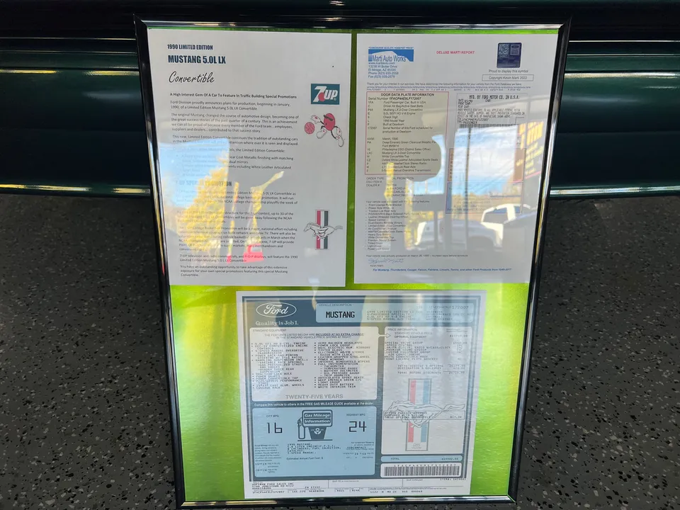 Rare 7UP edition (1 pf 1360 5 speed cars), LX package, factory (PA) Deep Emerald green metallic paint, factory (C2) Oxford white leather interior, factory white convertible top, 5.0-liter HO EFI V8 engine, 5 speed manual, power rack & pinion steering, power disc brakes, factory air conditioning, factory bucket seats with center console, factory tach & gauges, factory premium sound package, power windows-locks-mirrors, cruise control, power lumbar seats, power top, H-pipe Flowmaster dual exhaust with chrome tips, factory handling package with 2.73 traction-lock rear axle, 225/60R15 Cooper tires, factory 15” aluminum wheels, luggage rack, 85,000 original miles, Original Marti Report with documentation, Clean Carfax, Drive Anywhere!