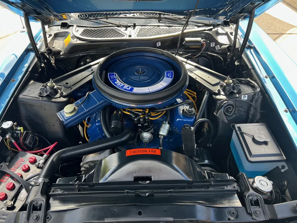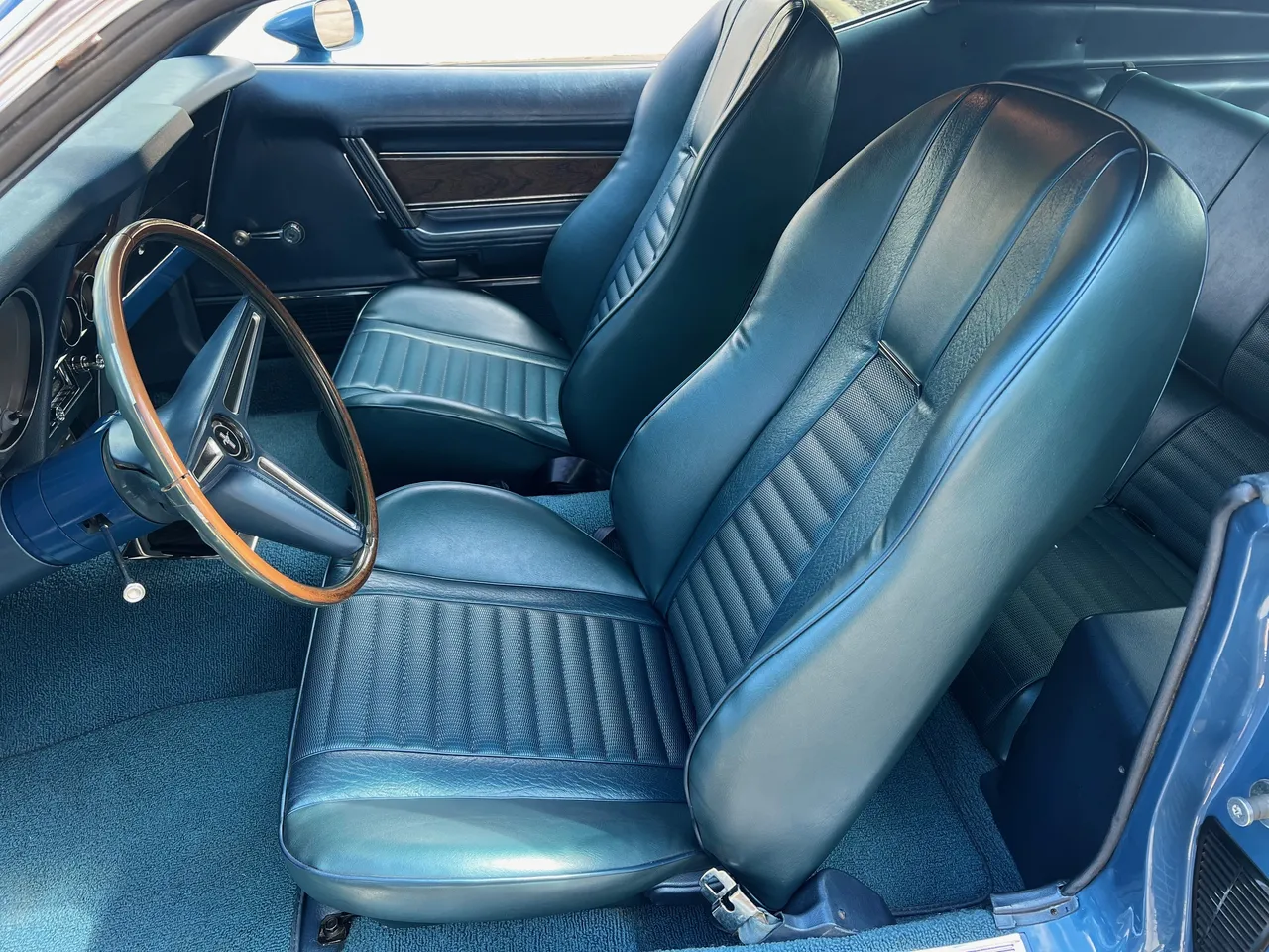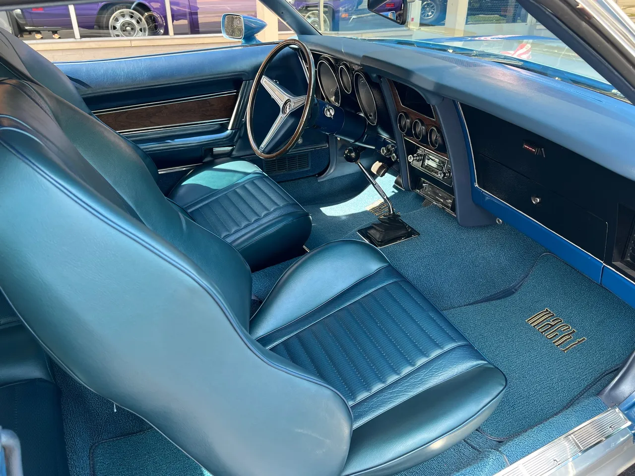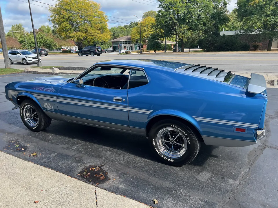 Factory Q code Mach 1 Cobra Jet car with Marti Report, beautiful factory (3J) Bright blue metallic, silver Mach 1 striping, factory (GB) blue vinyl interior, matching numbers 351 ci Cobra Jet engine, factory (5) 4 speed manual transmission, 4 bbl, factory intake manifold, headers, factory air cleaner & valve covers, power steering, power front disc brakes, TMI factory style bolstered bucket seats, Hurst shifter, Rim Blow horn, factory tach & gauges, Retrosounds radio, Flowmaster H pipe dual exhaust, factory 9” 3.50 rear axle with Lakewood traction bars, Scott Drake rear shocks, 255/60R15 BF Goodrich Radial T/A rear tires, 235/60R15 fronts, 15” Magnum 500 wheels, rear window louvers, dual sport mirrors, Ram Air hood, front & rear spoilers, Multiple Show Winner!