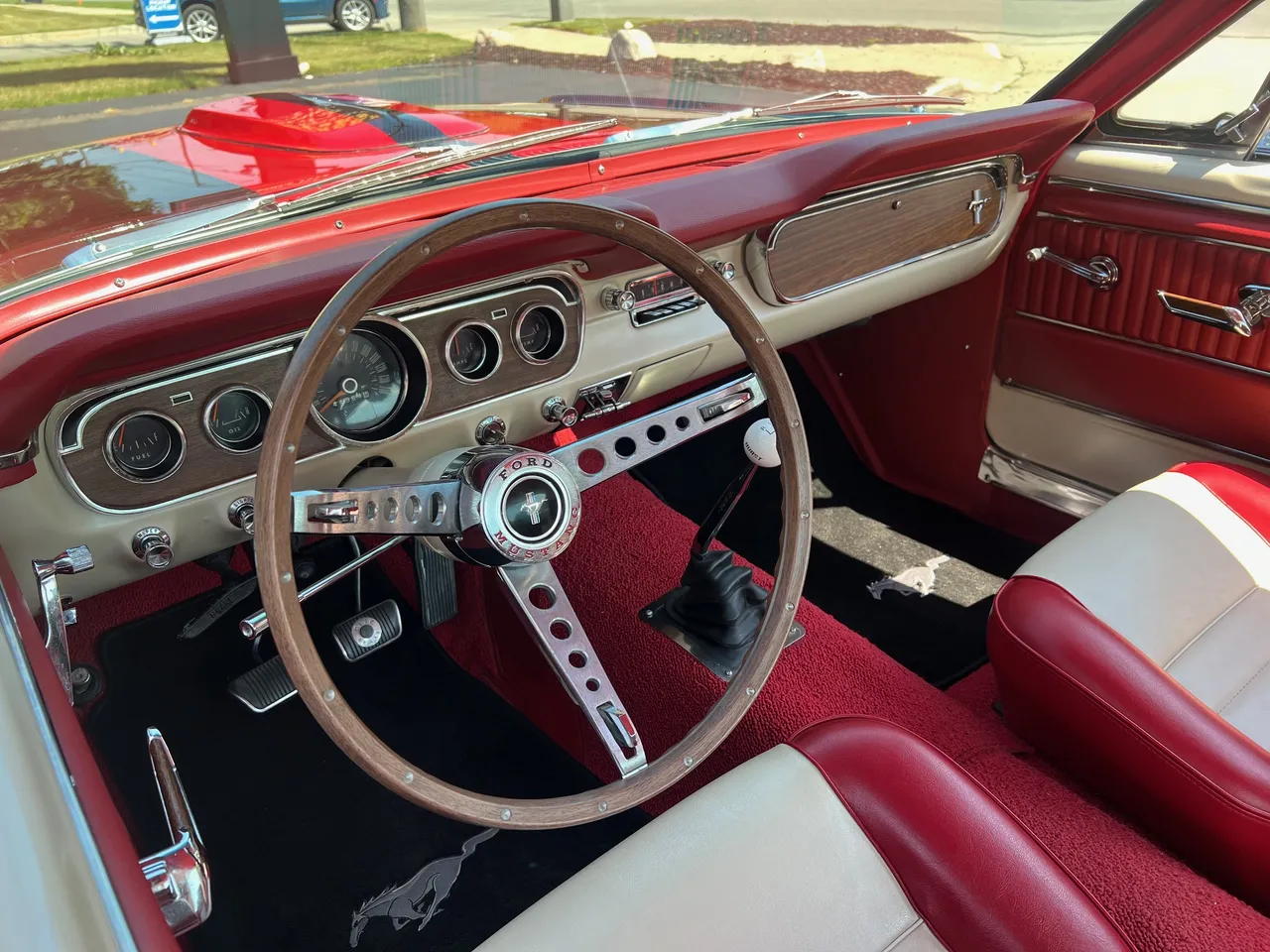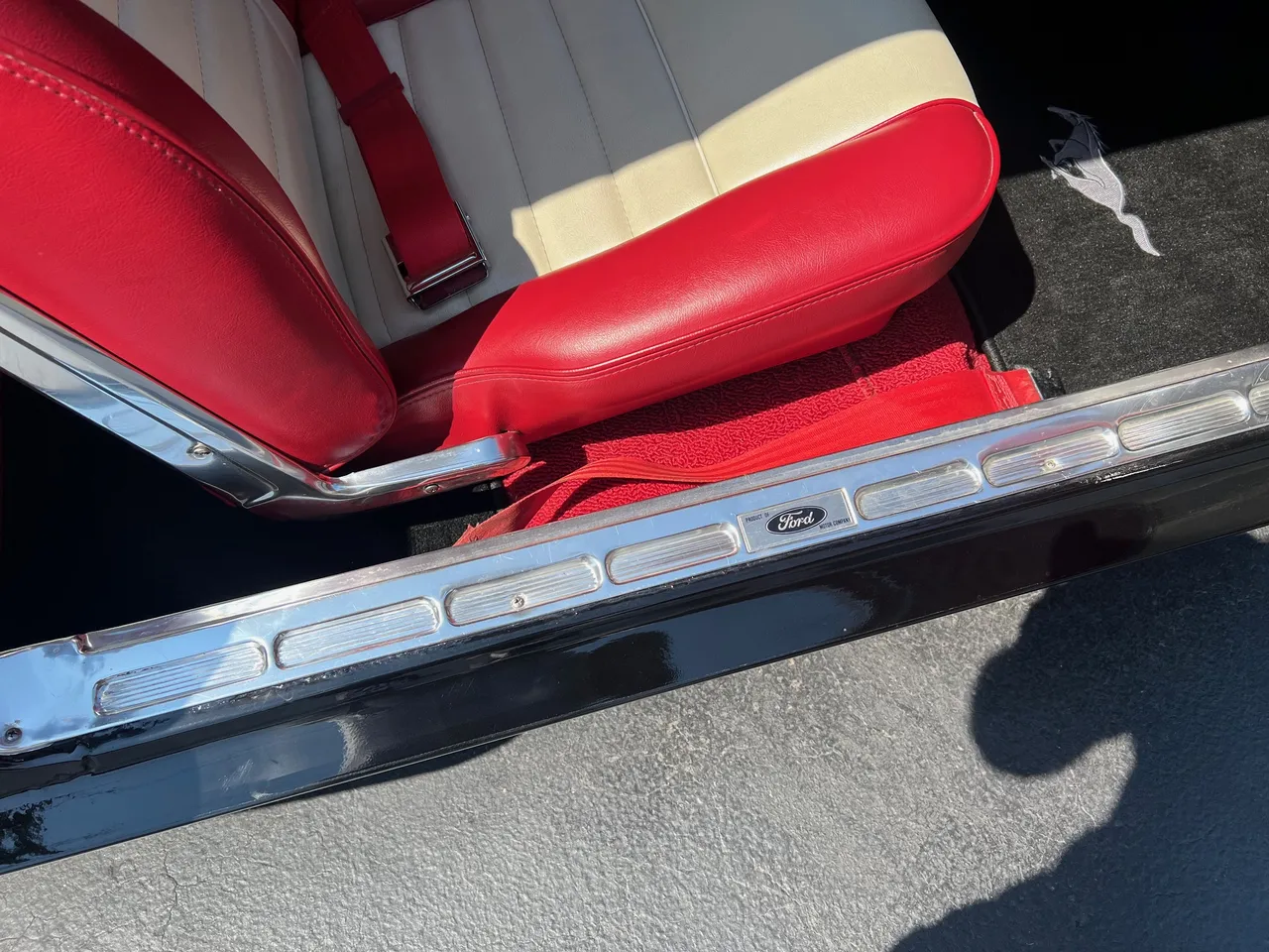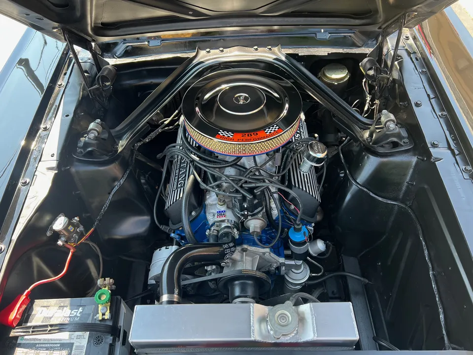Recent Body-Up Restoration, Factory A code car, clean South Carolina car, beautiful Raven black paint, red Shelby striping, two-tone red & white Deluxe Pony interior, factory 289 ci engine, Top-Loader 4 speed manual transmission, Edelbrock 6oo cfm 4 bbl, Edelbrock Performer aluminum intake manifold, roller camshaft, headers, chrome air cleaner, finned aluminum valve covers, front disc brakes, aluminum radiator, TMI bolstered bucket seats, Hurst shifter, wood wheel, factory dash & gauges, am radio, fold-down rear seat, H-pipe Flowmaster dual exhaust with Trumpet tips & GT rear valence, factory 3.00 rear axle, 235/45R17 rear tires, 215/45R17 fronts, 17” American Racing Torque Thrust D wheels, dual chrome mirrors, Shelby appearance kit, fog lights, LED tail lights, oxidized primer floors, One Clean Pony!