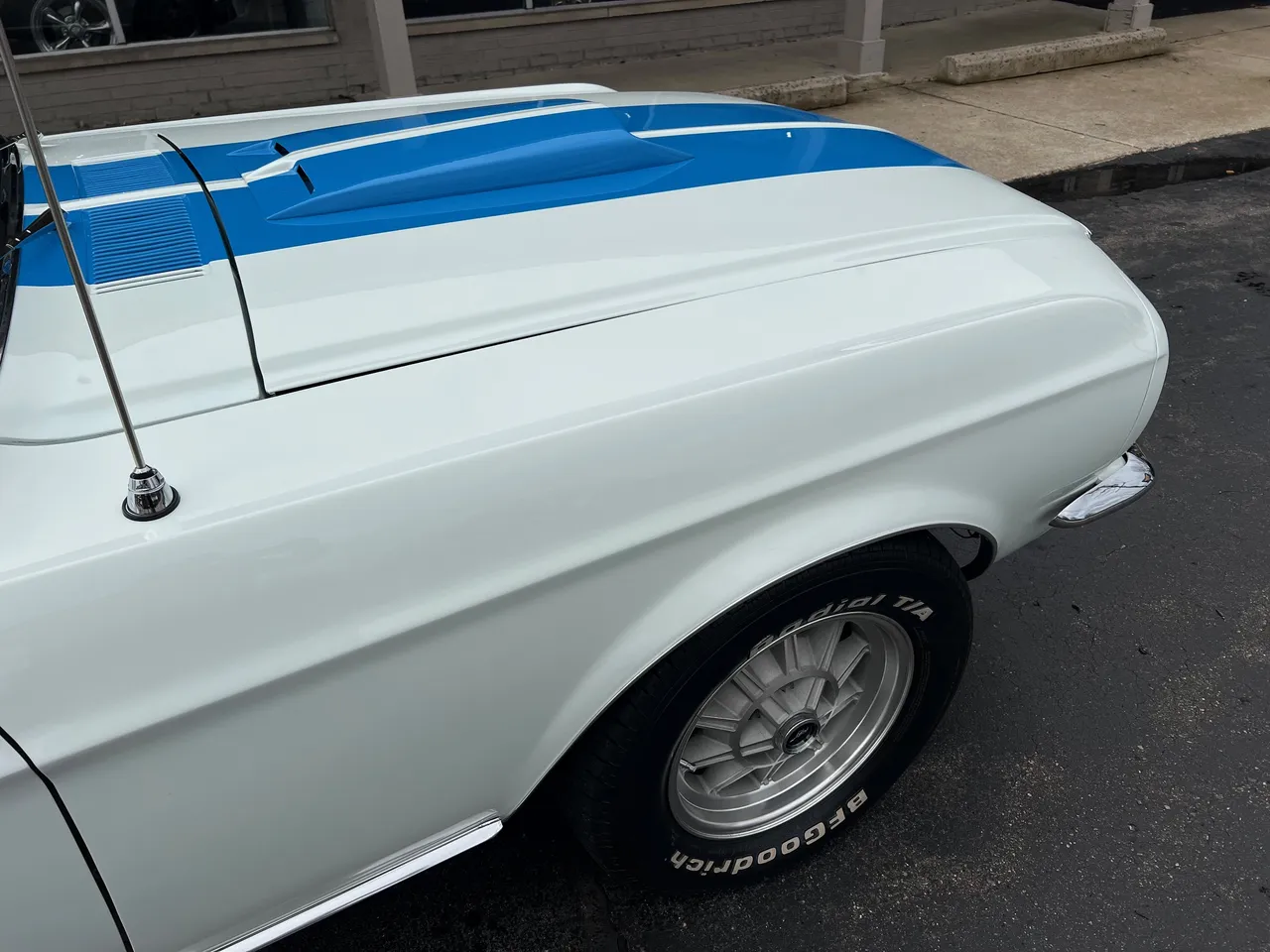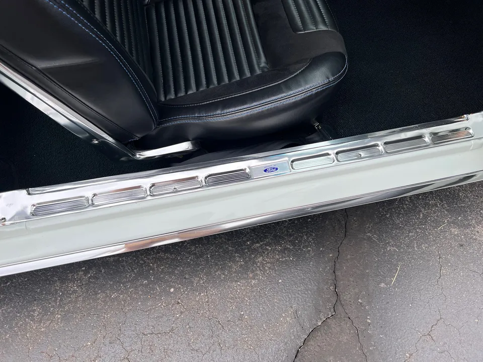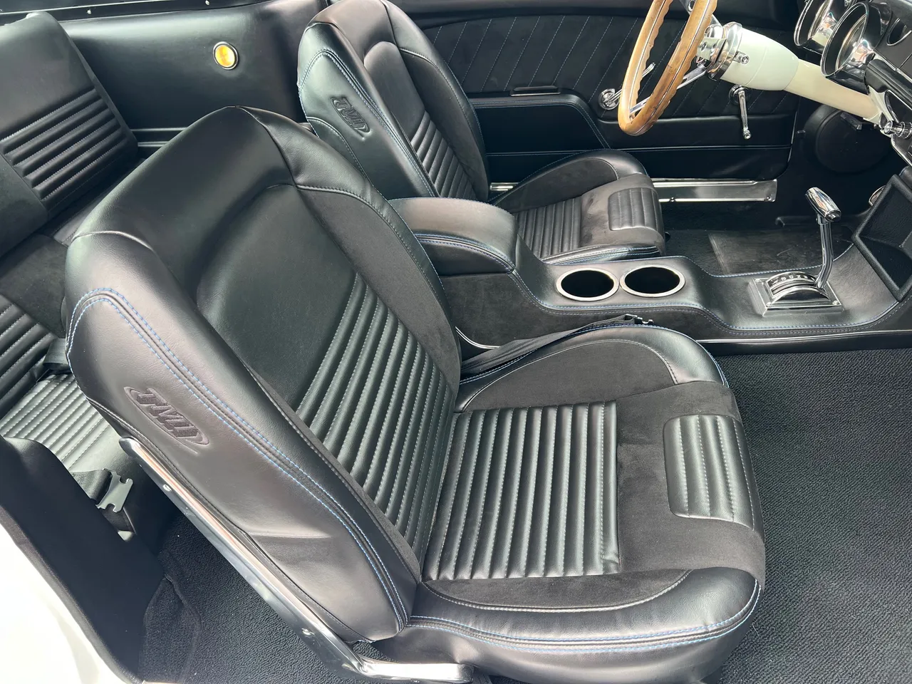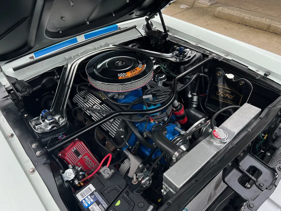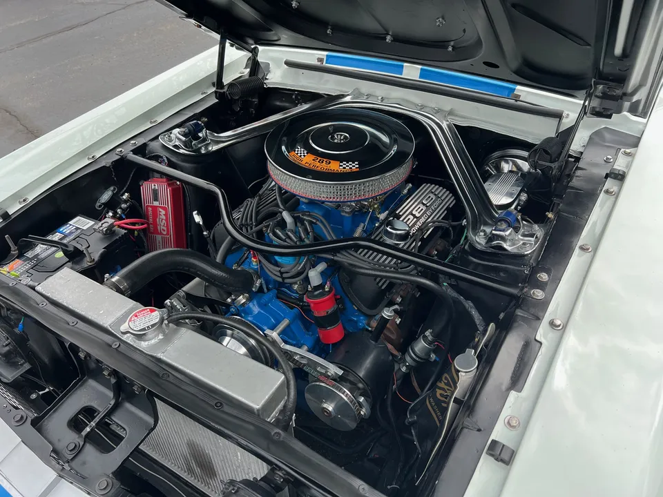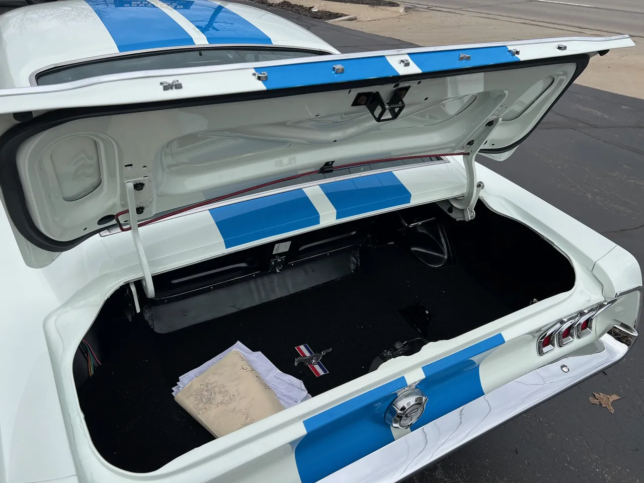 Recent Complete Body-Up Restoration, stunning Wimbledon white paint, Grabber blue Shelby striping, all new custom TMI black interior, factory C code 289 ci engine, Edelbrock 600 cfm 4 bbl, aluminum intake manifold, solid lift camshaft, factory exhaust manifolds, MSD 6AL ignition with Pro Billet distributor, chrome air cleaner, finned aluminum valve covers, billet pulley’s & brackets, power steering, power front disc brakes, chrome strut toner brace, aluminum radiator with electric fan, C4 automatic transmission, TMI buckets seats with full length center console, factory shifter with Lokar linkage, wood wheel factory dash & gauges, Audiosounds am-fm radio with custom kick panel speakers, fold-down rear seat, Flowmaster dual exhaust with correct chrome tips, , factory rear axle with 3.50 gear, new fuel tank, 235/60R15 BF Goodrich Radial T/A tires, 15” Shelby style wheels, GT350 hood scoop, fog lights, new wiring harness, comes with bullet chrome mirrors, One Clean Pony!