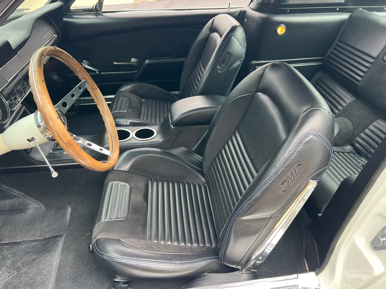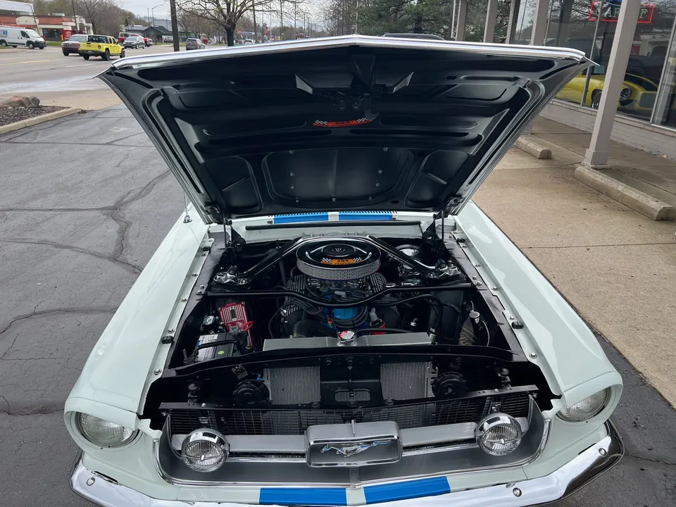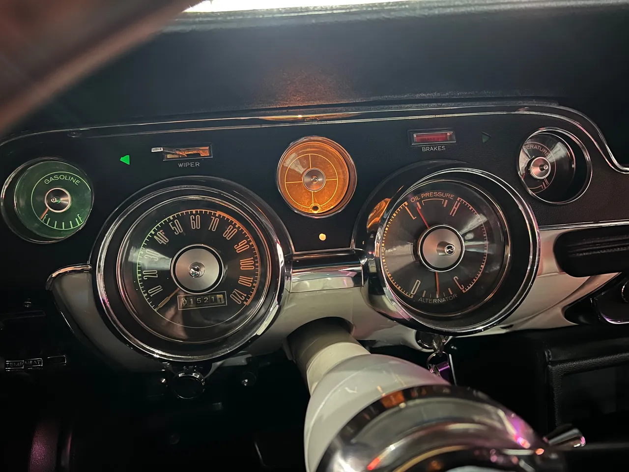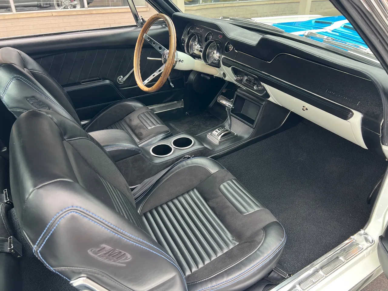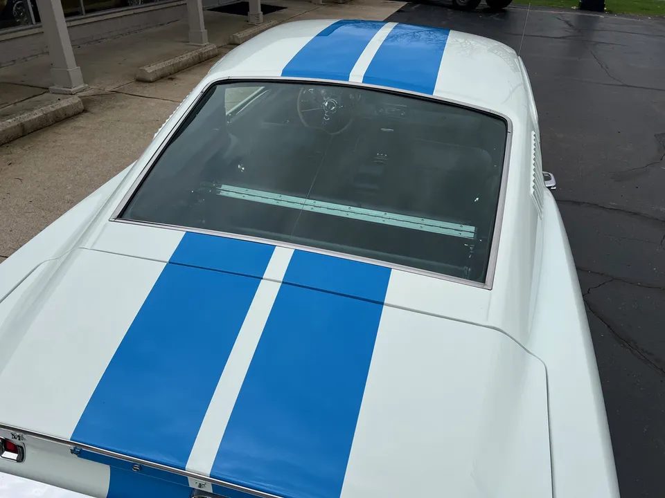 Recent Complete Body-Up Restoration, stunning Wimbledon white paint, Grabber blue Shelby striping, all new custom TMI black interior, factory C code 289 ci engine, Edelbrock 600 cfm 4 bbl, aluminum intake manifold, solid lift camshaft, factory exhaust manifolds, MSD 6AL ignition with Pro Billet distributor, chrome air cleaner, finned aluminum valve covers, billet pulley’s & brackets, power steering, power front disc brakes, chrome strut toner brace, aluminum radiator with electric fan, C4 automatic transmission, TMI buckets seats with full length center console, factory shifter with Lokar linkage, wood wheel factory dash & gauges, Audiosounds am-fm radio with custom kick panel speakers, fold-down rear seat, Flowmaster dual exhaust with correct chrome tips, , factory rear axle with 3.50 gear, new fuel tank, 235/60R15 BF Goodrich Radial T/A tires, 15” Shelby style wheels, GT350 hood scoop, fog lights, new wiring harness, comes with bullet chrome mirrors, One Clean Pony!