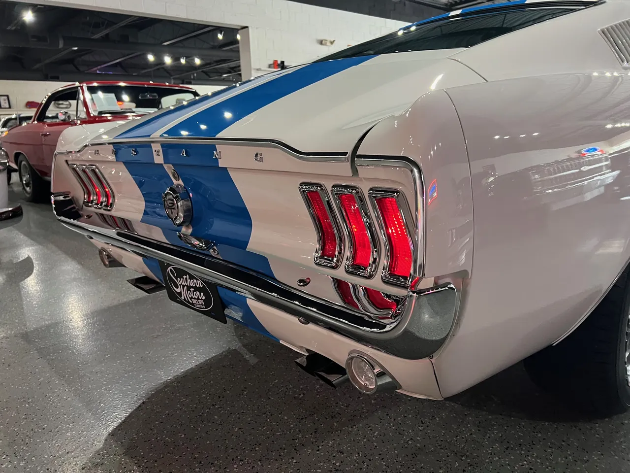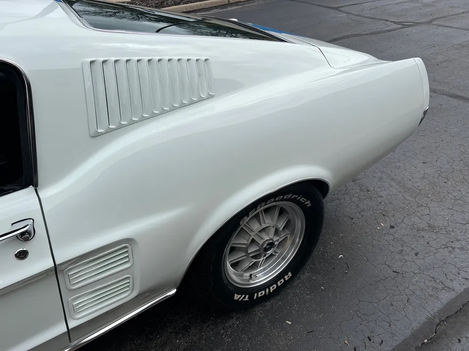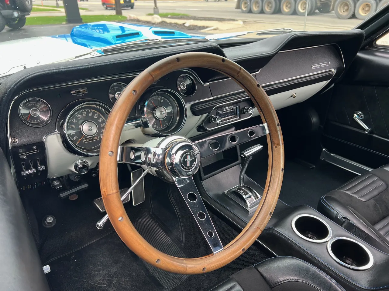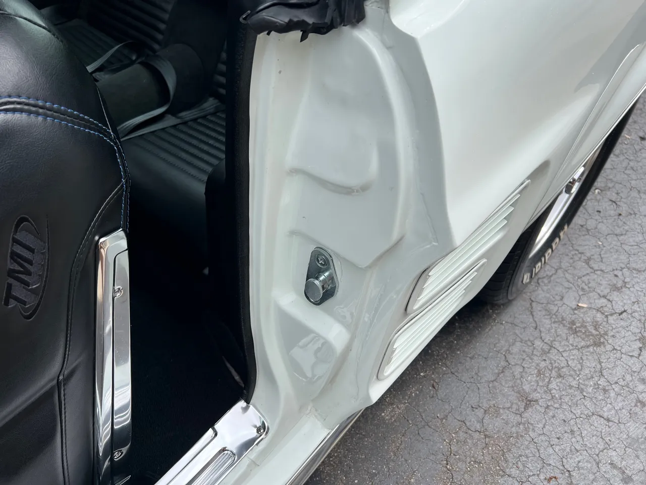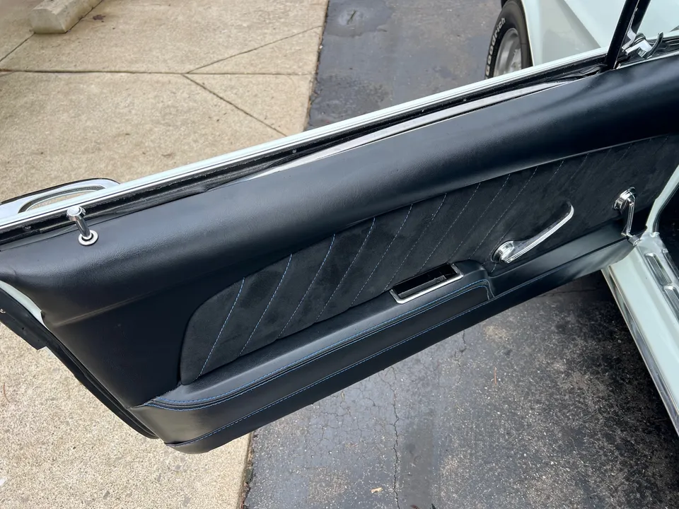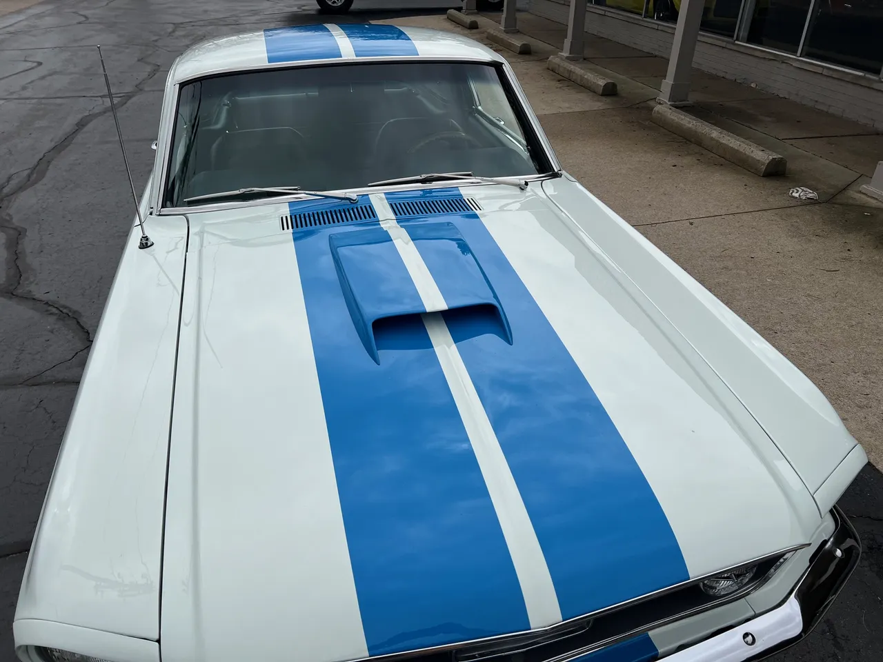 Recent Complete Body-Up Restoration, stunning Wimbledon white paint, Grabber blue Shelby striping, all new custom TMI black interior, factory C code 289 ci engine, Edelbrock 600 cfm 4 bbl, aluminum intake manifold, solid lift camshaft, factory exhaust manifolds, MSD 6AL ignition with Pro Billet distributor, chrome air cleaner, finned aluminum valve covers, billet pulley’s & brackets, power steering, power front disc brakes, chrome strut toner brace, aluminum radiator with electric fan, C4 automatic transmission, TMI buckets seats with full length center console, factory shifter with Lokar linkage, wood wheel factory dash & gauges, Audiosounds am-fm radio with custom kick panel speakers, fold-down rear seat, Flowmaster dual exhaust with correct chrome tips, , factory rear axle with 3.50 gear, new fuel tank, 235/60R15 BF Goodrich Radial T/A tires, 15” Shelby style wheels, GT350 hood scoop, fog lights, new wiring harness, comes with bullet chrome mirrors, One Clean Pony!