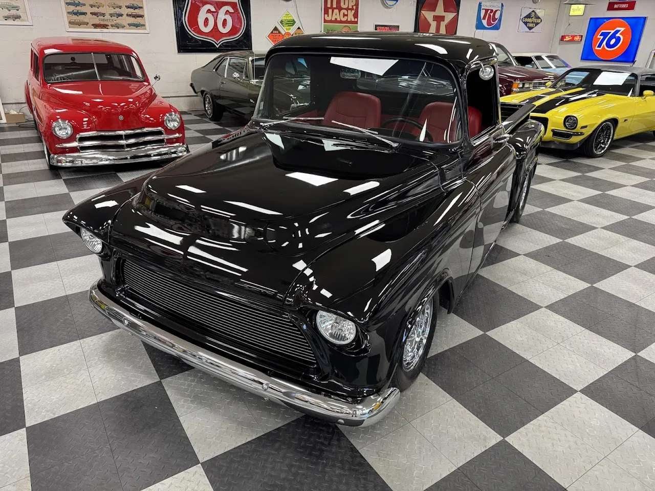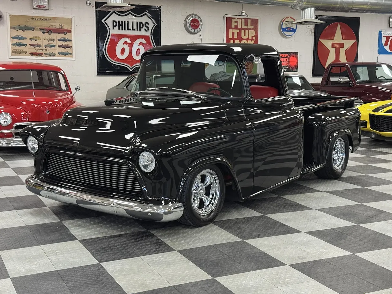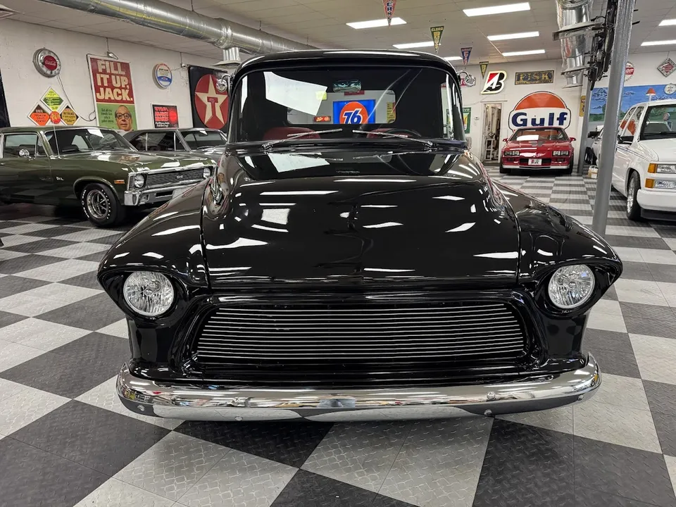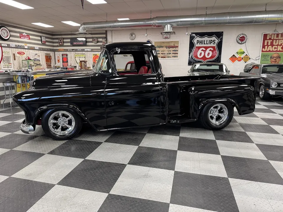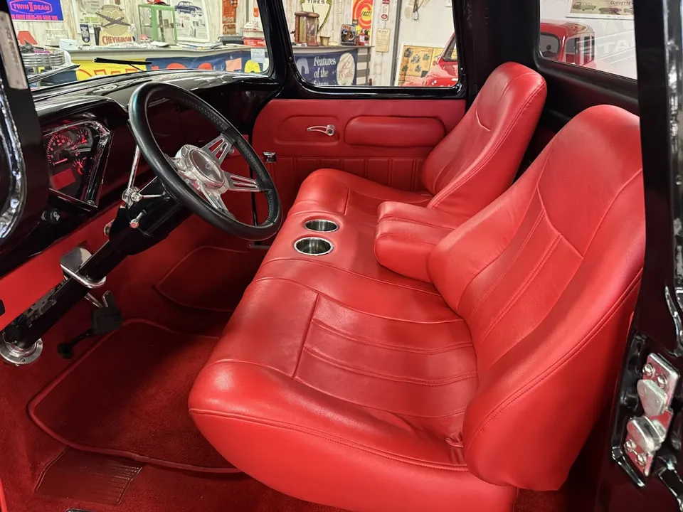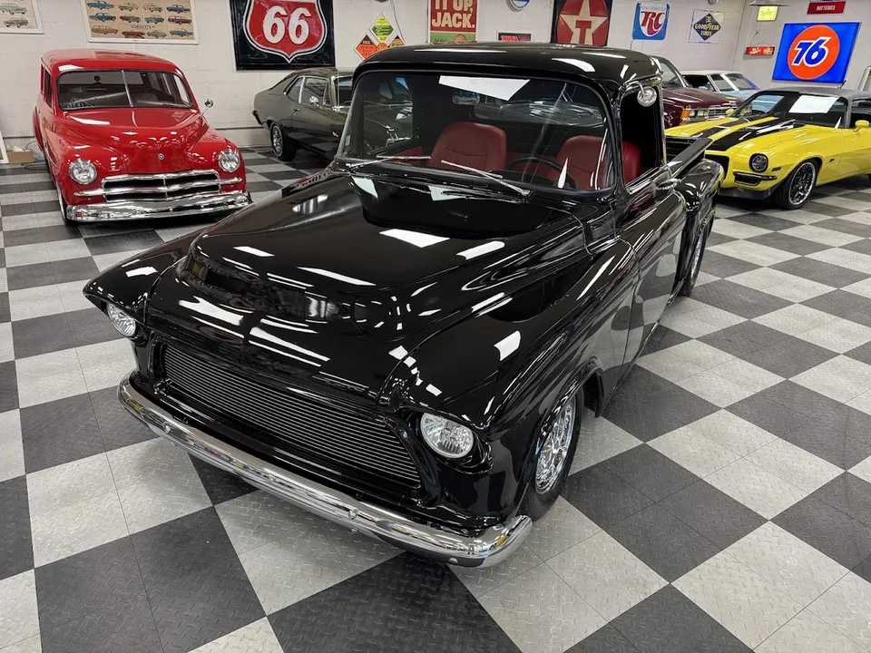 Coming Soon! 1955 Chevrolet 3100, Frame Off Restored Street Rod pickup, beautiful Tuxedo black paint, custom red leather interior, ZZ3 350 ci crate engine, 700R4 automatic overdrive transmission, Billet frontrunner system, power steering, disc brake, Vintage A/C, Mustang II tubular front suspension, Dakota Custom Gauges, tilt column, Le Carra Leather wrapped wheel, power windows, 10 bolt rear axle, oak wood bed with stainless strips, relocated aluminum fuel tank, 15” chrome American Torque Thrust wheels, Ready to Cruise! $62,900