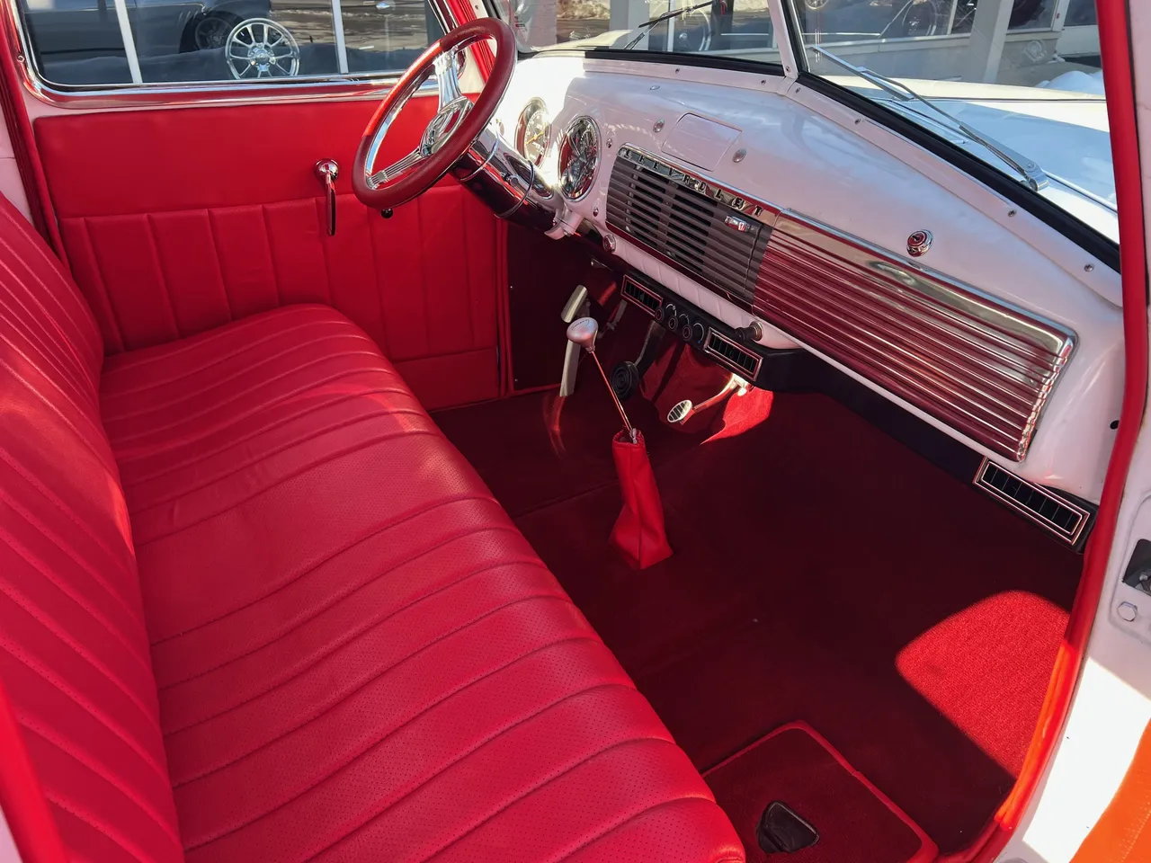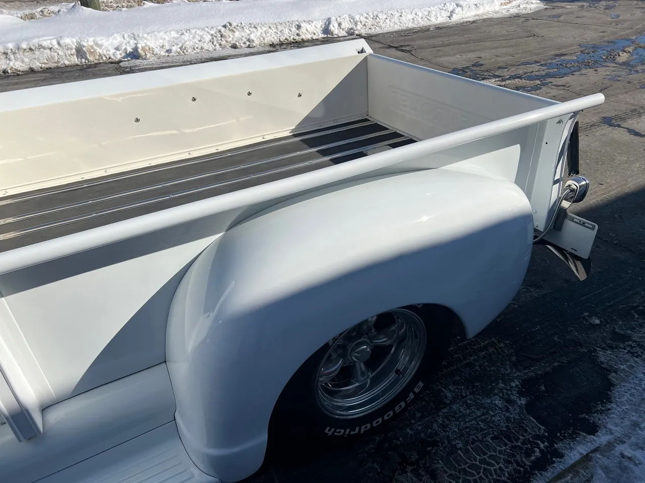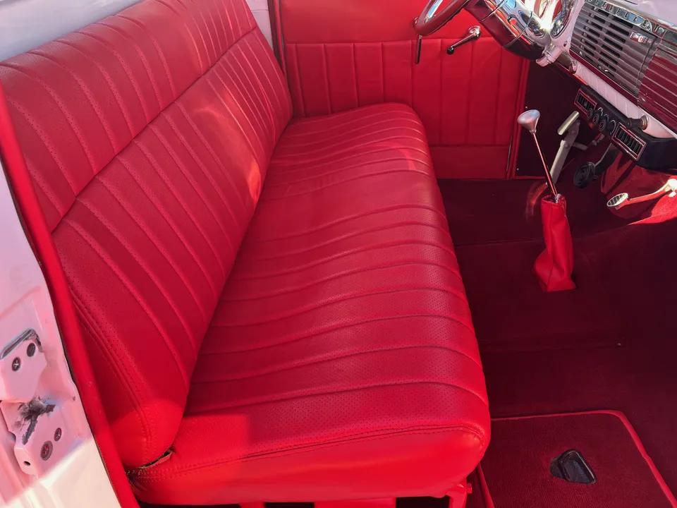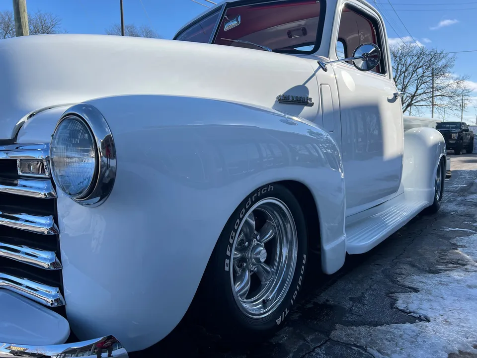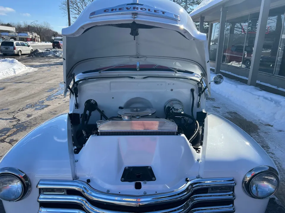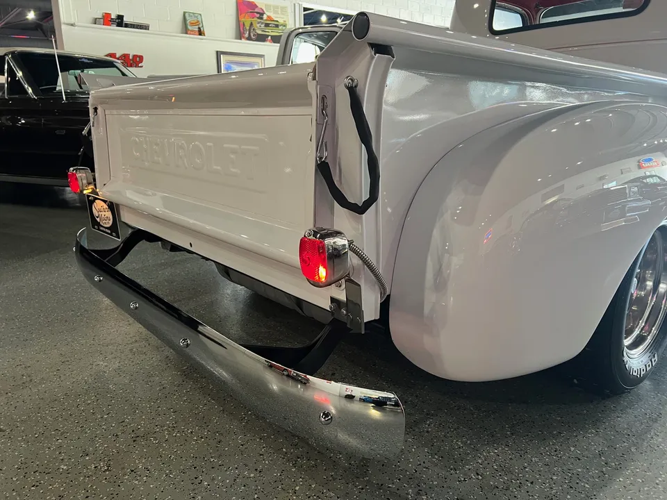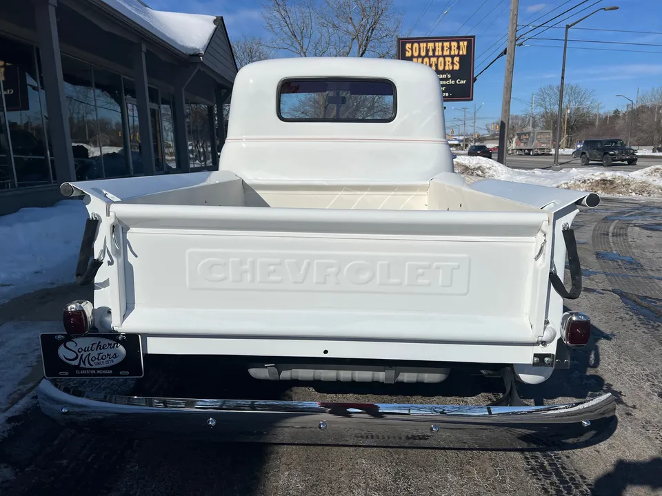Recent Frame-Up Restored All Steel Custom Pickup, clean original California truck, beautiful Arctic white paint, all new red leather interior, 350 ci engine, Demon 4 bbl, Edelbrock aluminum intake, GM exhaust manifolds, HEI distributor, chrome air cleaner & valve covers, billet brackets & pulley’s, Nova front sub-frame, power steering, power front disc brakes, air conditioning, aluminum radiator with flex fan, 350 turbohydramatic transmission, bench seat, chrome tilt column with billet wheel, Dolphin gauges, power windows, Lokar shifter, updated wiring harness, electric wipers, Flowmaster dual exhaust, GM 10 bolt rear axle, 245/60R15 BF Goodrich Radial T/A rear tires, 215/60R15 fronts, 15” American Racing Torque Thrust wheels, custom fuel tank, custom wood bed, new glass, Ready to Cruise!