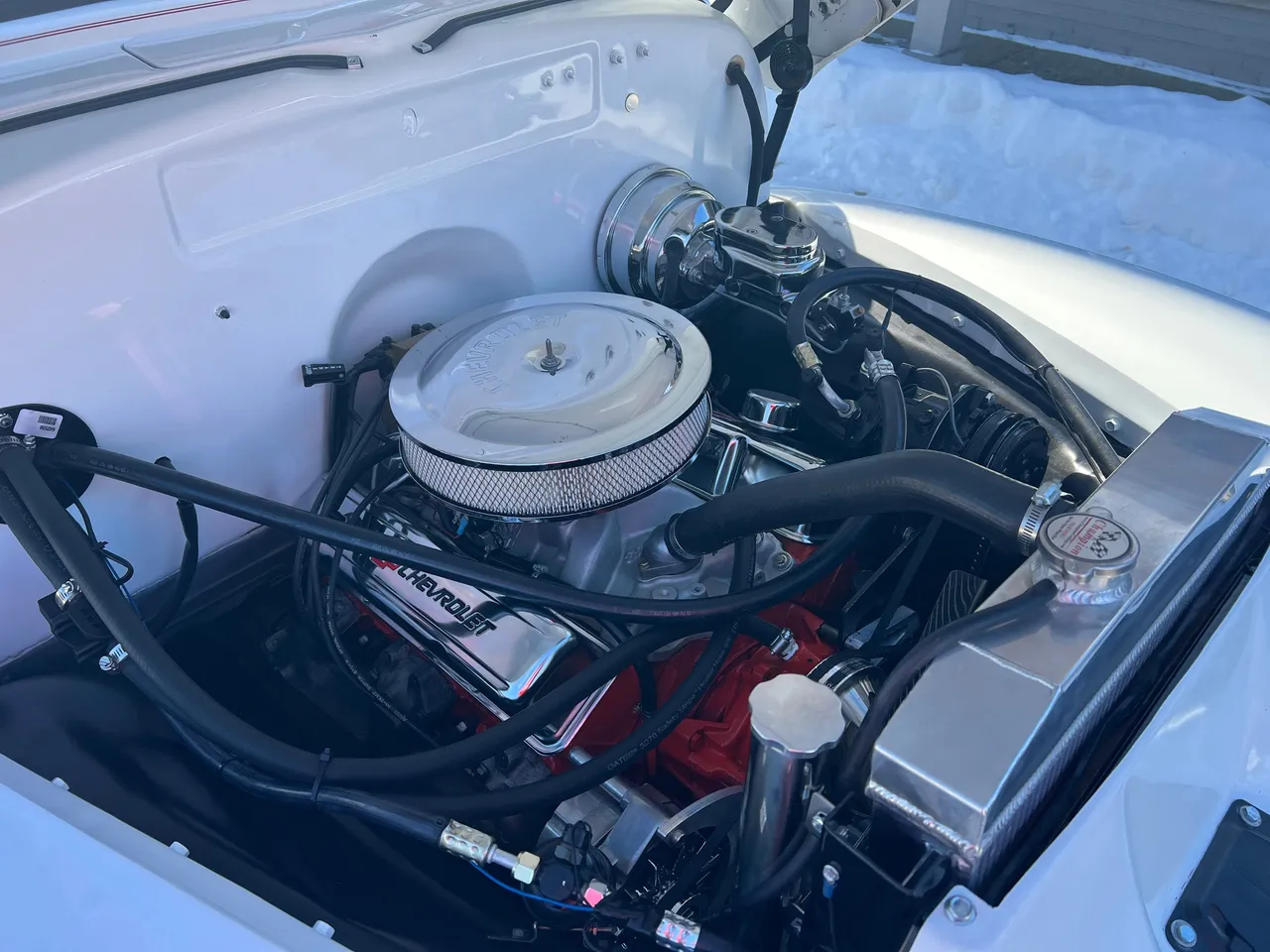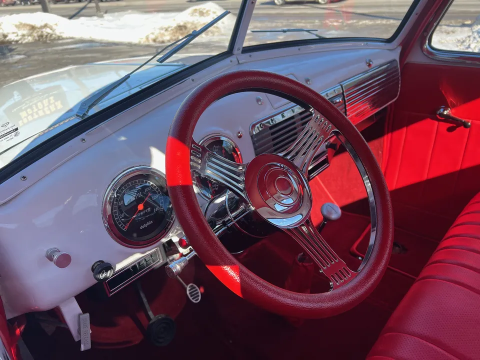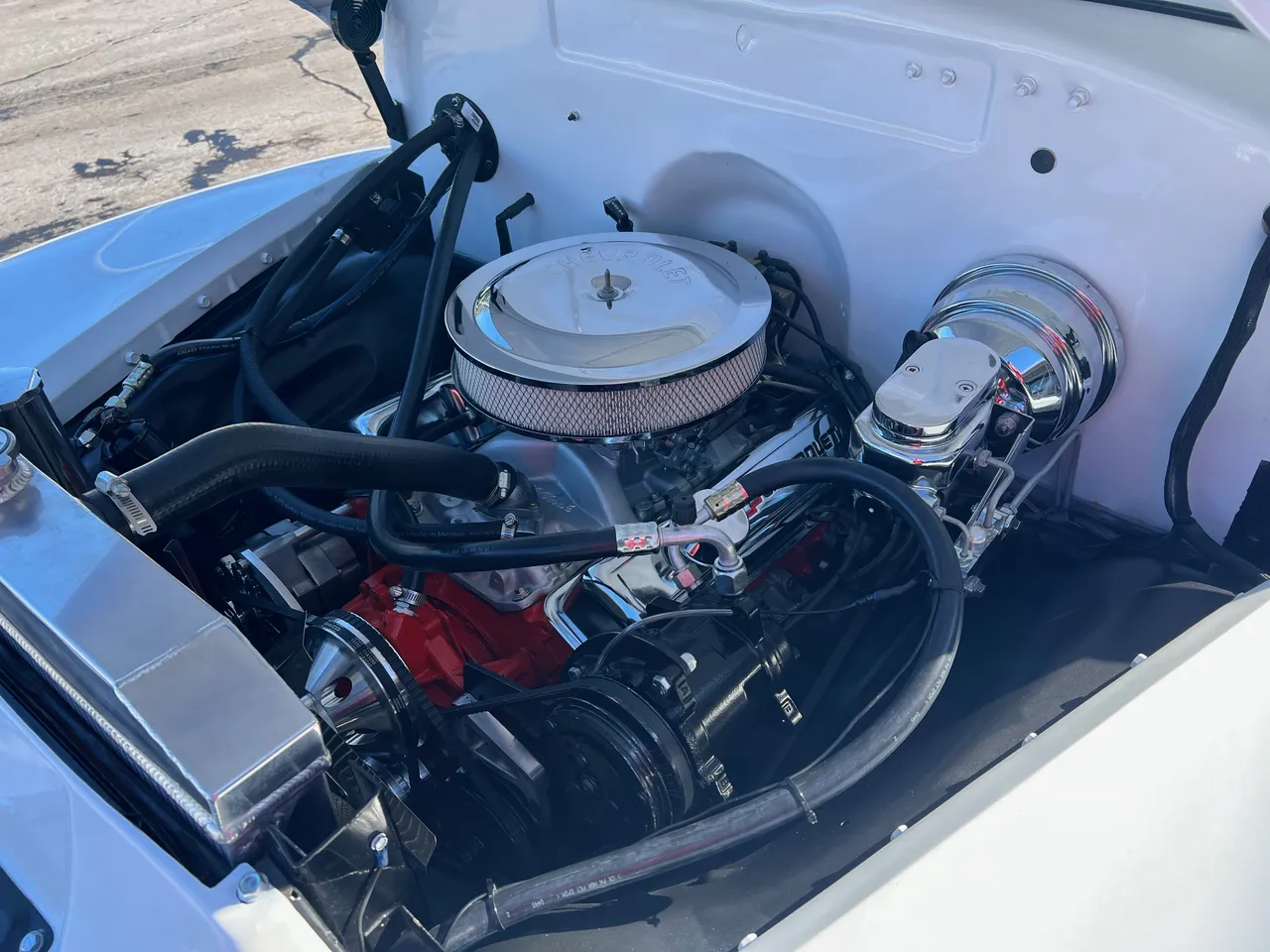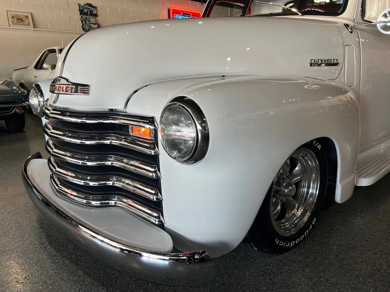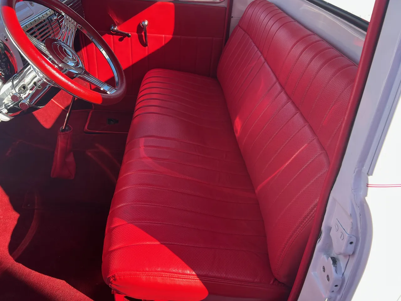 Recent Frame-Up Restored All Steel Custom Pickup, clean original California truck, beautiful Arctic white paint, all new red leather interior, 350 ci engine, Demon 4 bbl, Edelbrock aluminum intake, GM exhaust manifolds, HEI distributor, chrome air cleaner & valve covers, billet brackets & pulley’s, Nova front sub-frame, power steering, power front disc brakes, air conditioning, aluminum radiator with flex fan, 350 turbohydramatic transmission, bench seat, chrome tilt column with billet wheel, Dolphin gauges, power windows, Lokar shifter, updated wiring harness, electric wipers, Flowmaster dual exhaust, GM 10 bolt rear axle, 245/60R15 BF Goodrich Radial T/A rear tires, 215/60R15 fronts, 15” American Racing Torque Thrust wheels, custom fuel tank, custom wood bed, new glass, Ready to Cruise!