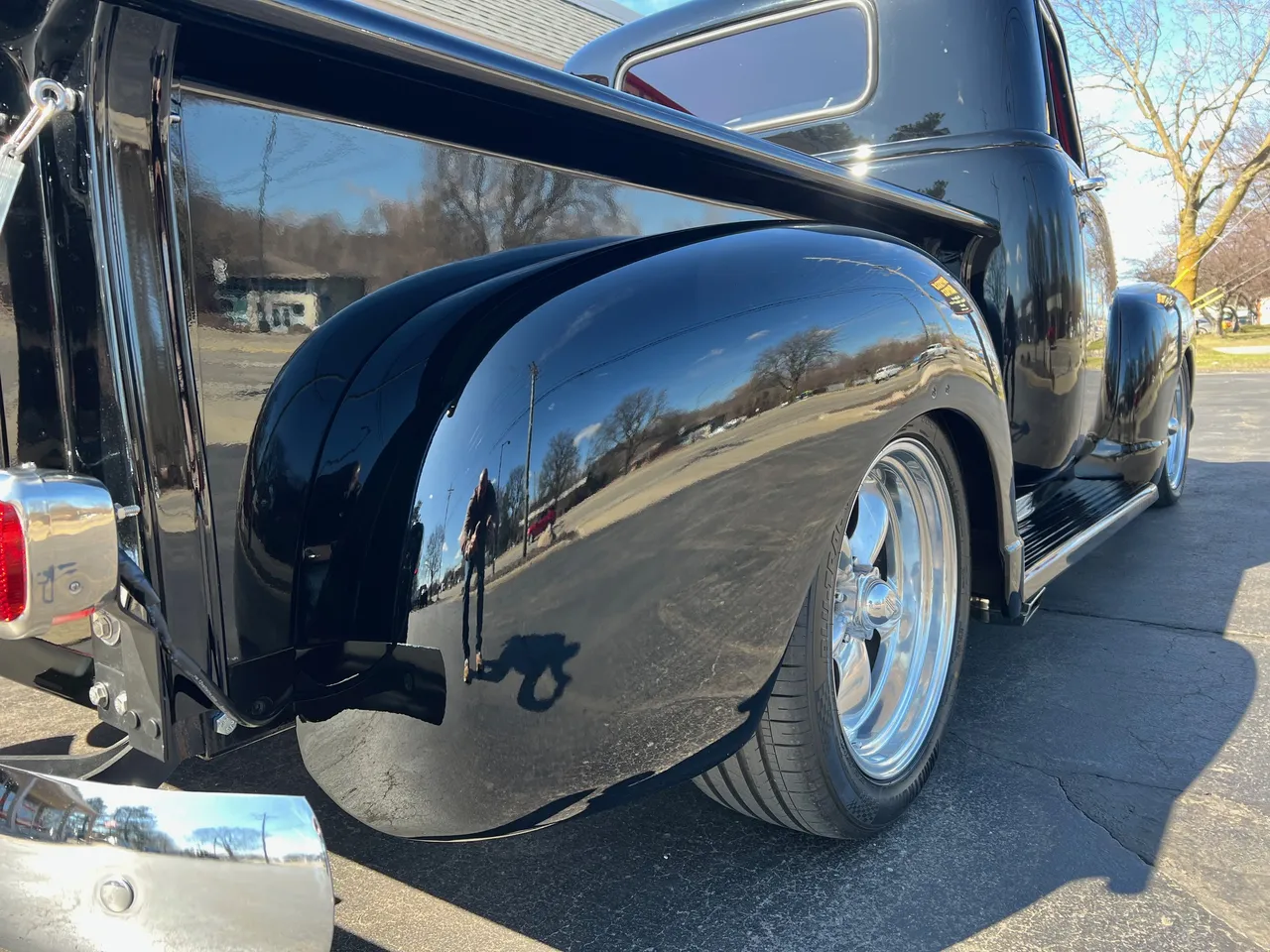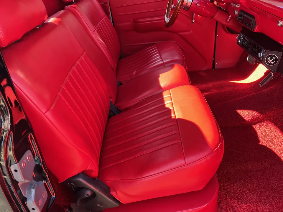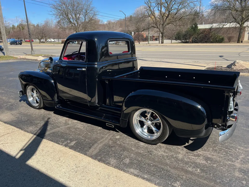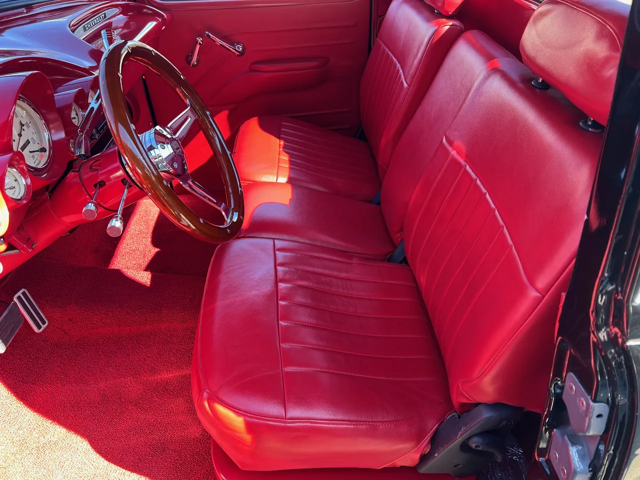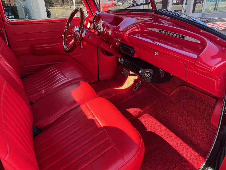 All Steel Frame Off Restored Custom Built Restomod Truck, beautiful Tuxedo black paint, custom red leather interior, LS1 EFI engine, power steering, power 4-wheel disc brakes, electric air conditioning, 4L60 automatic overdrive transmission, aluminum radiator with electric fan, custom bucket seats with buddy seat, tilt column with billet wheel, 59’ Impala dash with Autometer gauges, Pioneer sound system with custom kick panels, sculpted door panels & headliner, dual exhaust with chrome tips, GM 10 bolt rear axle, custom fuel tank, Maple wood bed, 255/45R18 rear tires, 225/45R18 fronts, 18” American Racing Torque Thrust wheels, Ready to Cruise!