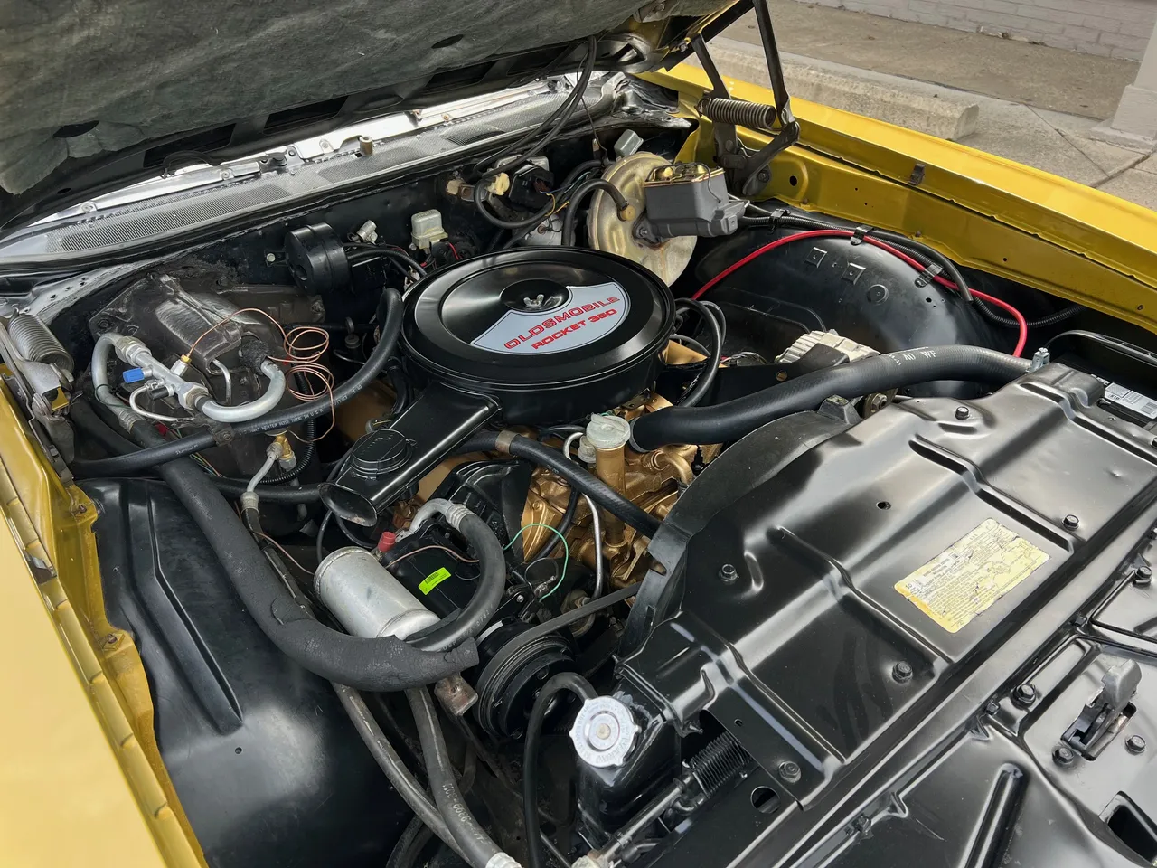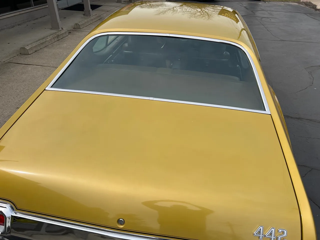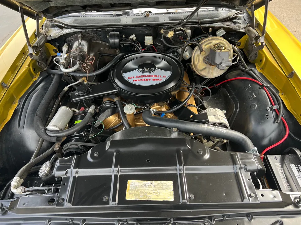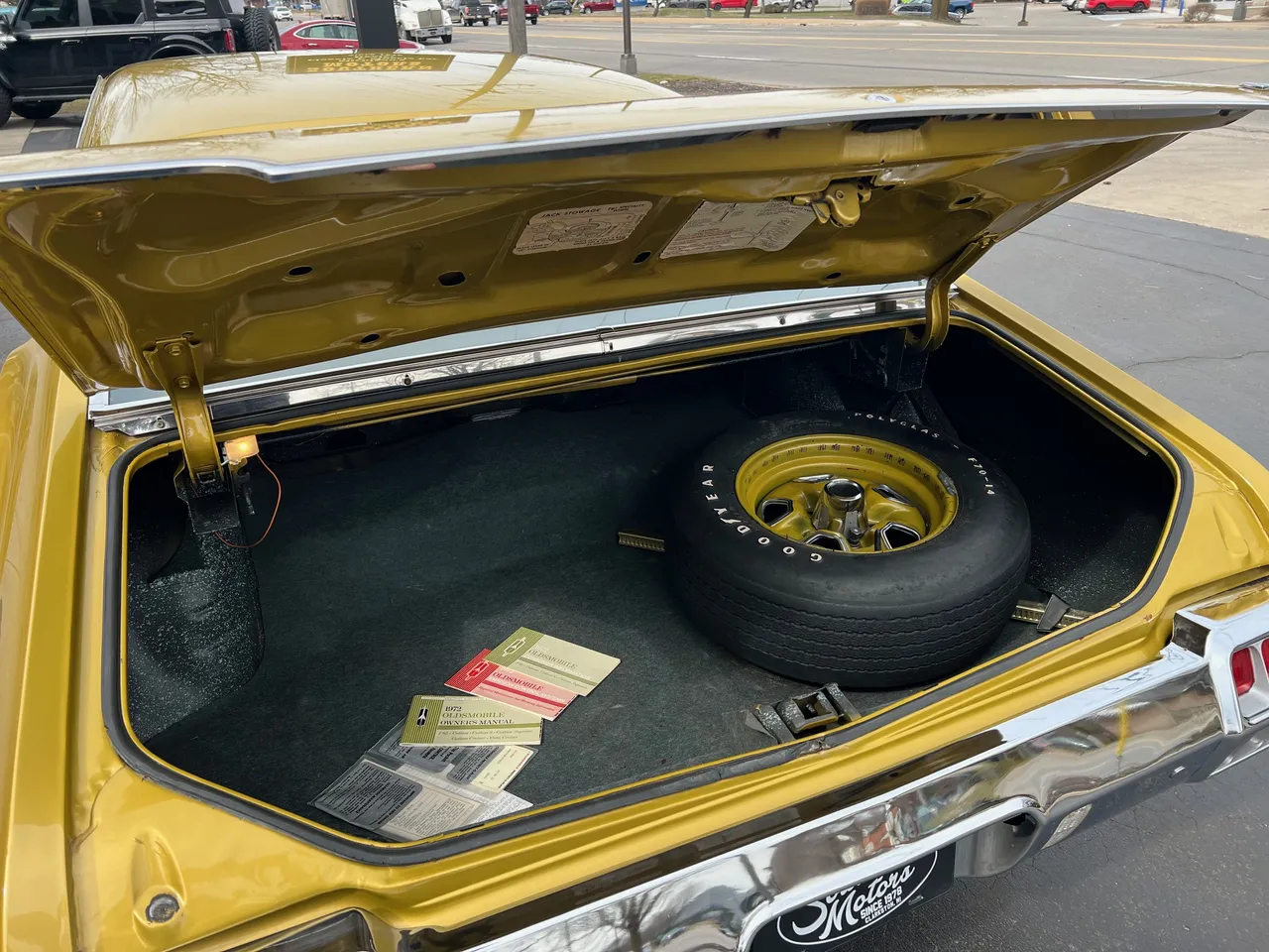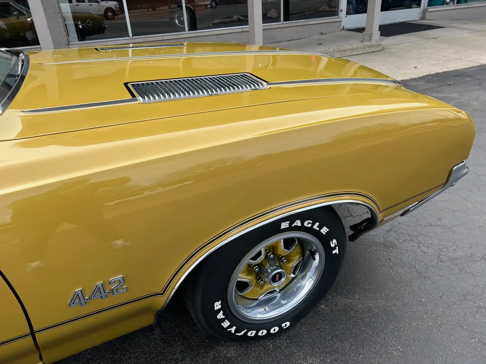 46,ooo original mile 2 Owner car, beautiful factory (53) Saturn gold metallic paint, factory (949) Saddle vinyl interior, factory black 442 striping, matching numbers 350 ci engine, 4 bbl, factory intake & exhaust manifolds, factory air cleaner & valve covers, power steering, power front disc brakes, factory air conditioning, 350 turbohydramatic transmission, factory bucket seats with center console, factory dash & gauges, remote driver’s mirror, factory Delco am radio, Flowmaster dual exhaust with correct chrome tips, factory 10 bolt 3.23 rear axle & sway bar, 205/70R14 Goodyear Eagle tires, factor 14” SSII wheels, original Goodyear bias-ply spare with factory jack, original owner’s manuals & Protect-O-Plate, T3 headlights, original Soft Ray glass, Collector Quality!