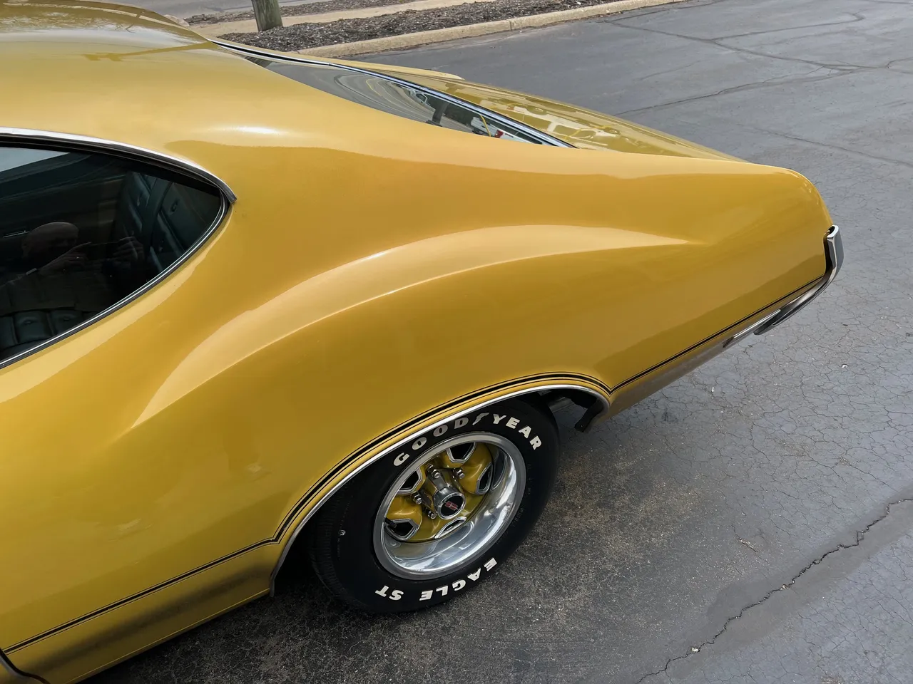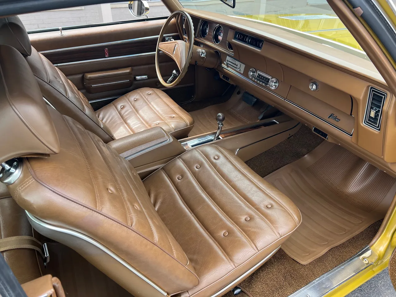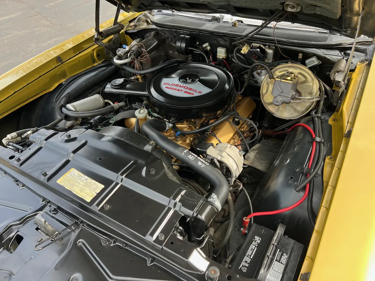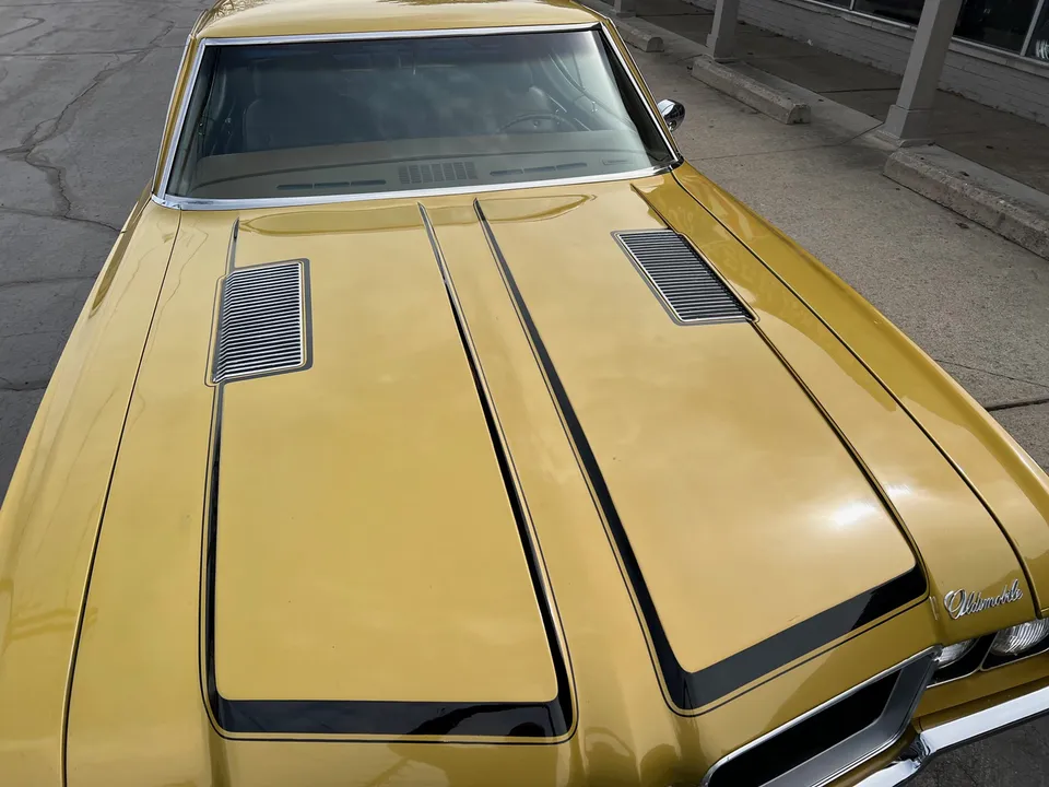 46,ooo original mile 2 Owner car, beautiful factory (53) Saturn gold metallic paint, factory (949) Saddle vinyl interior, factory black 442 striping, matching numbers 350 ci engine, 4 bbl, factory intake & exhaust manifolds, factory air cleaner & valve covers, power steering, power front disc brakes, factory air conditioning, 350 turbohydramatic transmission, factory bucket seats with center console, factory dash & gauges, remote driver’s mirror, factory Delco am radio, Flowmaster dual exhaust with correct chrome tips, factory 10 bolt 3.23 rear axle & sway bar, 205/70R14 Goodyear Eagle tires, factor 14” SSII wheels, original Goodyear bias-ply spare with factory jack, original owner’s manuals & Protect-O-Plate, T3 headlights, original Soft Ray glass, Collector Quality!