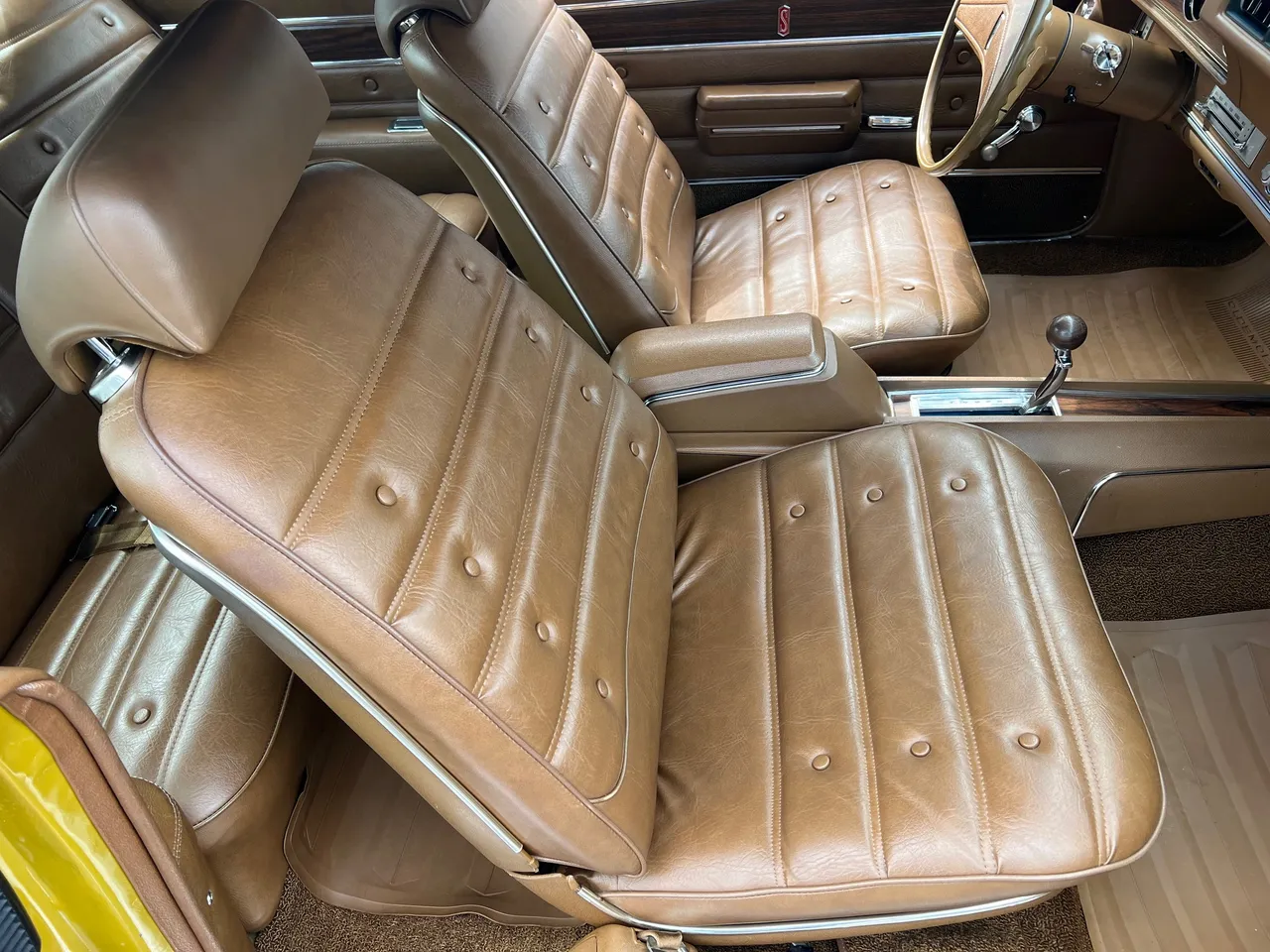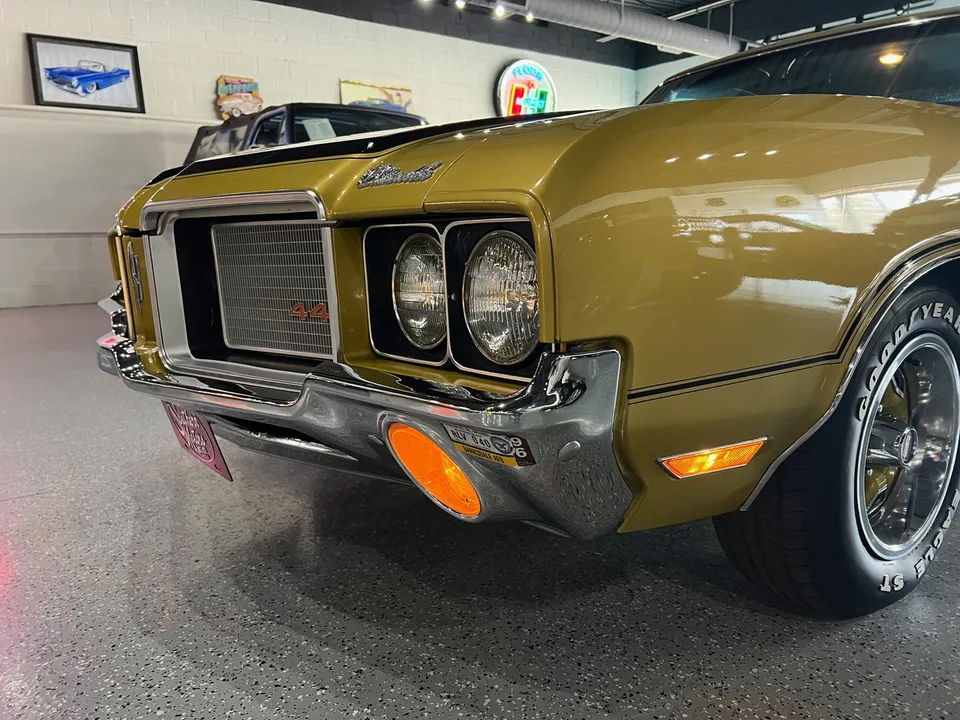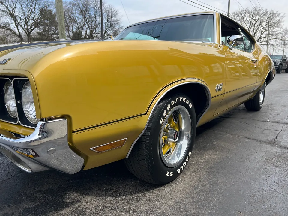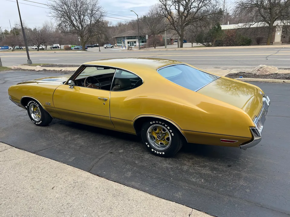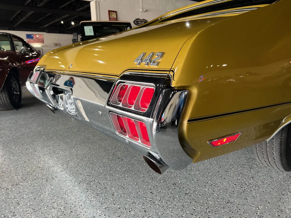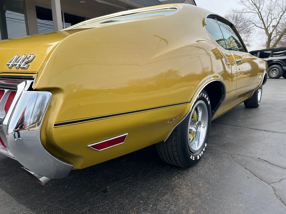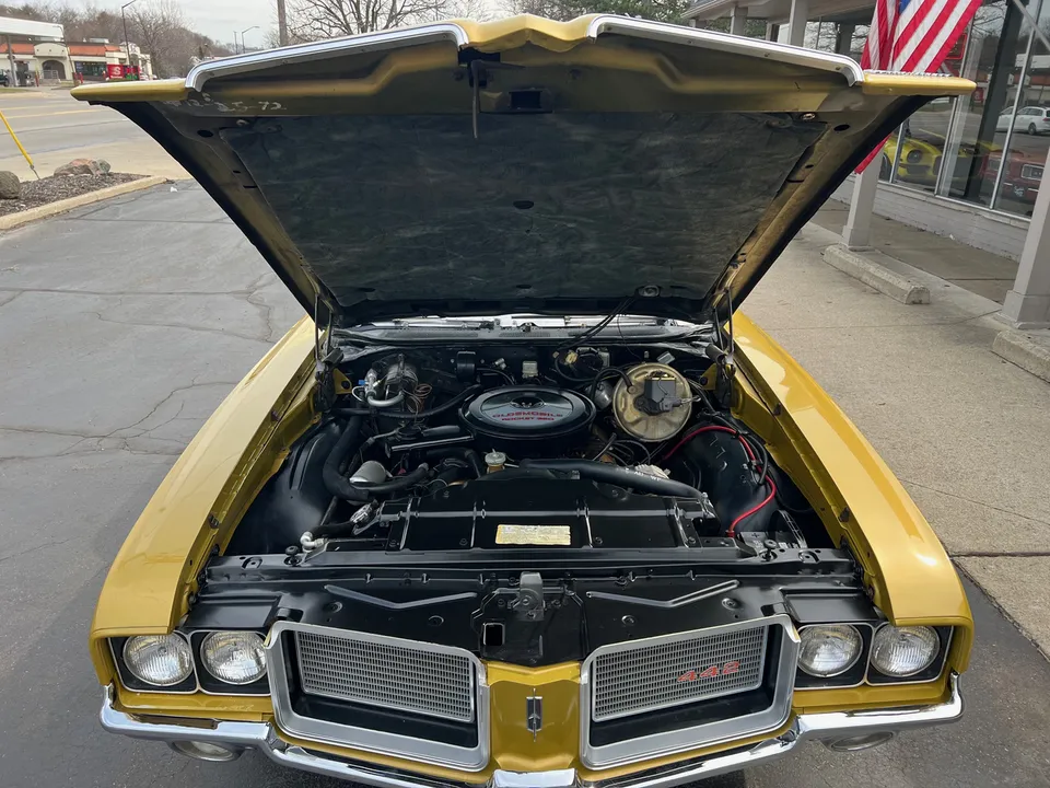 46,ooo original mile 2 Owner car, beautiful factory (53) Saturn gold metallic paint, factory (949) Saddle vinyl interior, factory black 442 striping, matching numbers 350 ci engine, 4 bbl, factory intake & exhaust manifolds, factory air cleaner & valve covers, power steering, power front disc brakes, factory air conditioning, 350 turbohydramatic transmission, factory bucket seats with center console, factory dash & gauges, remote driver’s mirror, factory Delco am radio, Flowmaster dual exhaust with correct chrome tips, factory 10 bolt 3.23 rear axle & sway bar, 205/70R14 Goodyear Eagle tires, factor 14” SSII wheels, original Goodyear bias-ply spare with factory jack, original owner’s manuals & Protect-O-Plate, T3 headlights, original Soft Ray glass, Collector Quality!