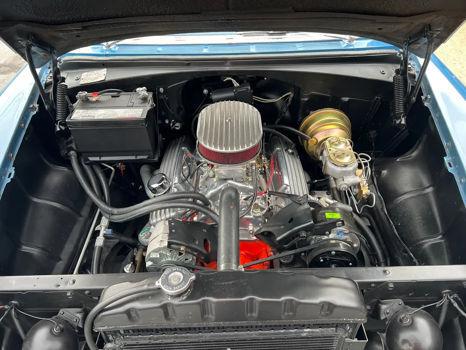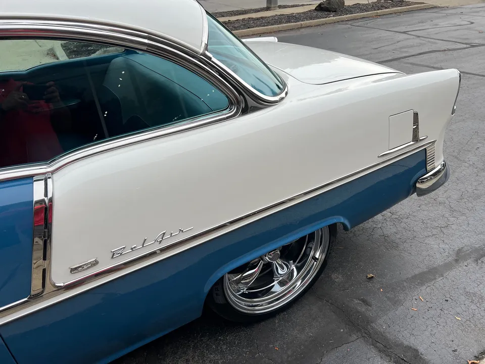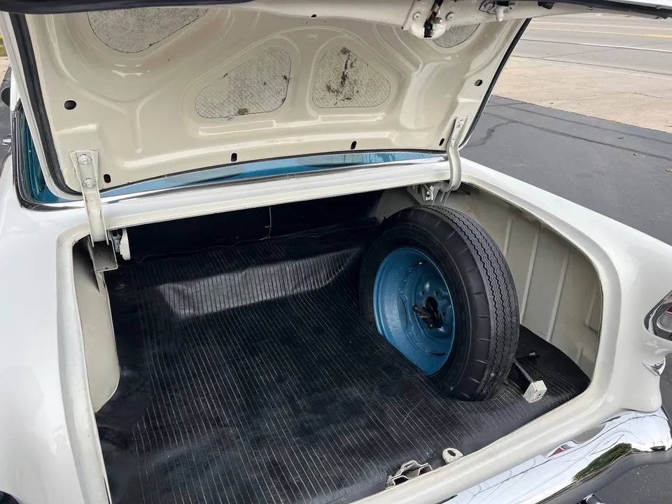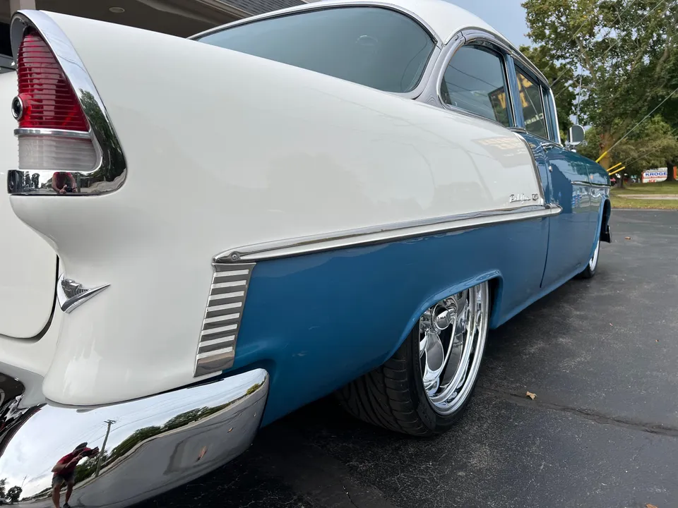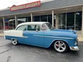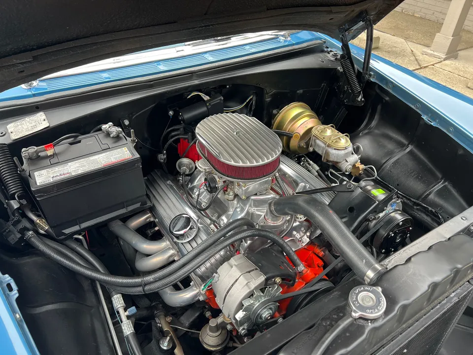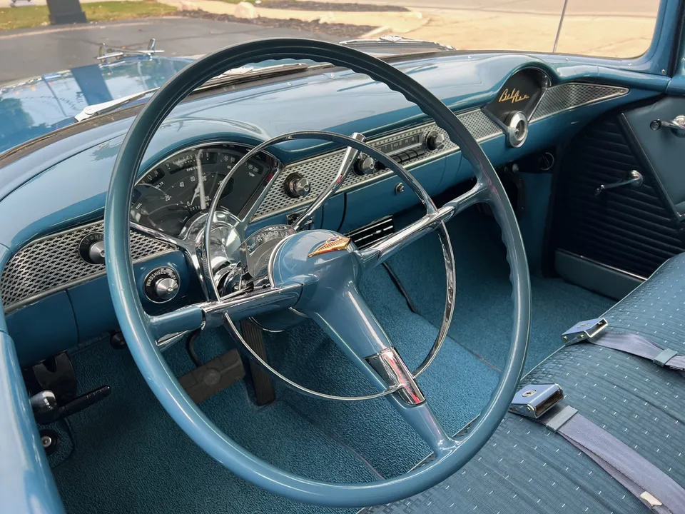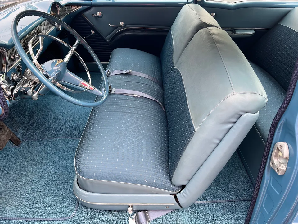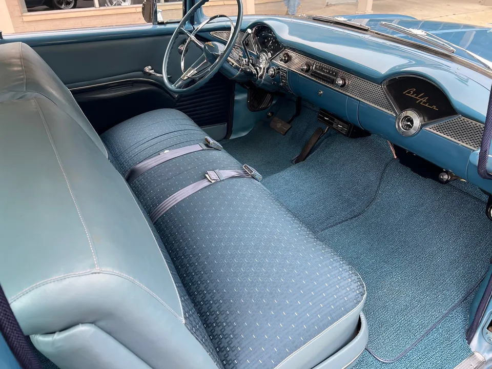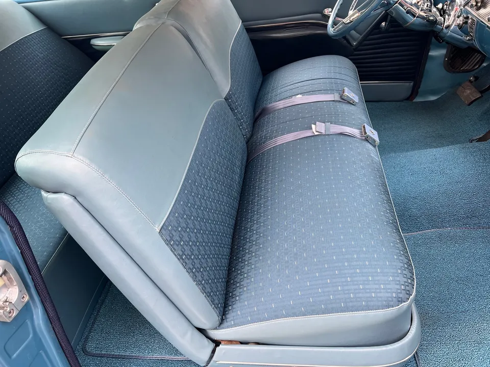 1800 miles on Body-Up Restoration, clean original Arkansas car, beautiful two-tone Glacier blue & India Ivory, factory two tone blue interior, 350 ci engine, Holley 4 bbl, polished aluminum intake, MSD Pro Billet distributor, ceramic headers, finned aluminum air cleaner & valve covers, aftermarket power steering, tubular upper & lower control arms, Wilwood power front disc brakes with slotted & drilled rotors, aftermarket air conditioning, 700R4 automatic overdrive transmission, factory bench seat, tilt column with Bel Air wheel, Classic Instruments gauge cluster, am radio, Flowmaster dual exhaust, California boxed frame, factory rear axle, 275/35ZR20 rear tires, 225/40ZR18 fronts, 18 & 20” chrome American Torque Thrust II wheels, factory jack with spare, EZ-Eye glass, California bumpers, Ready to Cruise!