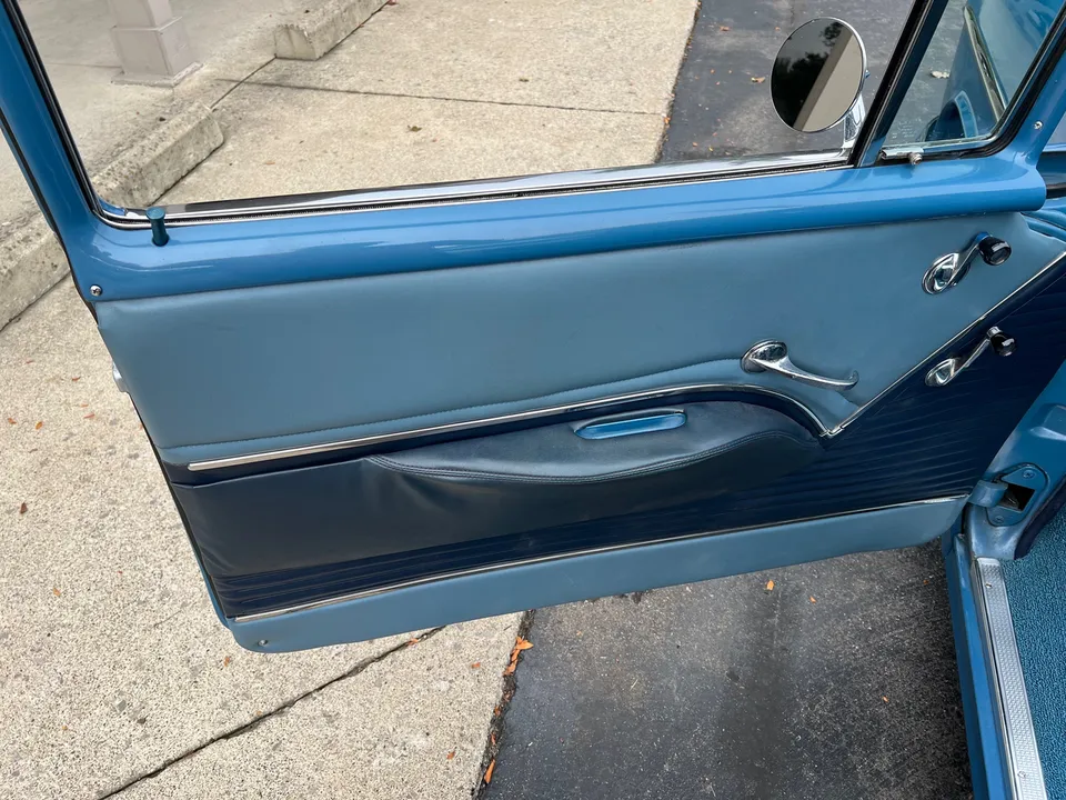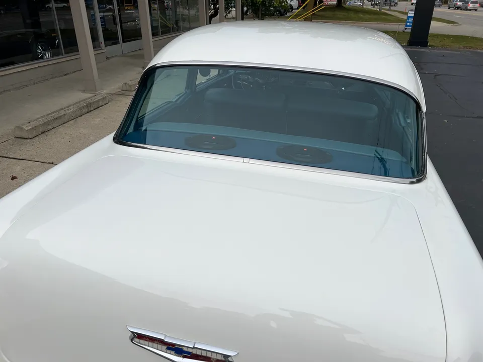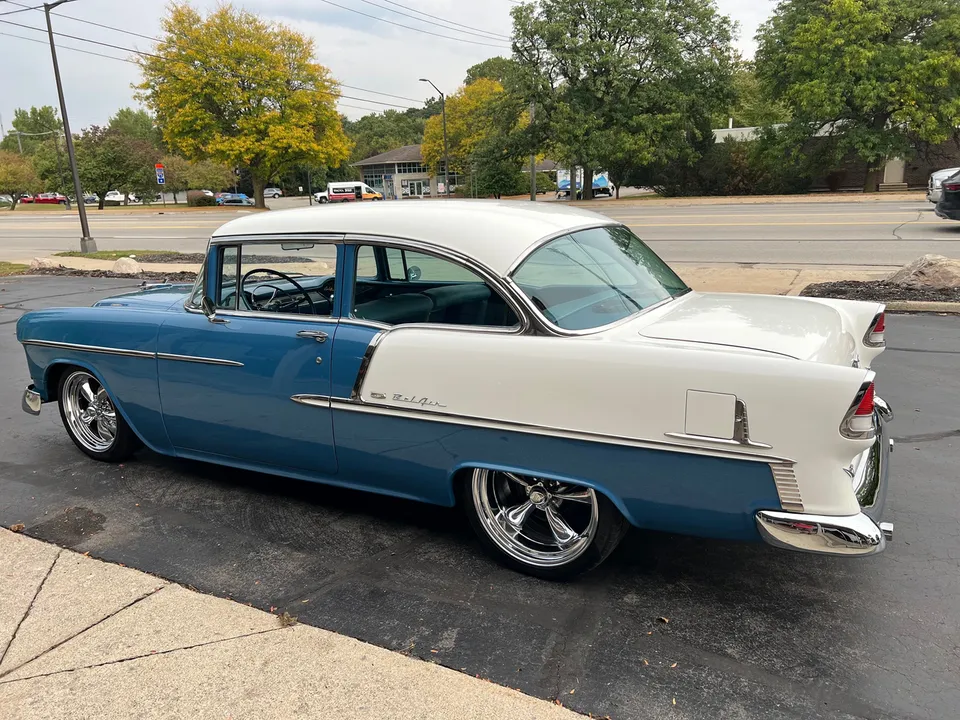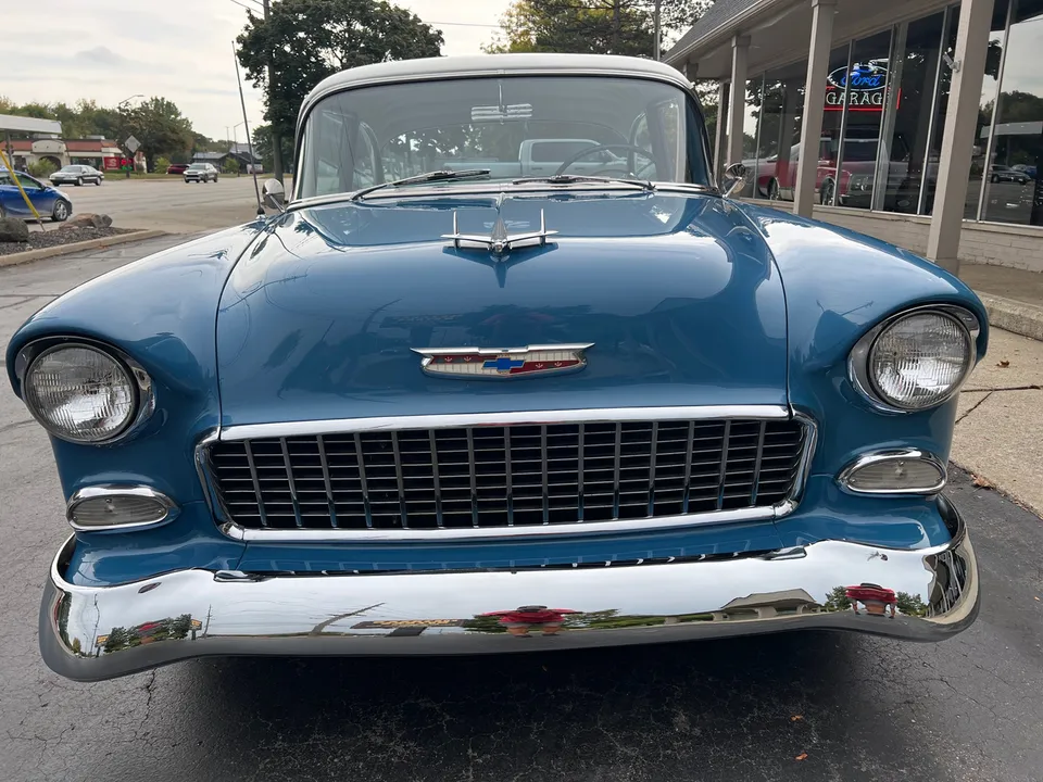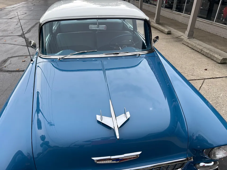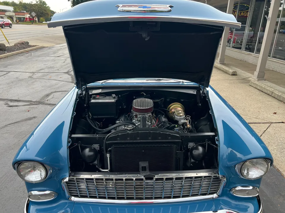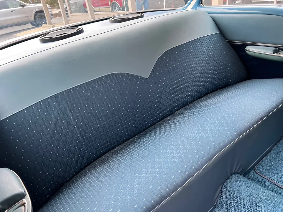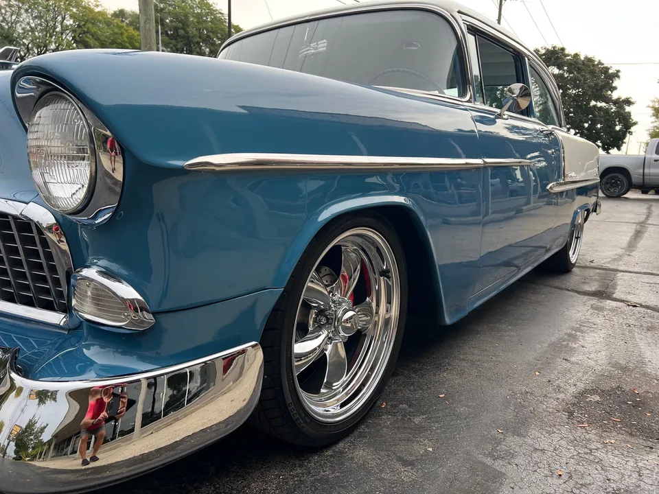 1800 miles on Body-Up Restoration, clean original Arkansas car, beautiful two-tone Glacier blue & India Ivory, factory two tone blue interior, 350 ci engine, Holley 4 bbl, polished aluminum intake, MSD Pro Billet distributor, ceramic headers, finned aluminum air cleaner & valve covers, aftermarket power steering, tubular upper & lower control arms, Wilwood power front disc brakes with slotted & drilled rotors, aftermarket air conditioning, 700R4 automatic overdrive transmission, factory bench seat, tilt column with Bel Air wheel, Classic Instruments gauge cluster, am radio, Flowmaster dual exhaust, California boxed frame, factory rear axle, 275/35ZR20 rear tires, 225/40ZR18 fronts, 18 & 20” chrome American Torque Thrust II wheels, factory jack with spare, EZ-Eye glass, California bumpers, Ready to Cruise!