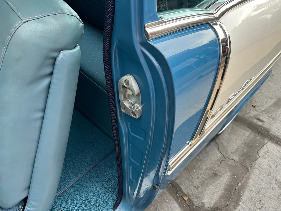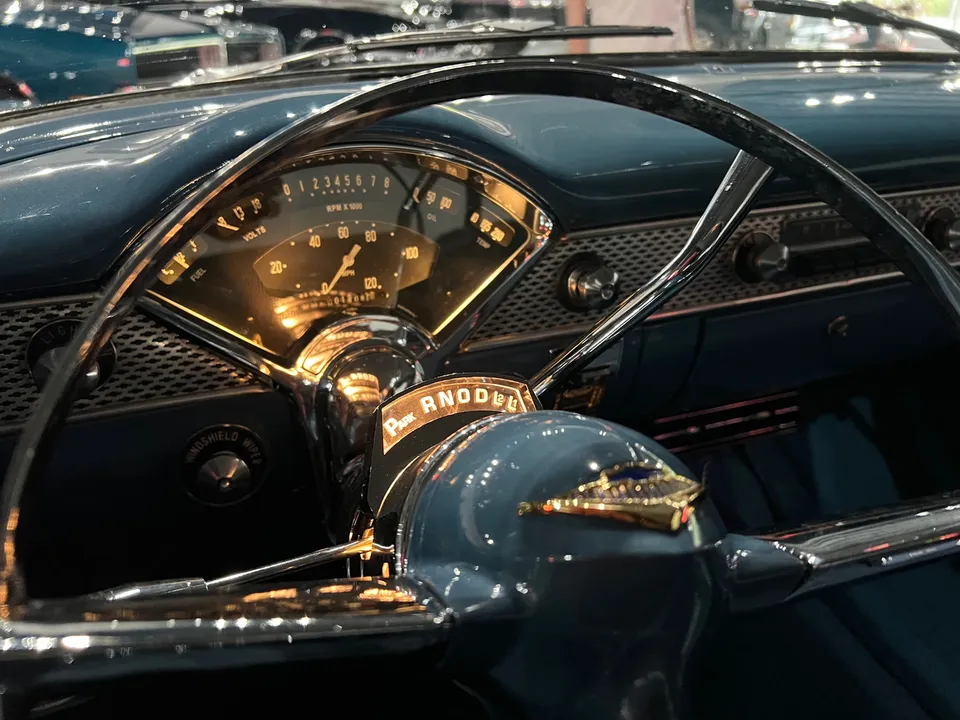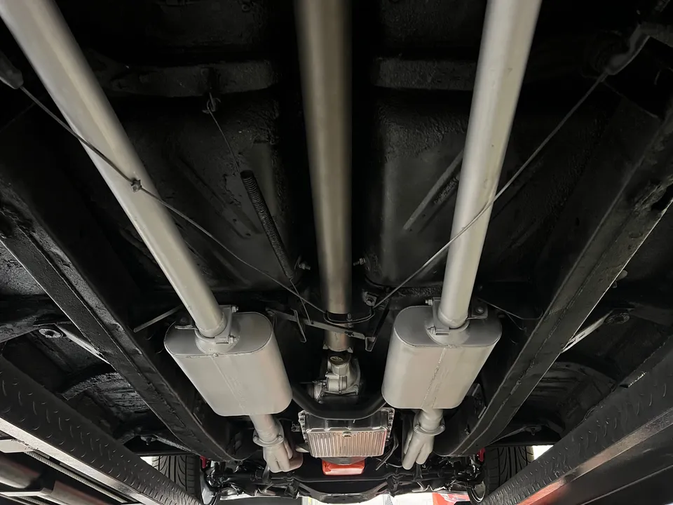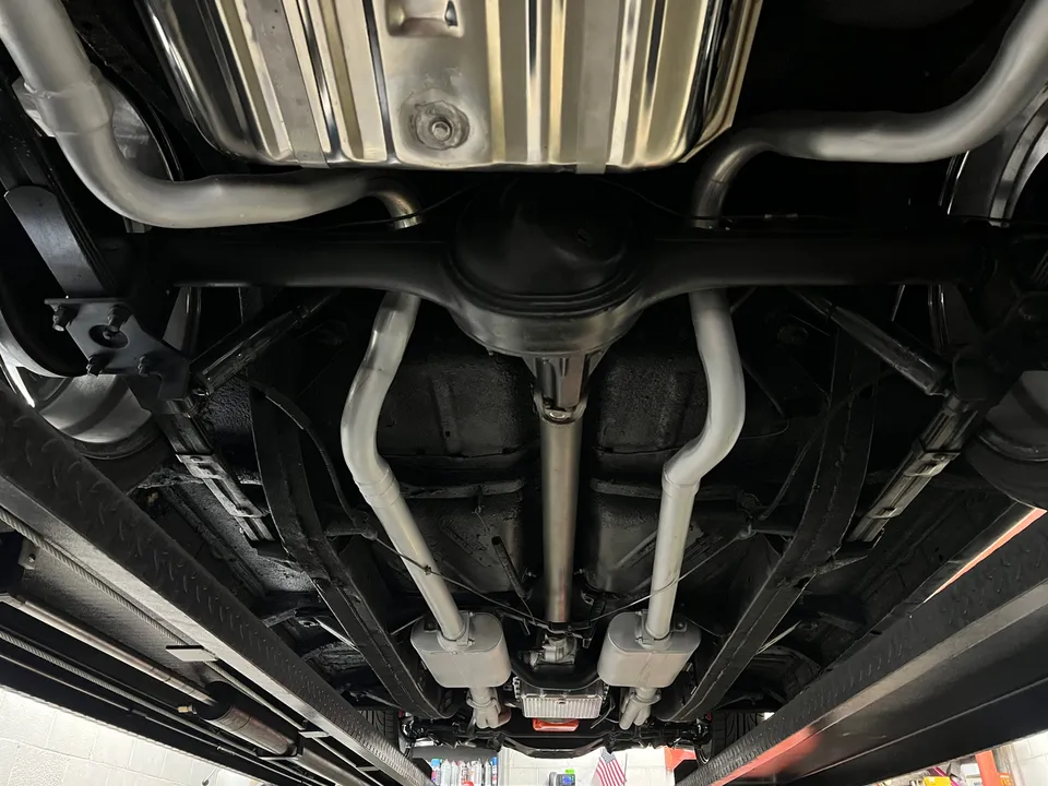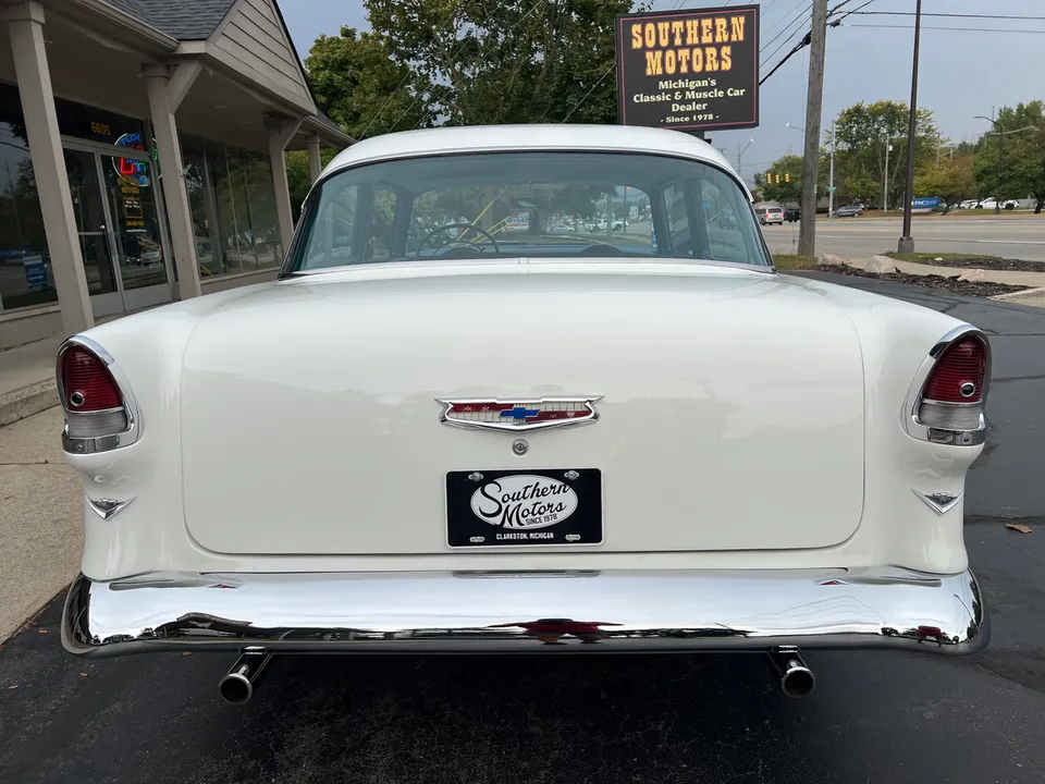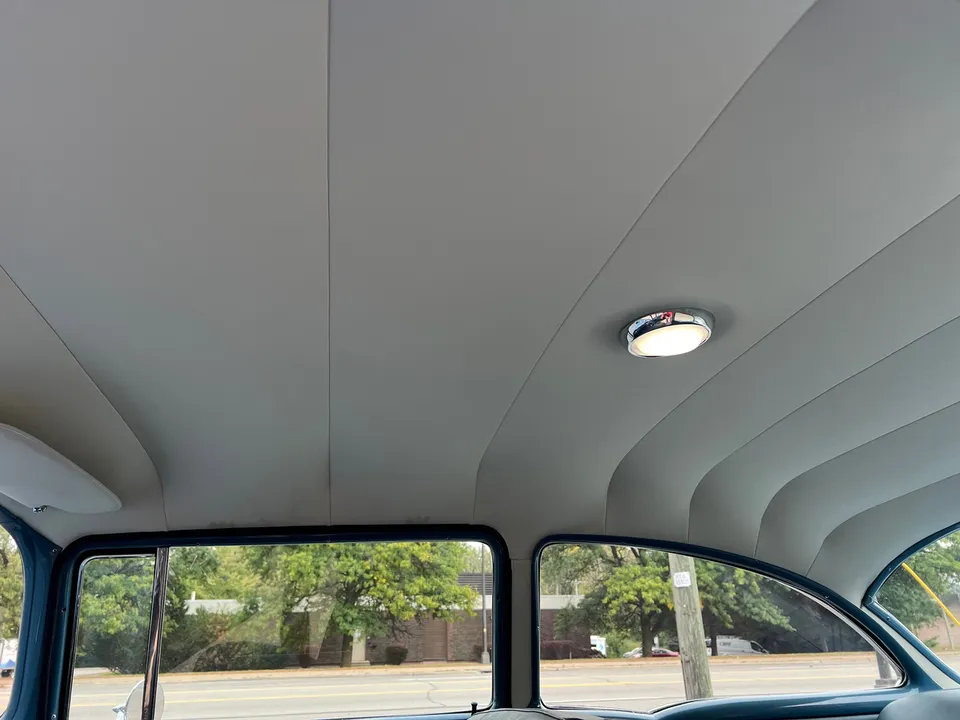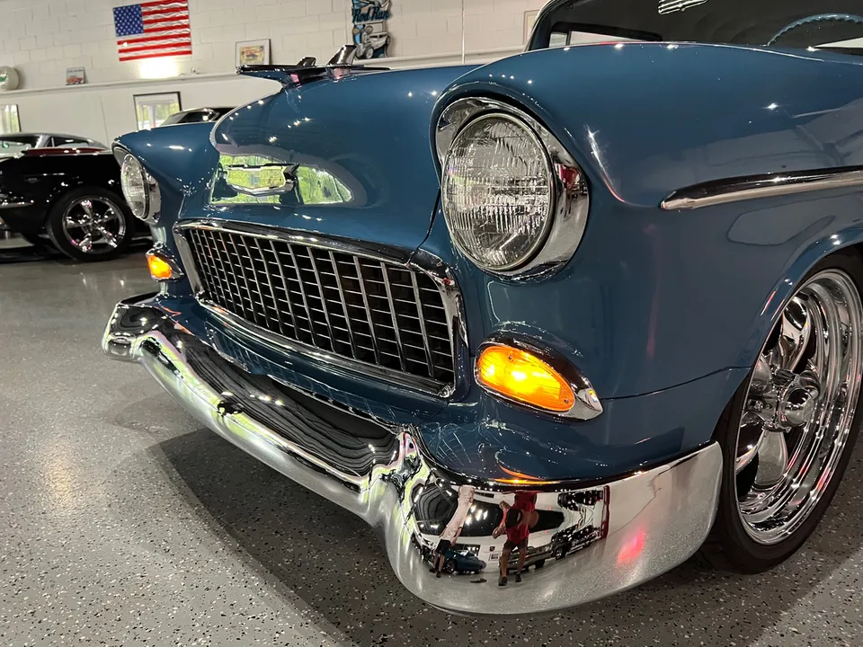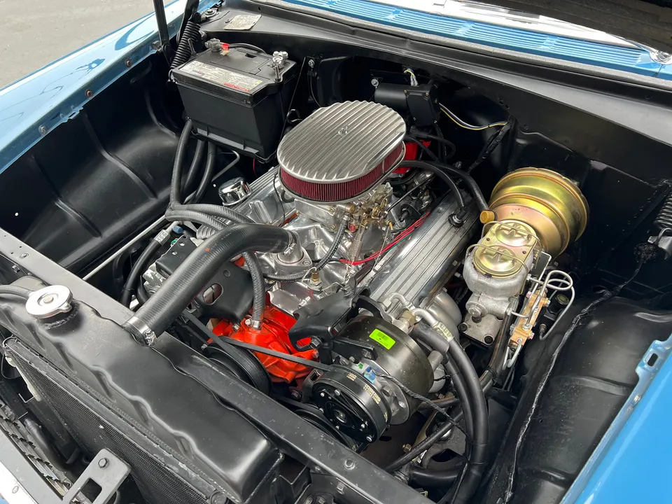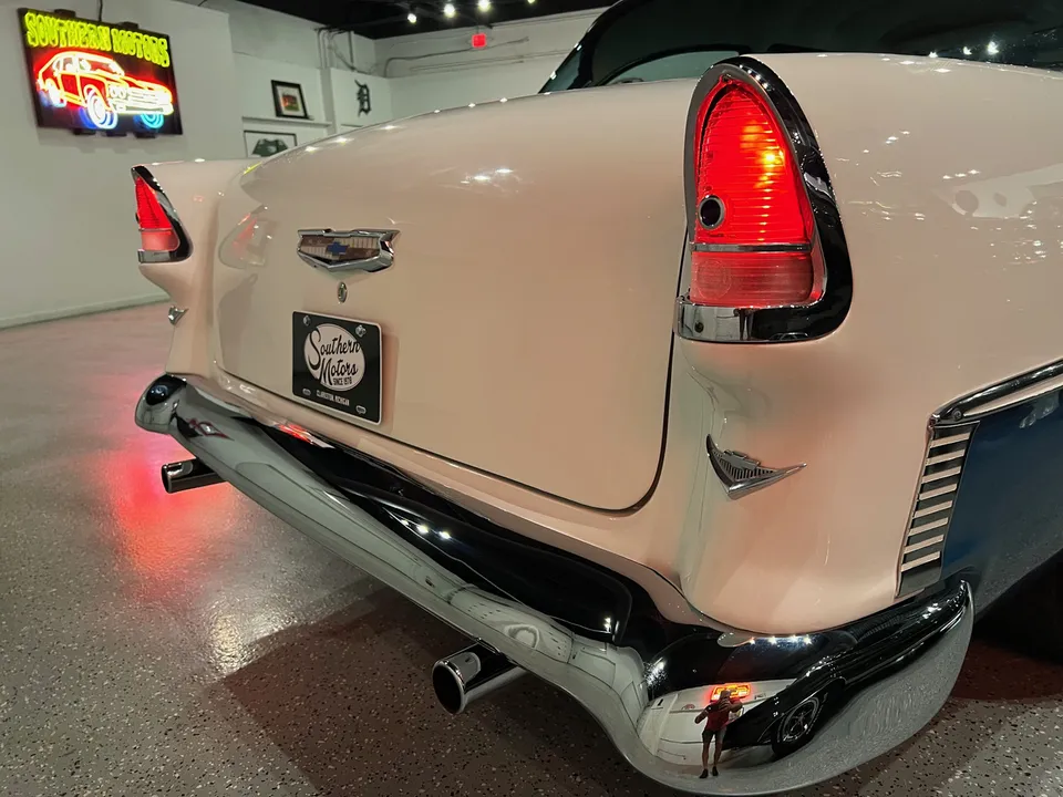 1800 miles on Body-Up Restoration, clean original Arkansas car, beautiful two-tone Glacier blue & India Ivory, factory two tone blue interior, 350 ci engine, Holley 4 bbl, polished aluminum intake, MSD Pro Billet distributor, ceramic headers, finned aluminum air cleaner & valve covers, aftermarket power steering, tubular upper & lower control arms, Wilwood power front disc brakes with slotted & drilled rotors, aftermarket air conditioning, 700R4 automatic overdrive transmission, factory bench seat, tilt column with Bel Air wheel, Classic Instruments gauge cluster, am radio, Flowmaster dual exhaust, California boxed frame, factory rear axle, 275/35ZR20 rear tires, 225/40ZR18 fronts, 18 & 20” chrome American Torque Thrust II wheels, factory jack with spare, EZ-Eye glass, California bumpers, Ready to Cruise!