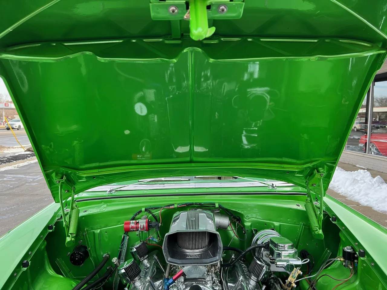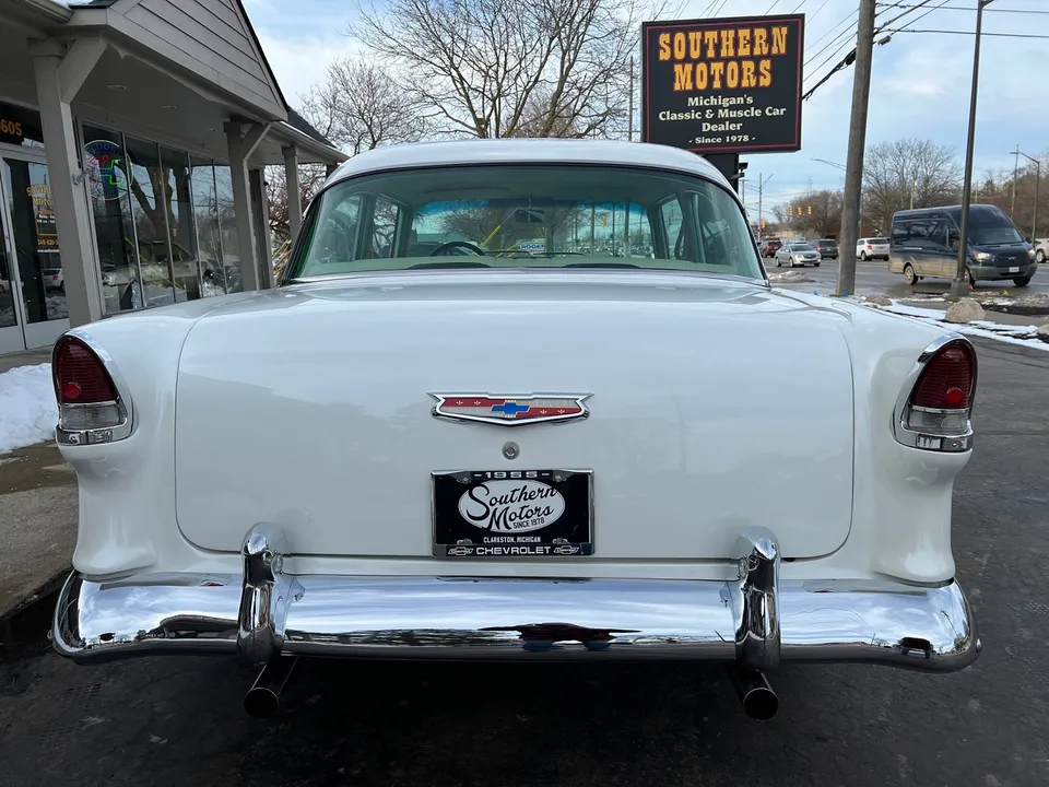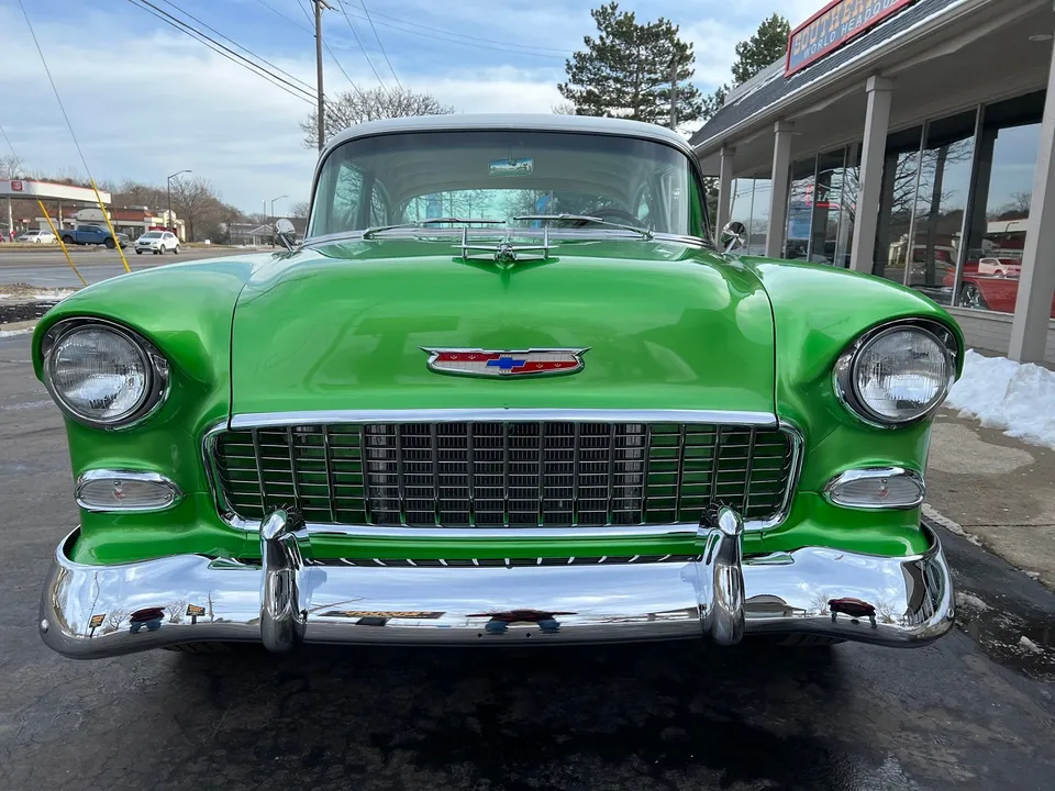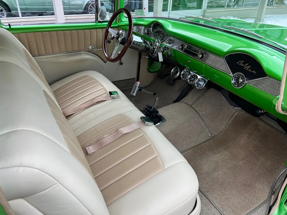 2 Owner Frame Off Restored Car, True (VC) Bel Air, stunning two tone House of Kolors Kandy Lime green metallic & pearl white, new Ciadella two tone tan leather interior, 383 ci stroker engine, Demon dual feed 4 bbl, polished Edelbrock Performer aluminum intake, Comp Mutha Thumpr camshaft, Trick Flow aluminum heads, Hedman ceramic headers, B&M billet air cleaner, Moroso billet valve covers, MSD ignition, power steering, power front disc brakes, aluminum radiator with flex fan & shroud, Muncie 4 speed manual transmission, bench seat, chrome tilt column with Grant wheel, factory dash, aftermarket tach & gauges, Hurst shifter with line loc, am-fm radio, Pypes X pipe stainless exhaust system, 12 bolt 3.55 limited slip rear end with Lakewood traction bars, 275/60R15 BF Goodrich Radial TA rear tires, 225/70R15 fronts, 15” Cragar S/S wheels, Show Quality!IN STOCK