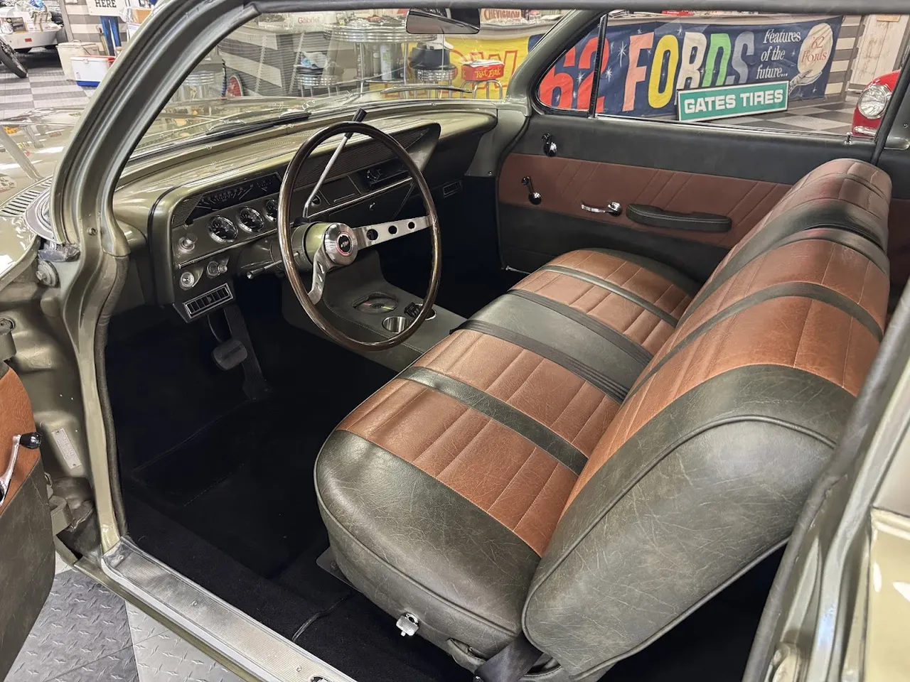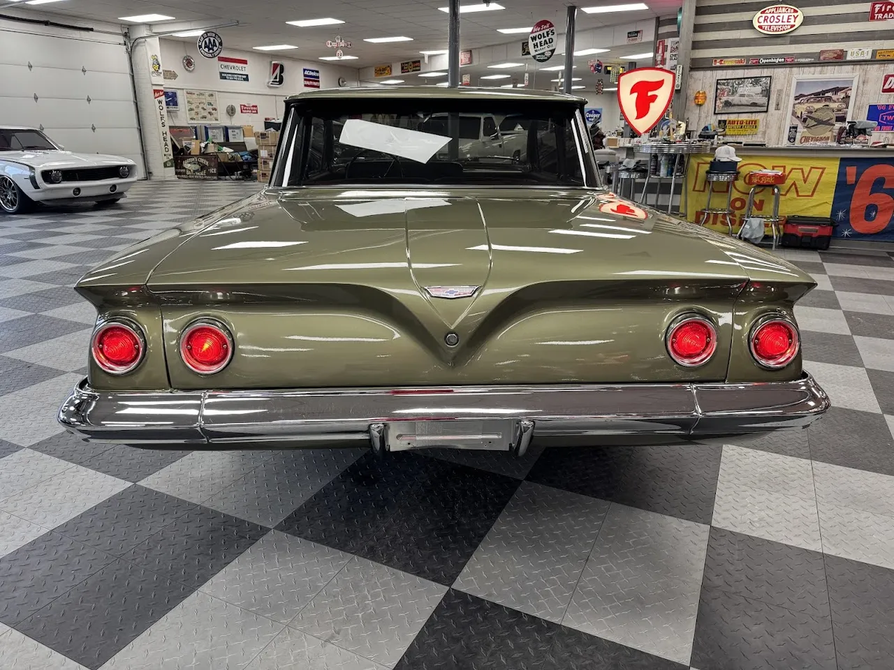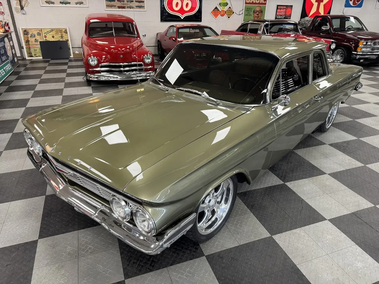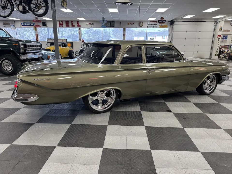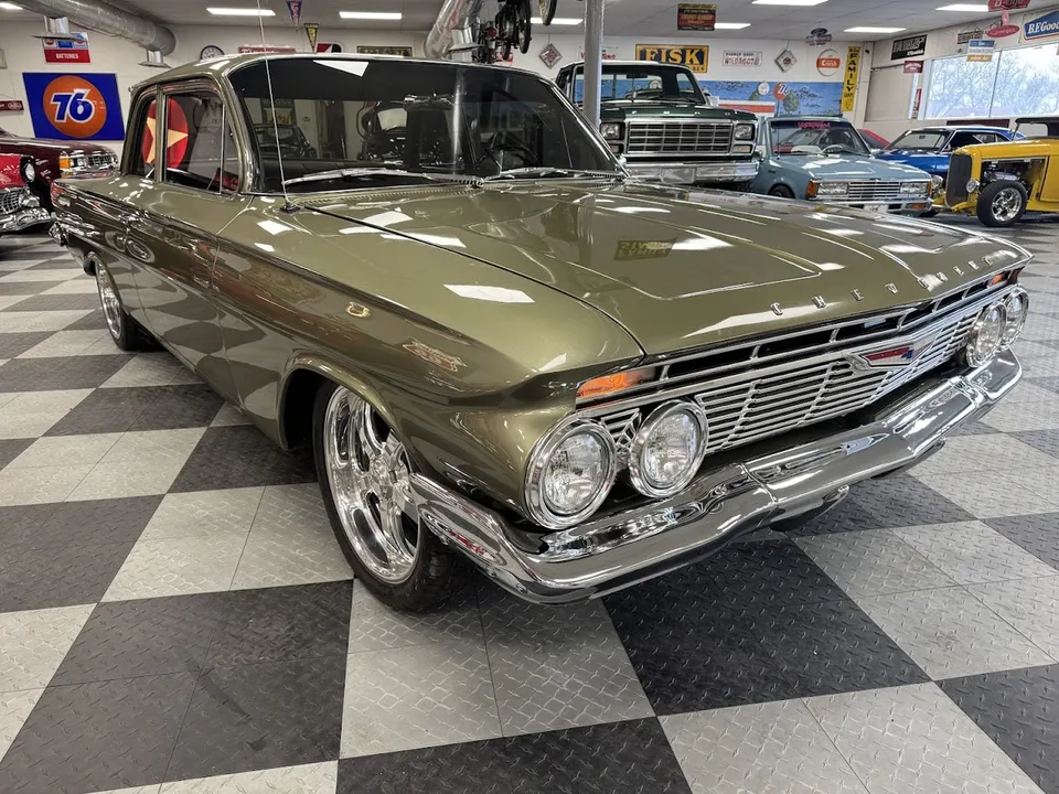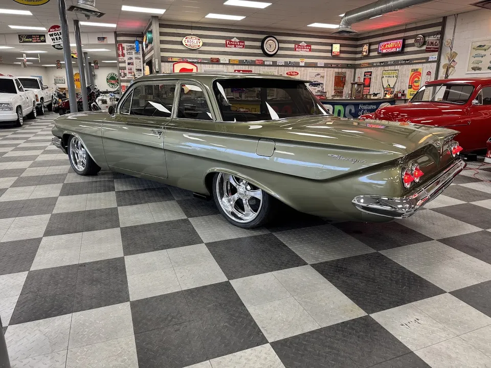 Coming Soon! 1961 Chevrolet Biscayne, Custom Built Restomod, stunning Sage green metallic paint, custom two tone leather interior, 350 ci engine, 700R4 automatic overdrive transmission, power steering, 4-wheel power disc brakes, air conditioning, full tubular suspension, Dakota gauges, Sport wheel, custom sound system, Schott wheels, finished trunk, Show Quality! $48,900