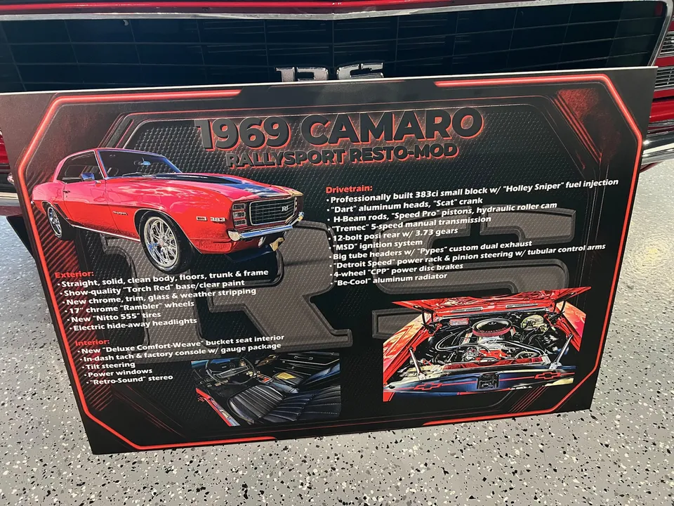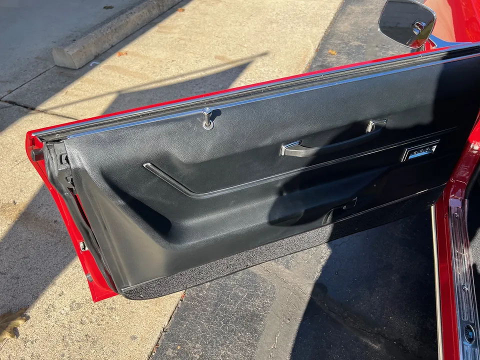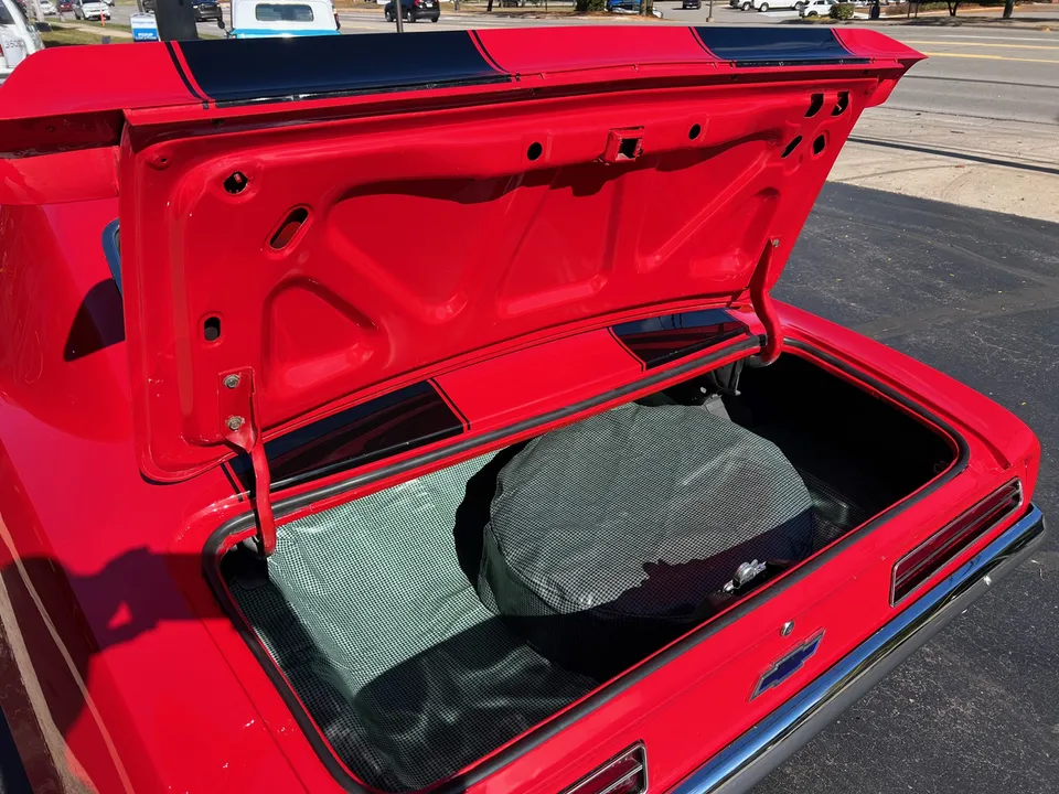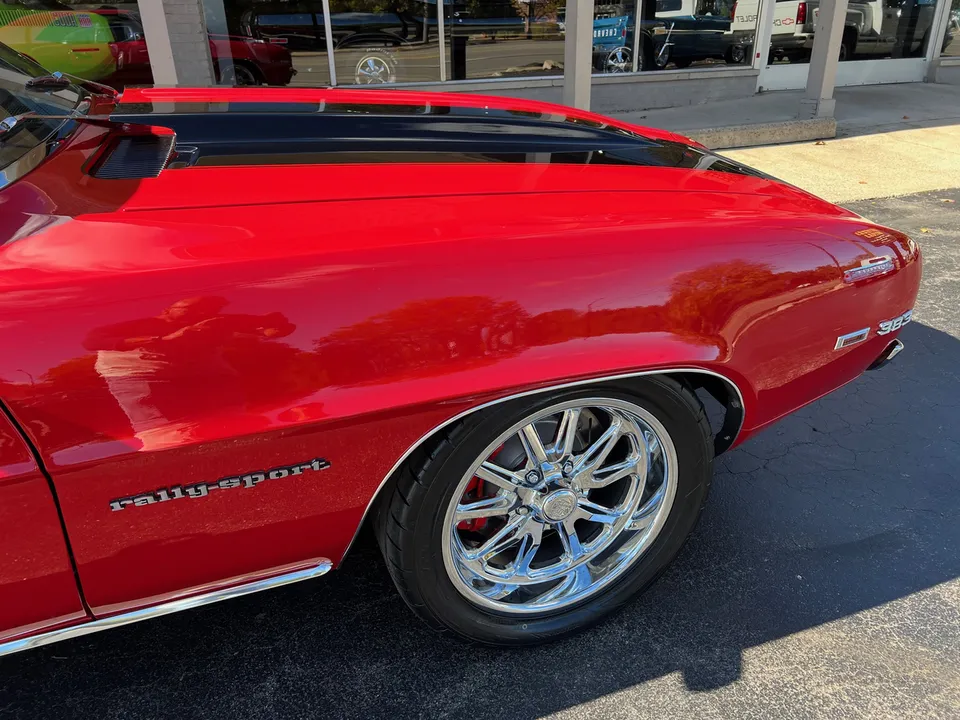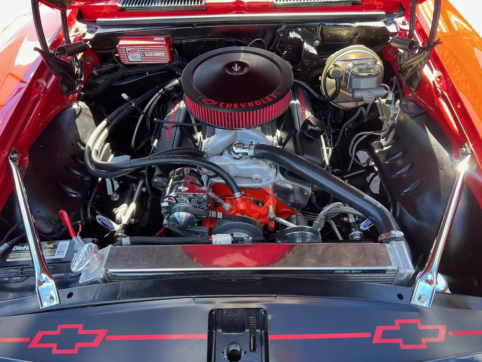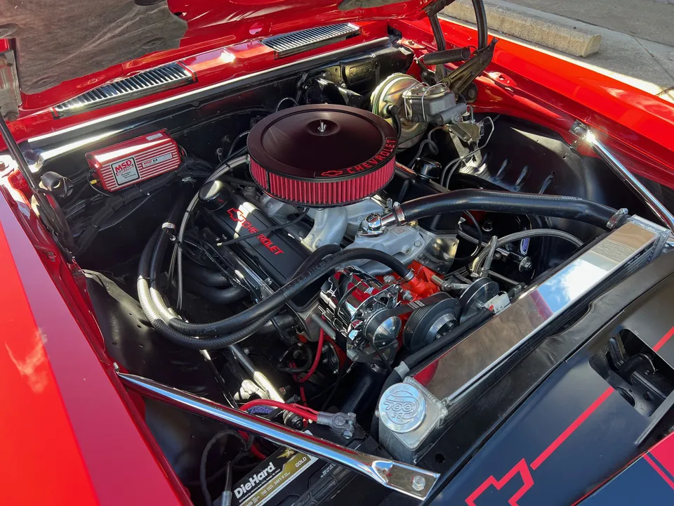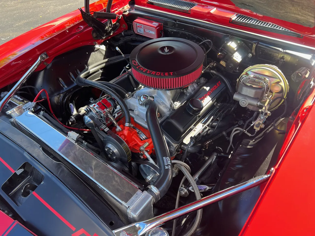 Complete Professionally Built Restomod, stunning Torch red paint, black striping, black Deluxe interior, professionally built 383 ci stroker engine with Holley Sniper EFI, Edelbrock Performer aluminum, Dart aluminum heads, scat crank, H-beam rods, Speed Pro pistons, hydraulic roller camshaft, headers, MSD ignition, Chevrolet air cleaner & valve covers, Detroit speed tubular control arms, power CCP 4-wheel disc brakes, Detroit Speed rack & pinion steering, billet pulley’s, Be Cool aluminum radiator with dual electric fans, Tremec 5 speed manual transmission, bucket seats with center console, tilt column, factory tach & gauges, power windows, Retrosounds radio, Pypes stainless X-pipe dual exhaust, Perfect Launch 12 bolt 3.73 rear axle, 255/45ZR17 Nitto rear tires, 245/45ZR17 fronts, 17" chrome US Mag wheels, Detroit Speed hideaway headlights, cowl hood, front & rear spoilers, ceramic coated, Show or Go!