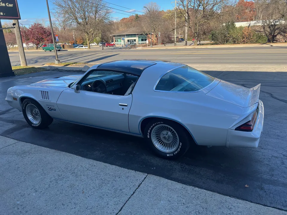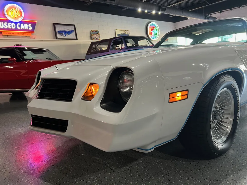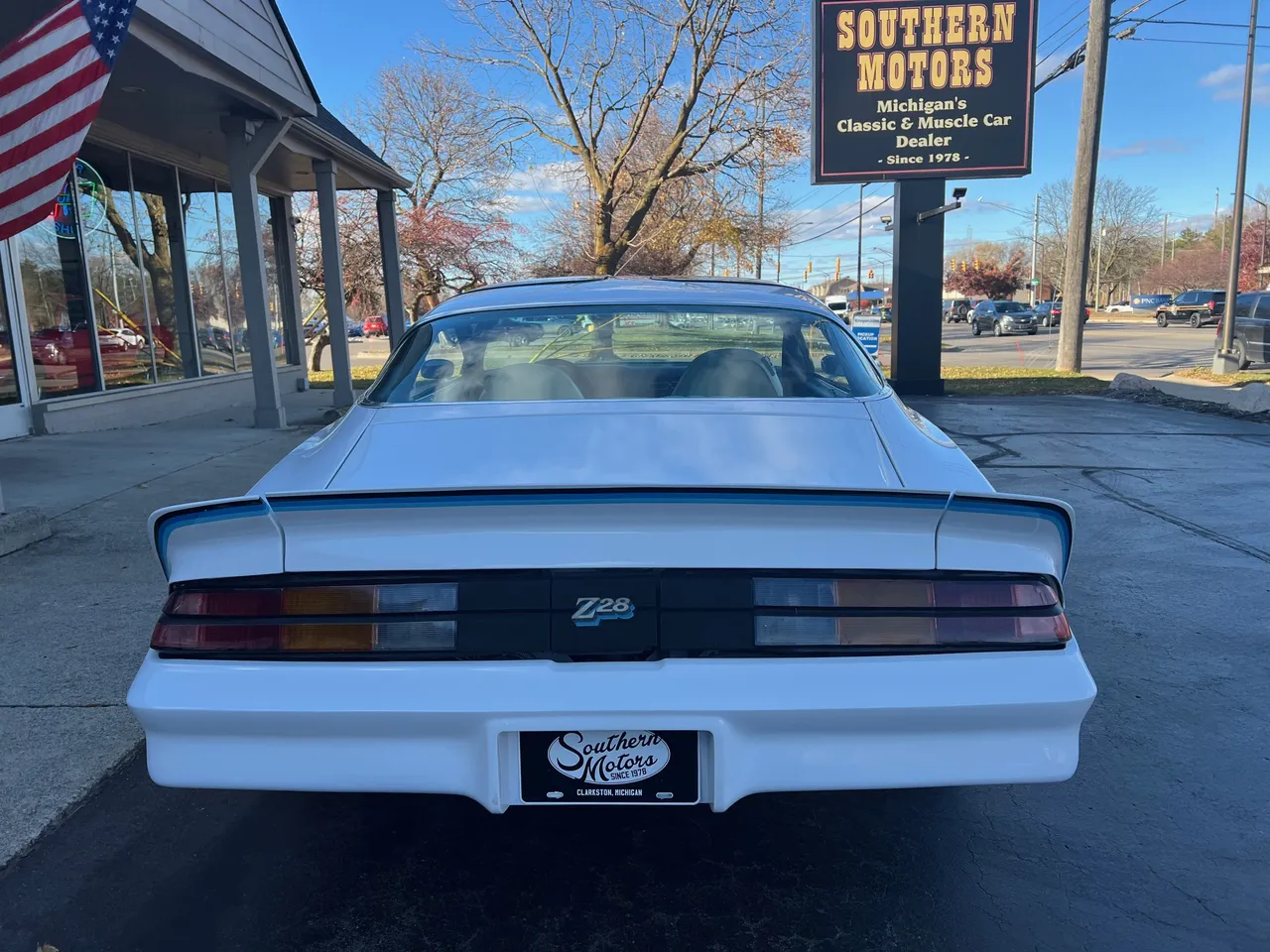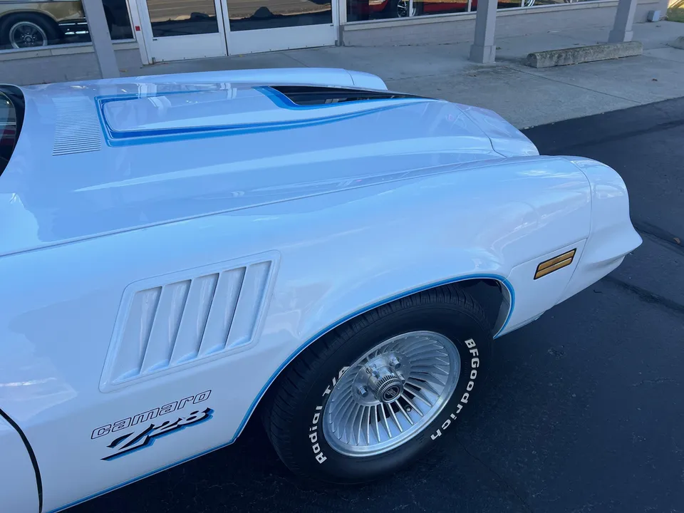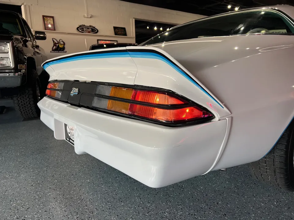 1,100 miles Rotisserie Restoration, clean original Texas car, true Z28, factory (11) Antique white, factory (11) white& vinyl interior, balanced 383 ci/429 hp stroker engine, Holley dual feed 4 bbl, Edelbrock Performer aluminum intake, 280 lift camshaft, roller rockers, steel crank, Keith Black 10-1 pistons, Edelbrock E Force aluminum heads, Hedman ceramic headers, HEI distributor, chrome air cleaner & valve covers, power steering, power disc brakes, Vintage air conditioning, aluminum radiator with shroud, built 700R4 automatic overdrive transmission with B&M 2400 converter, factory bucket seats with center console, Automatic tach & gauges, Kenwood sounds system, remote driver’s mirror, Flowmaster H-pipe dual exhaust, factory 10 bolt 3.42 limited slip rear axle with F41 suspension, 235/60R15 BF Goodrich Radial T/A rear tires, factory 15” aluminum wheels, T-Tops, dual sport mirrors, original build sheet & docs, oxidized primer floors, Ready to Cruise!