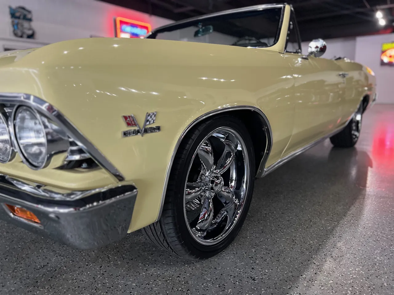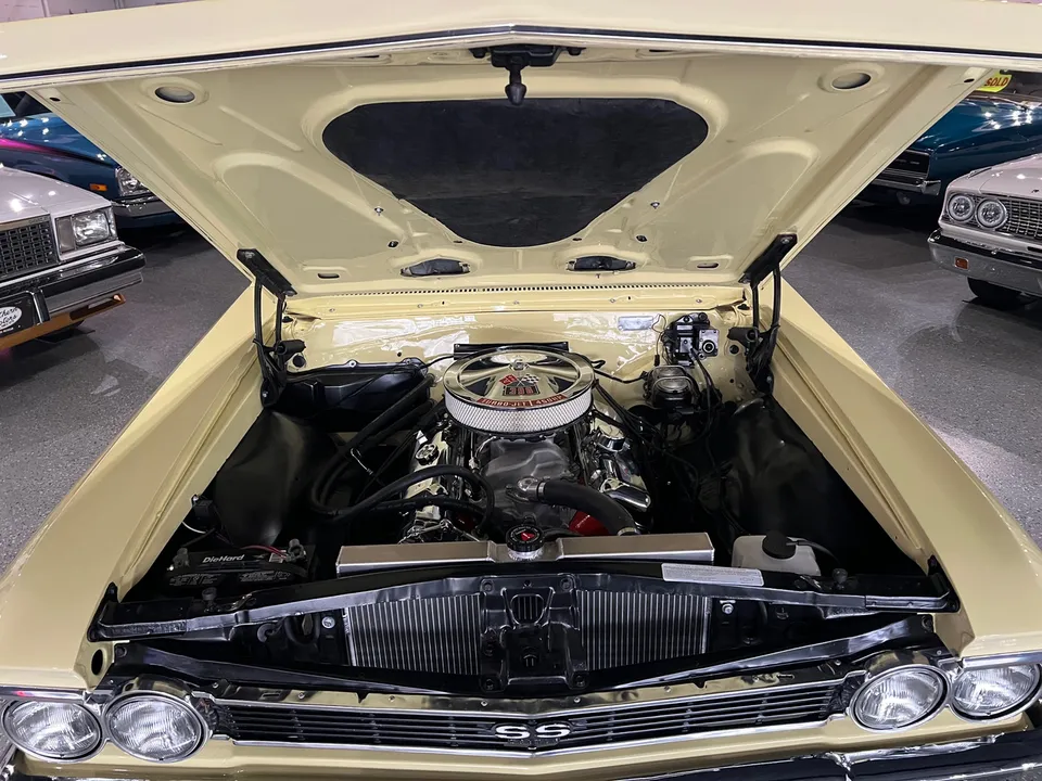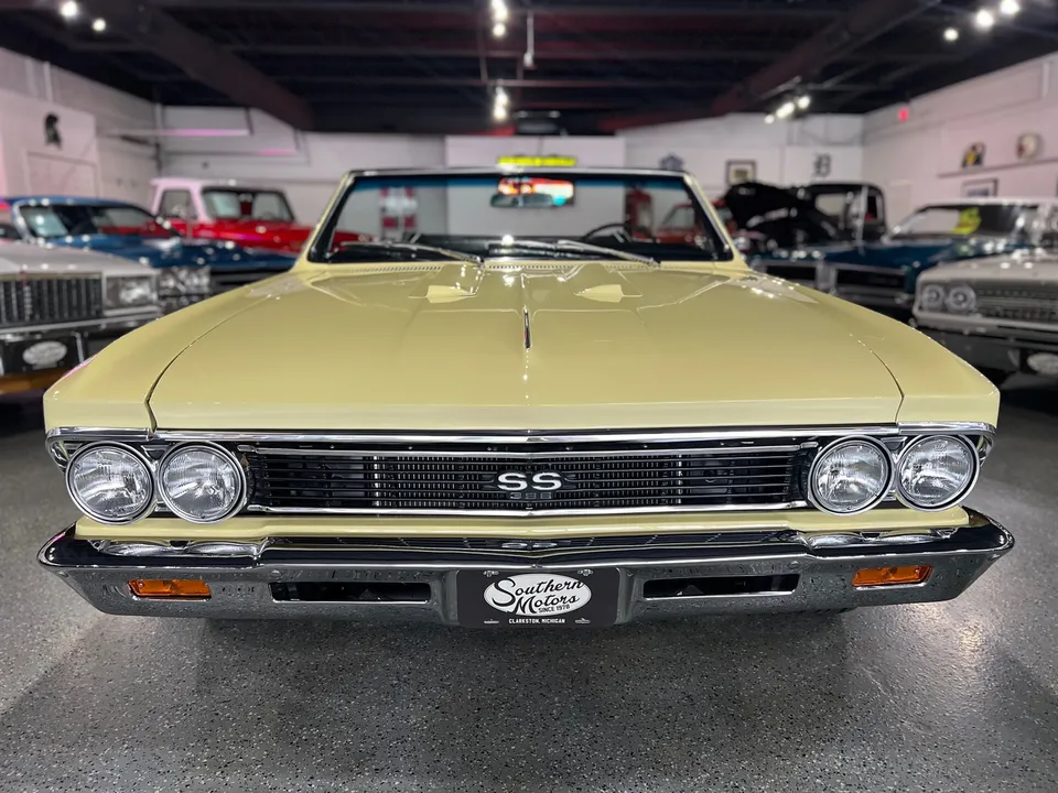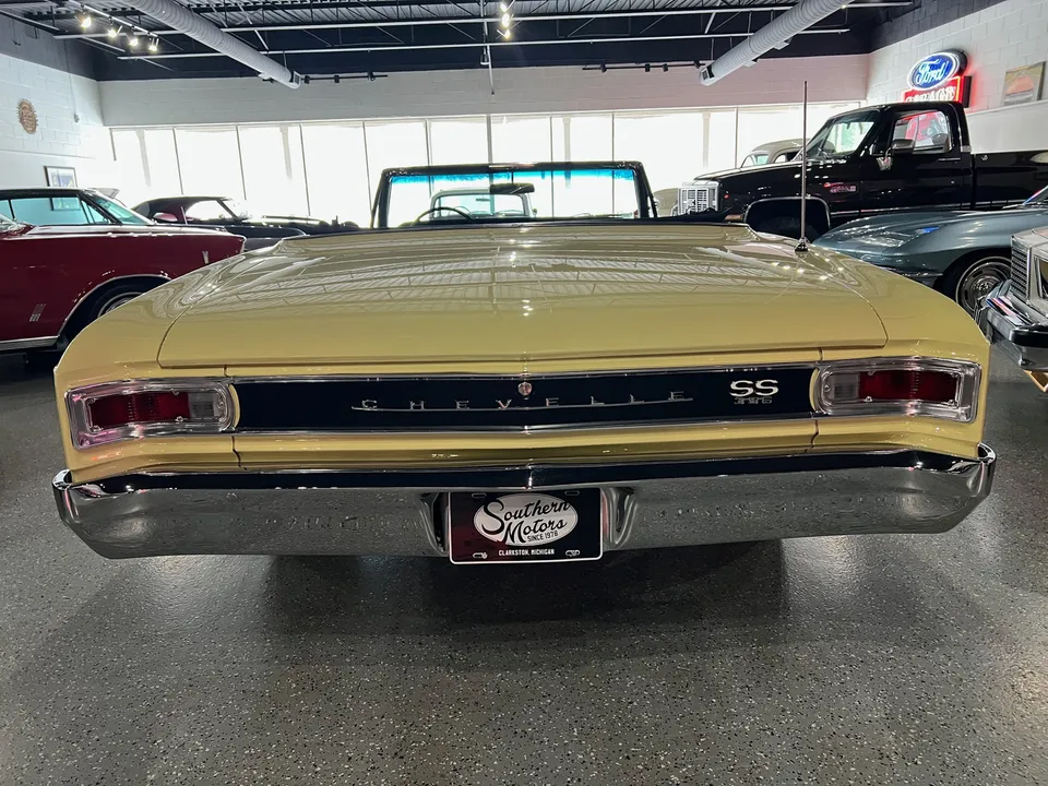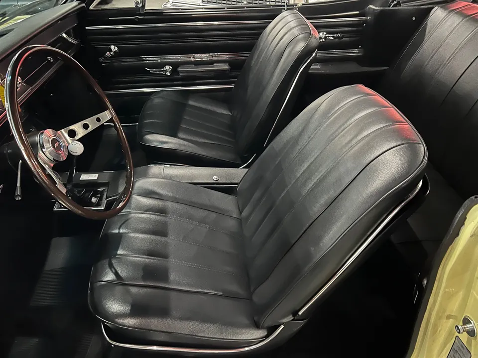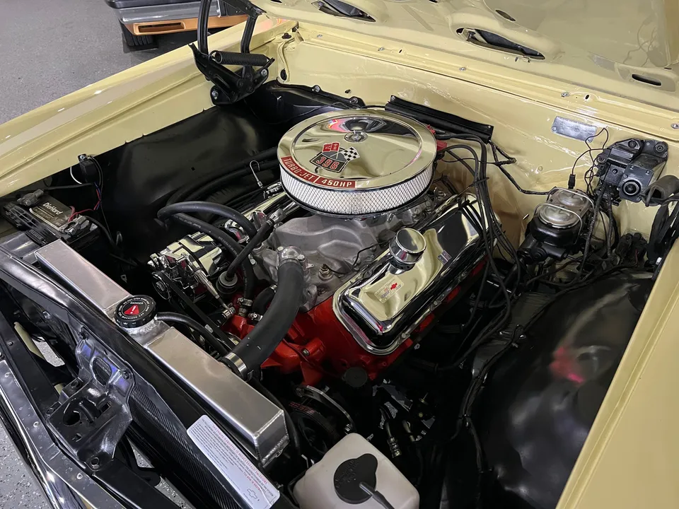 Clean Georgia car, Recent Frame-Up Restoration, SS tribute, beautiful Lemonwood yellow paint, black vinyl interior, black convertible top, 396 ci engine, Muncie 4 speed manual transmission, Brawler Performance dual feed 4 bbl, aluminum intake, mild camshaft, headers, chrome air cleaner & valve covers, HEI distributor, power steering, front disc brakes, aluminum radiator with dual electric fans, bucket seats with center console, Sport steering wheel, factory dash, aftermarket gauges, Sony am-fm radio, power top, Flowmaster dual exhaust, 12 bolt 3.23 rear axle, factory jack with spare, 245/40ZR20 rear tires, 225/40ZR18 fronts, 18 & 20” chrome Coys wheels, Super Sport hood & trim, One Clean Bowtie!