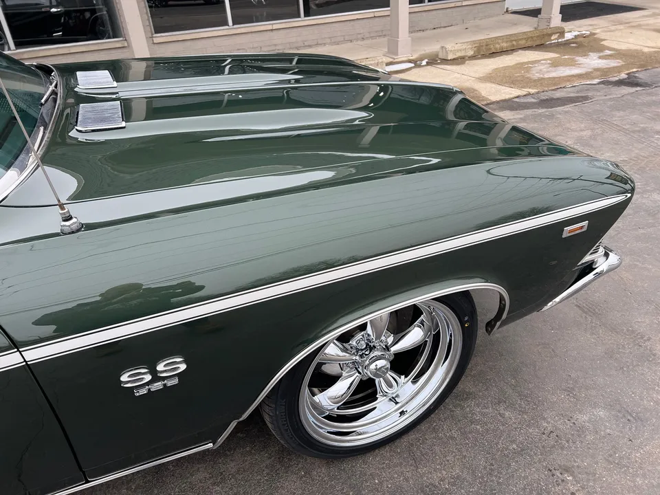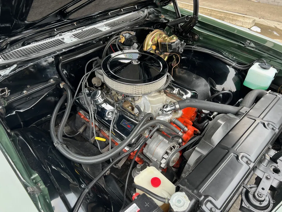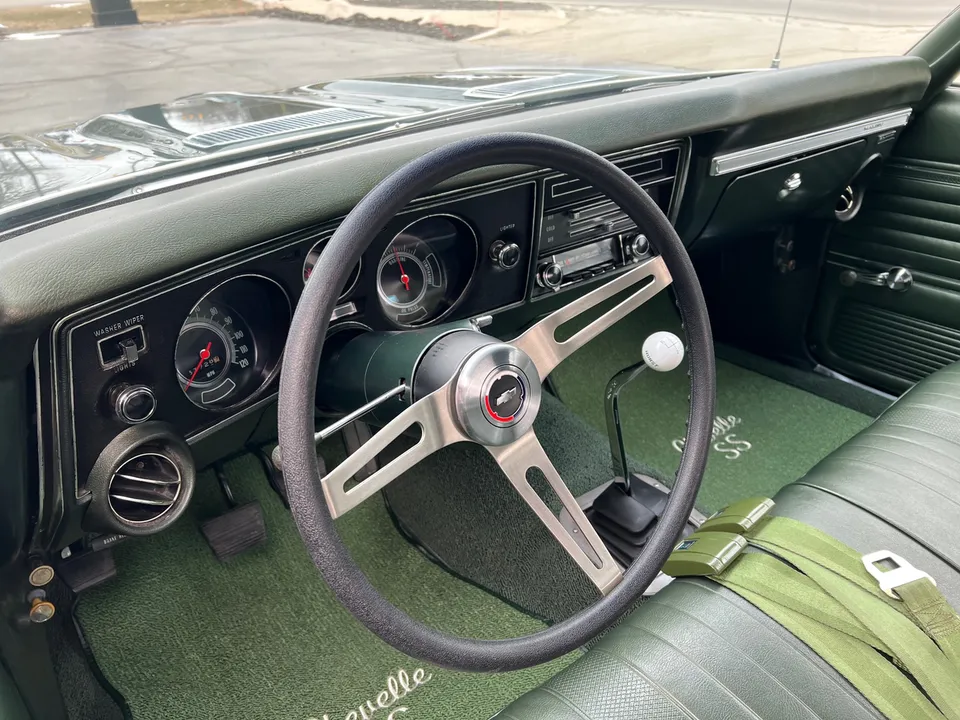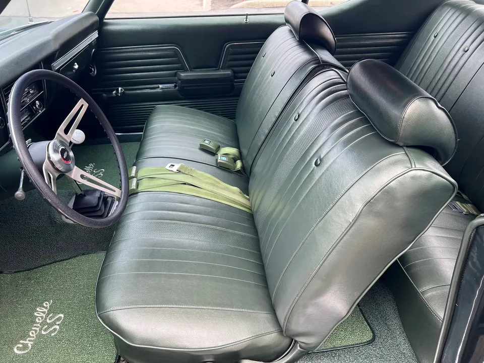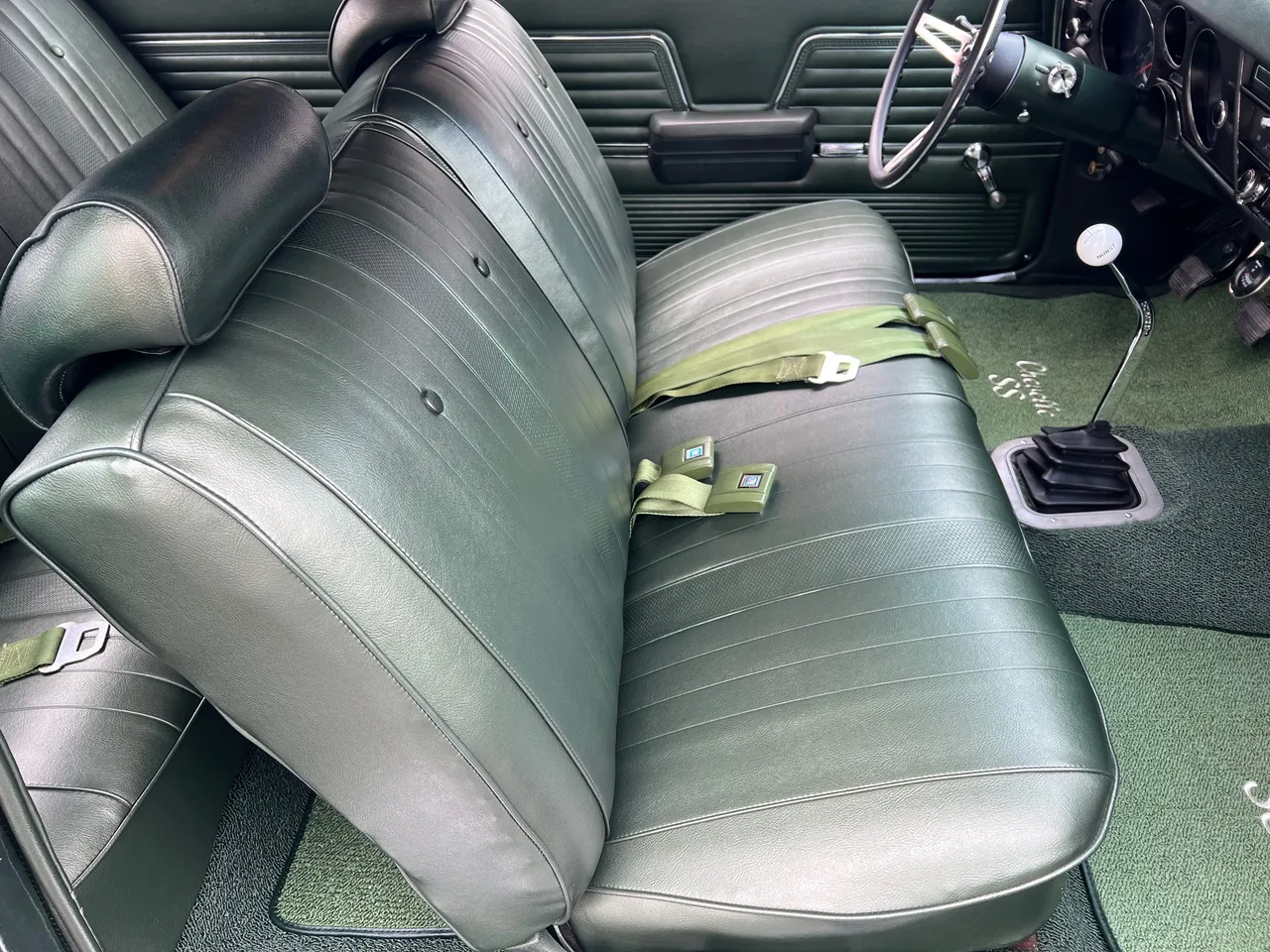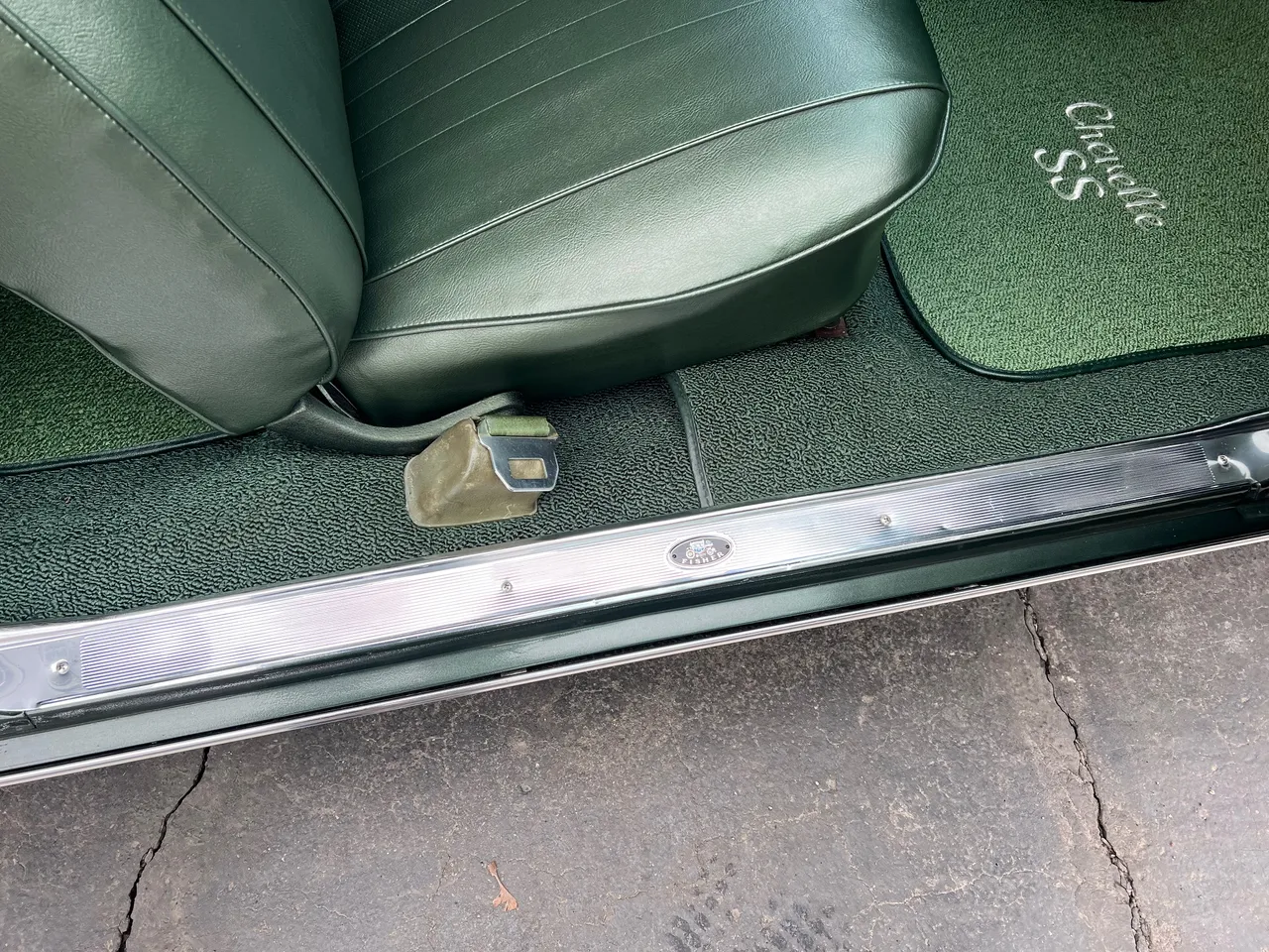 Recent Frame-Off Restoration, stunning Fathom green metallic paint, white SS striping, dark green vinyl interior, 454 ci engine, 4 speed manual transmission, Edelbrock 4 bbl, Edelbrock aluminum intake, mild camshaft, factory exhaust manifolds, chrome air cleaner & valve covers, HEI distributor, power steering, power 4-wheel disc brakes, factory bench seat, factory dash, Sport wheel, Delco am radio (aftermarket radio in glove box), Hurst shifter, Flowmaster dual exhaust, 12 bolt 3.73 limited slip rear axle, 18 & 20” chrome American Racing Torque Thrust wheels, 275/40R10 rear tires, 225/45R18 fronts, Holley Retrobright headlights, Soft Ray glass, One Bad Bowtie!