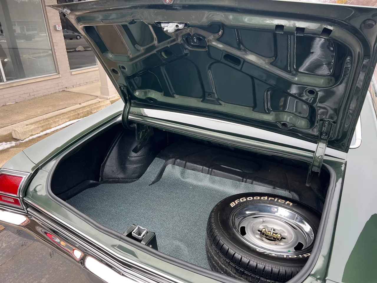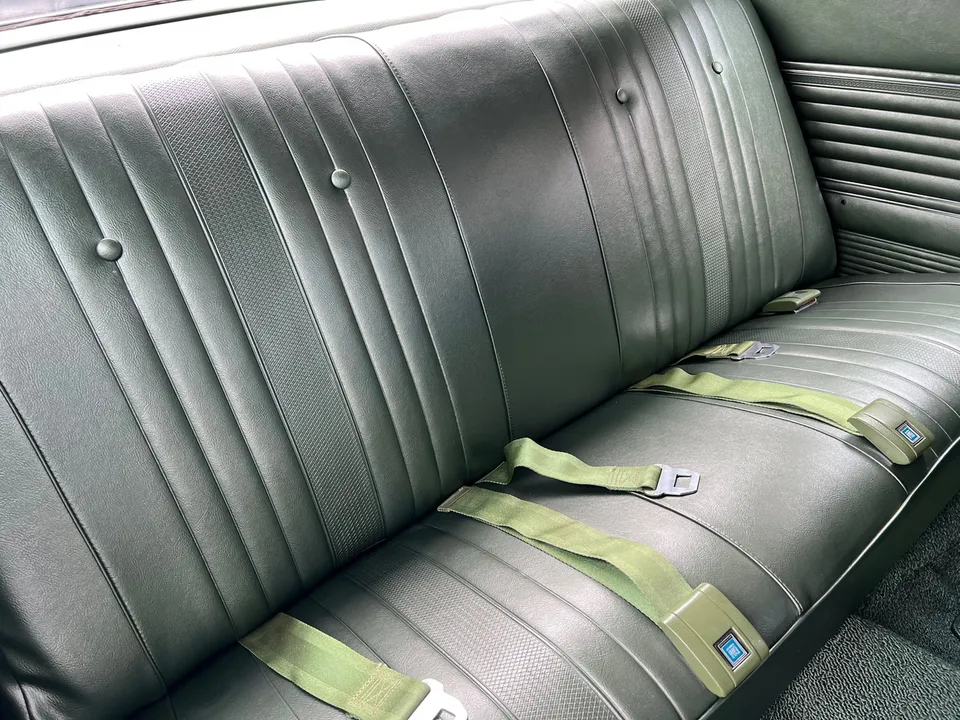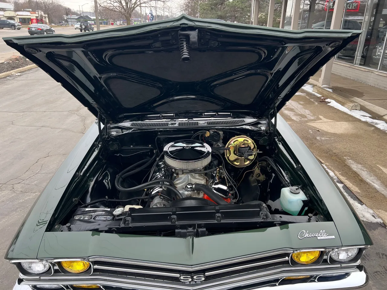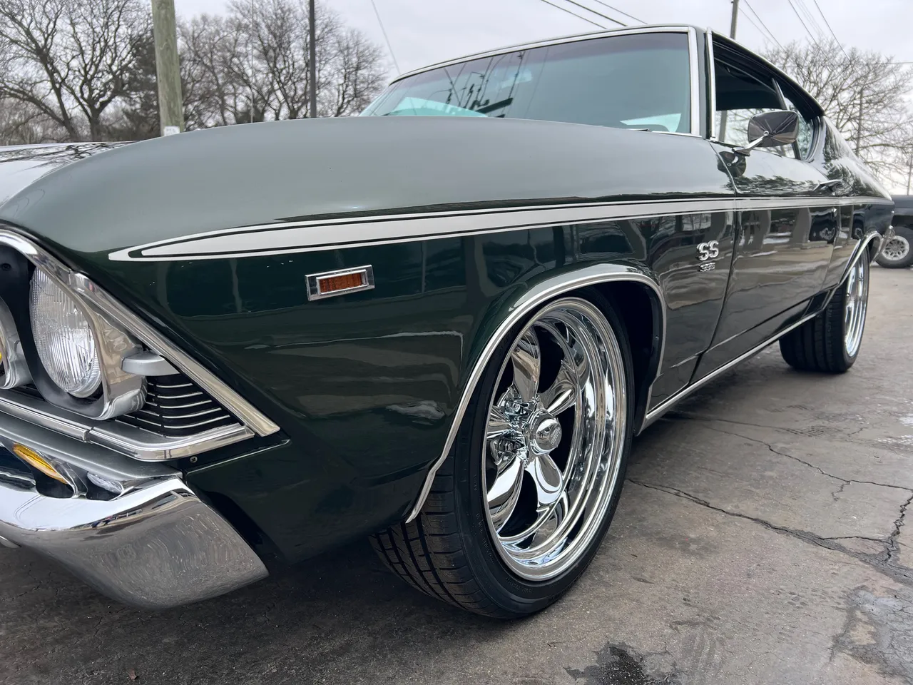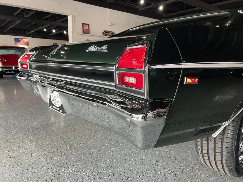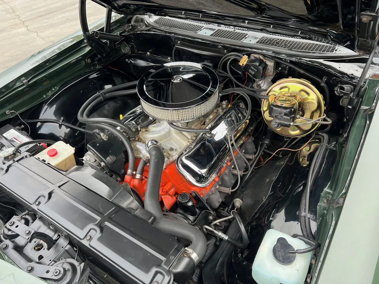 Recent Frame-Off Restoration, stunning Fathom green metallic paint, white SS striping, dark green vinyl interior, 454 ci engine, 4 speed manual transmission, Edelbrock 4 bbl, Edelbrock aluminum intake, mild camshaft, factory exhaust manifolds, chrome air cleaner & valve covers, HEI distributor, power steering, power 4-wheel disc brakes, factory bench seat, factory dash, Sport wheel, Delco am radio (aftermarket radio in glove box), Hurst shifter, Flowmaster dual exhaust, 12 bolt 3.73 limited slip rear axle, 18 & 20” chrome American Racing Torque Thrust wheels, 275/40R10 rear tires, 225/45R18 fronts, Holley Retrobright headlights, Soft Ray glass, One Bad Bowtie!