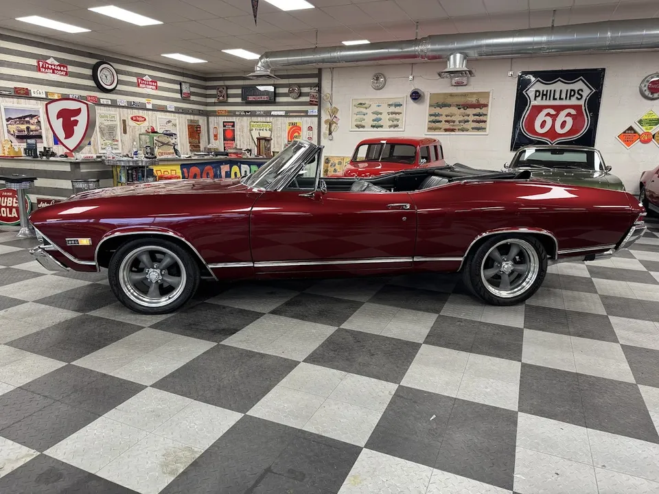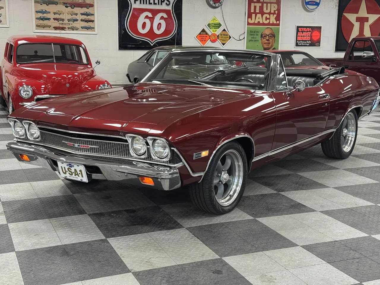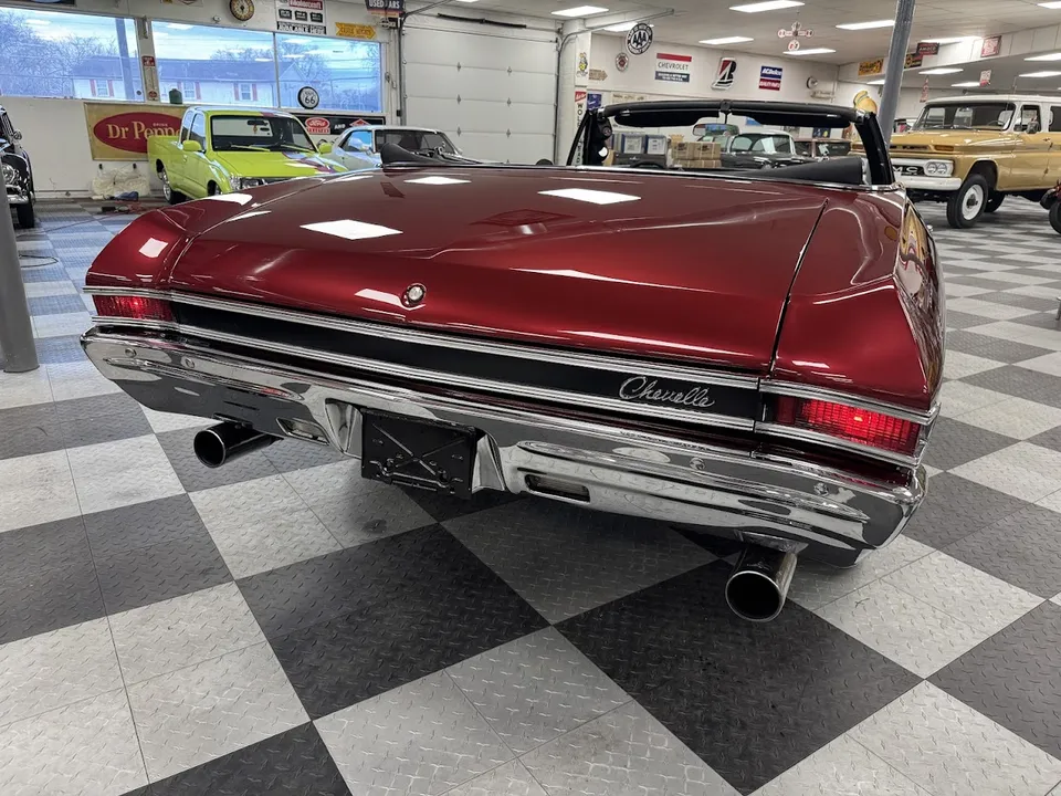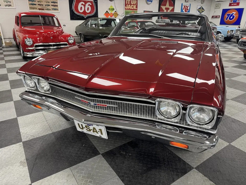Coming Soon! 1968 Chevrolet Chevelle Malibu Convertible, stunning factory (N) Cordovan Maroon metallic, factory Black vinyl interior, pounding 383 ci stroker engine, 700R4 automatic overdrive transmission, power steering, power disc brakes, factory bench seat interior, stock dash & gauges, Sport steering wheel, added tach and a pillar gauge pod, power top, AM/FM stereo, 12 Bolt 3.73 posi rear axle w/ ladder bars, 18” American Racing Torque Thrust D wheels, Ready to Cruise! $48,900