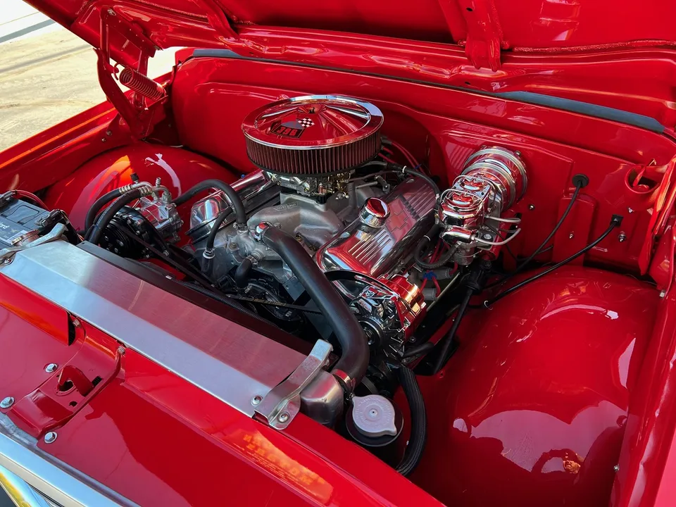 4400 miles on Complete Frame Off Restoration, clean Georgia truck, beautiful Flame red paint, new red Hounds Tooth interior, 396 ci roller engine, Holley dual feed 4 bbl, Comp roller camshaft & roller rockers, Weiand Stealth aluminum intake, aluminum heads, chrome air cleaner, billet valve covers, HEI distributor, ceramic headers, power steering, power front disc brakes, Vintage A/C, aluminum radiator with dual electric fans, 400 turbohydramatic transmission, factory bench seat, Phantom tach & gauge cluster, Retrosounds radio, tilt column with Sport steering wheel, padded dash, Borla dual exhaust, 12 bolt 3.73 Eaton posi rear end, 4 corner QA1 adjustable shocks, front & rear sway bars, 295/40R20 Toyo rear tires, 245/45R20 fronts, 20” chrome REV wheels, oak bed, custom fuel tank, 1-piece side glass, cowl hood, Rebel wire harness, One Bad Bowtie!IN STOCK