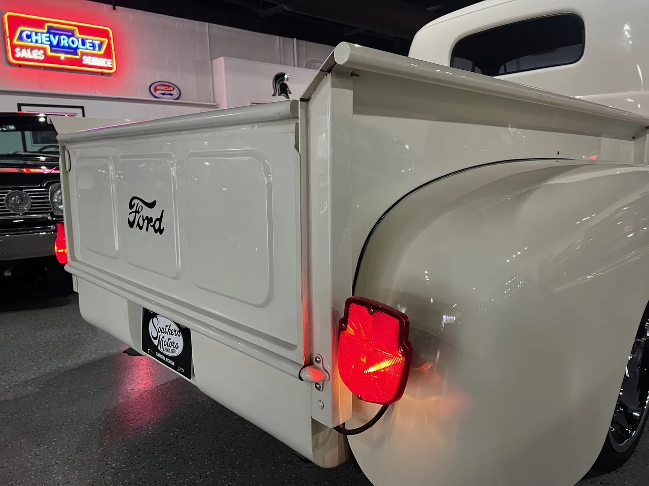 Clean Tennessee truck, Custom Built Street Rod, beautiful Classic white paint, custom grey leather interior, 350 ci engine, Edelbrock 4 bbl, polished aluminum intake, Comp camshaft, headers, MSD Street Fire ignition with Pro Billet distributor, finned aluminum air cleaner & valve covers, Camaro front sub-frame, power steering, power front disc brakes, air conditioning, aluminum radiator, 350 turbohydramatic transmission, custom stitched bench seat, chrome tilt column with Lecarra wheels, Dakota digital gauge cluster, custom sound system, power windows & locks, cruise control, Flowmaster dual exhaust, 10 bolt 3.23 rear axle, 245/45ZR20 rear tires, 245/40ZR18 fronts, 18 & 20” chrome Boyd wheels, custom fuel tank, custom oak bed, dual chrome mirrors, Ready to Cruise!