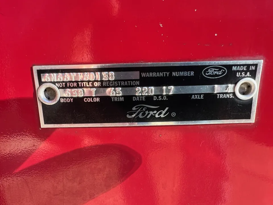 True Survivor, 1 owner car with 32,000 original miles, original (T) red paint, original (65) red interior, factory (Y) 390 ci engine, factory 2 bbl, factory intake & exhaust manifolds, chrome air cleaner & finned aluminum valve covers (comes with originals), power steering, aluminum radiator (comes with original), factory C6 automatic transmission, , factory bench seat, original AM radio, remote driver's mirror, original seat belts, factory dash & gauges, factory exhaust, factory 3.00 rear axle, 225/70R15 white wall tires, factory 15” wheels with covers, factory jack with spare, original owner’s manual, recent mechanical restoration, Collector Quality!