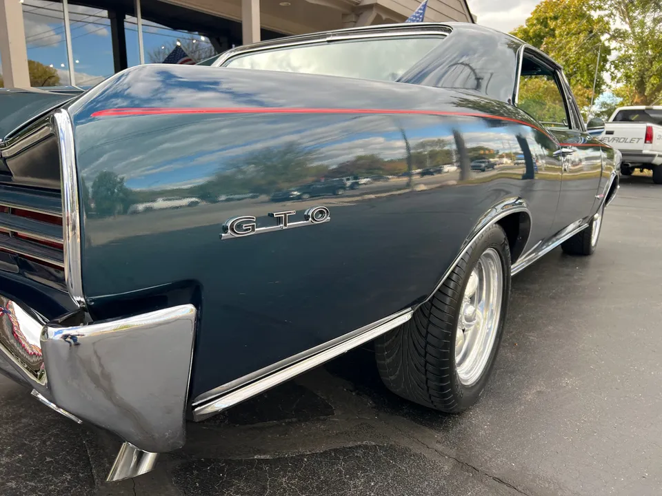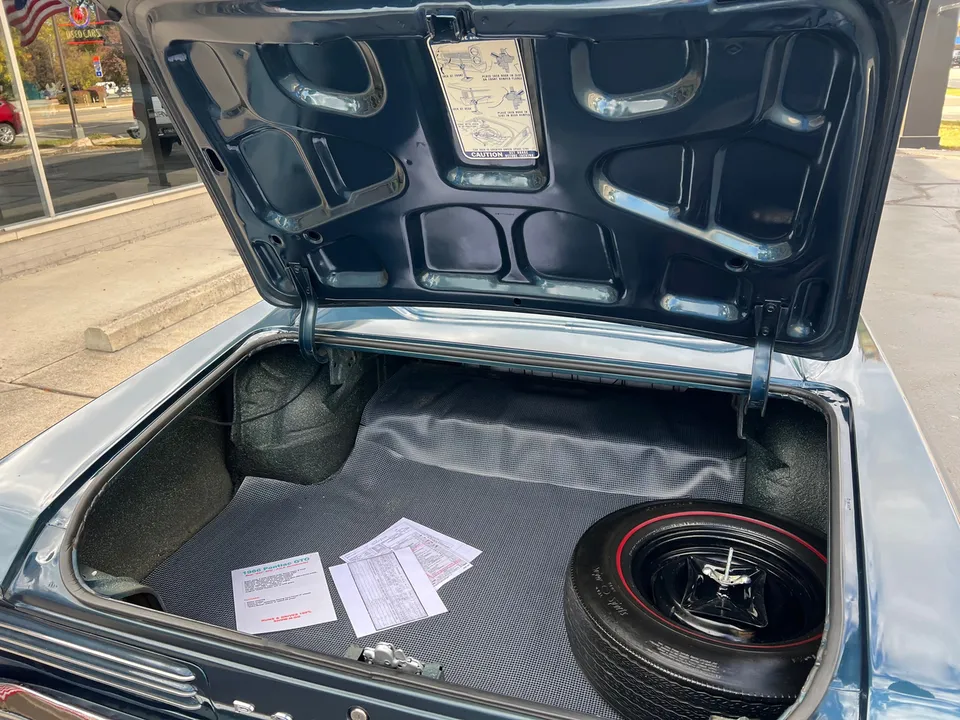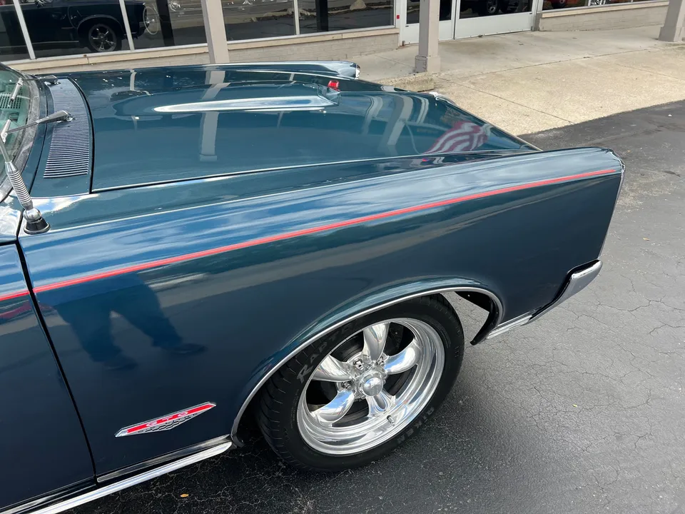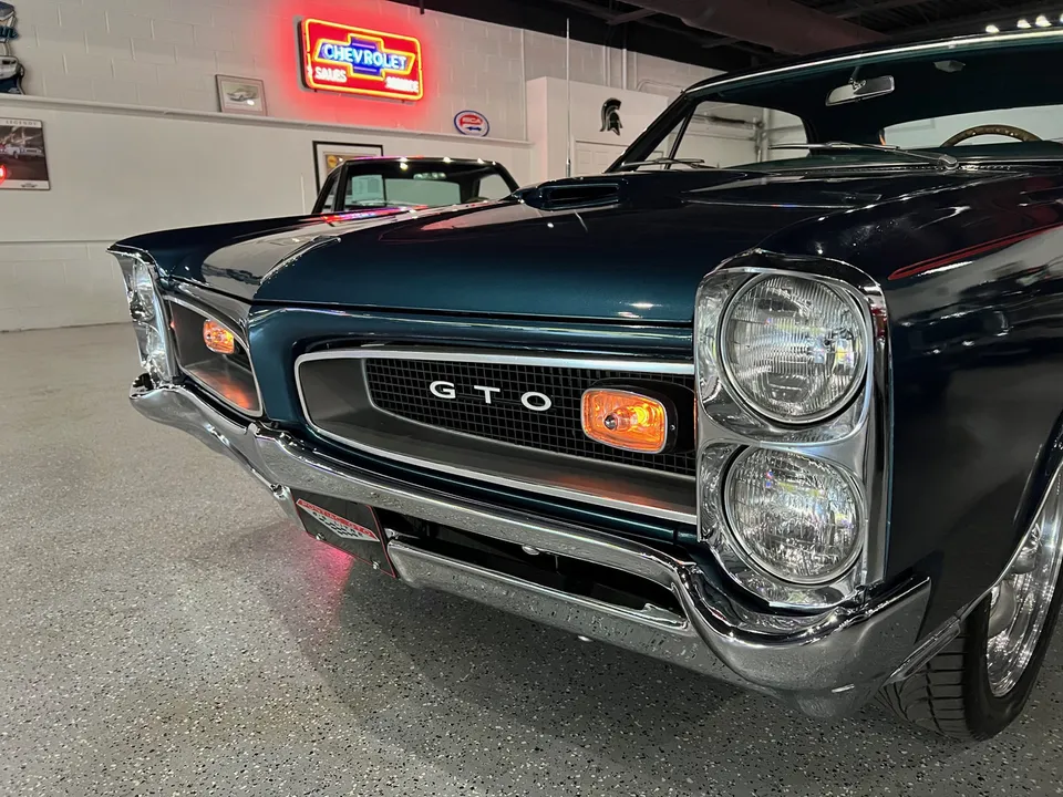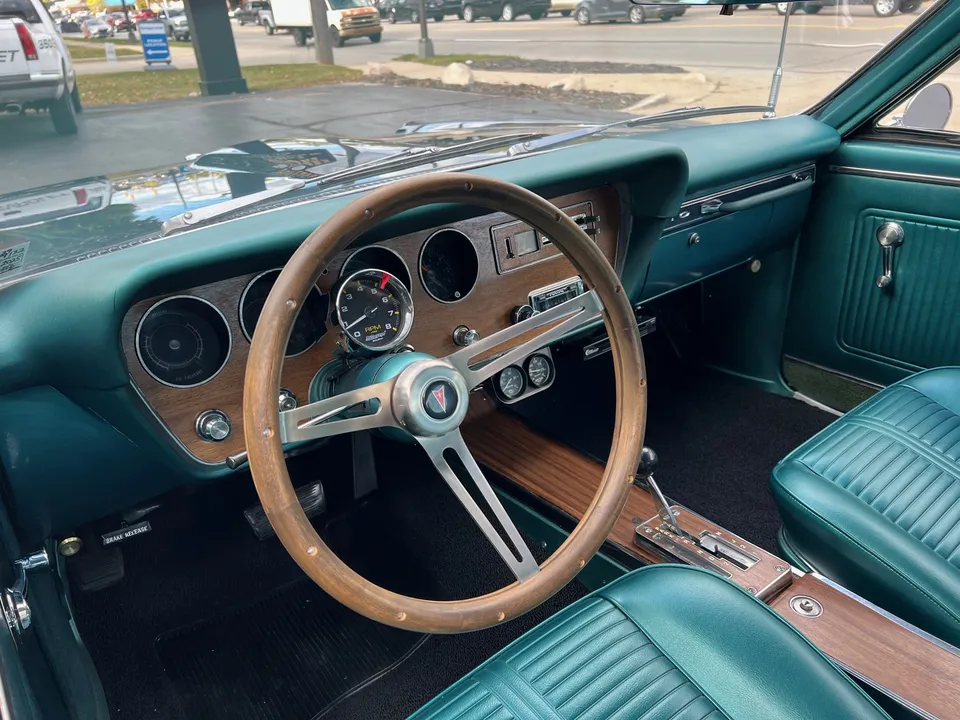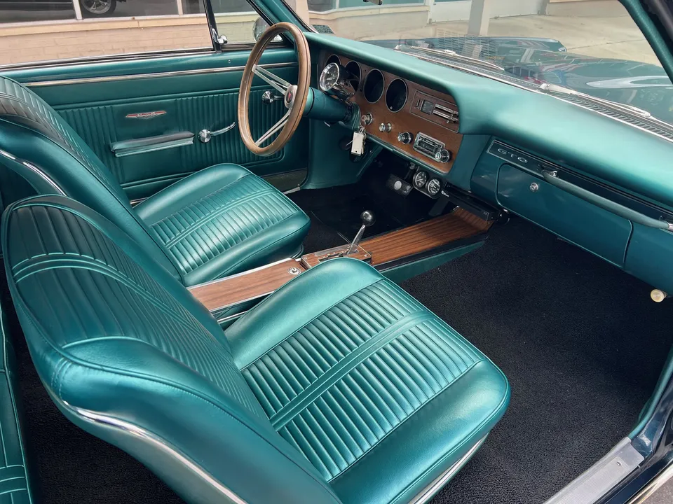 PHS Documented (242) GTO, factory (L) Mariner turquoise metallic car, factory (220) turquoise vinyl interior, 389 ci/335 hp engine, 4 bbl, factory intake & exhaust manifolds, factory chrome air cleaner & valve covers, power steering, power brakes, factory Harrison radiator with shroud, 400 turbohydramatic transmission, factory bucket seats with center console, Hurst His/Hers sifter, factory dash, aftermarket tach & gauges, wood wheel, Retrosounds radio, Flowmaster dual exhaust with chrome tips, factory 10 bolt 3.55 Safe-T-Track rear axle, 255/50ZR17 rear tires, 245/45ZR17 fronts, 17” American Racing Torque Thrust wheels, dual chrome mirrors, GR-RRR!