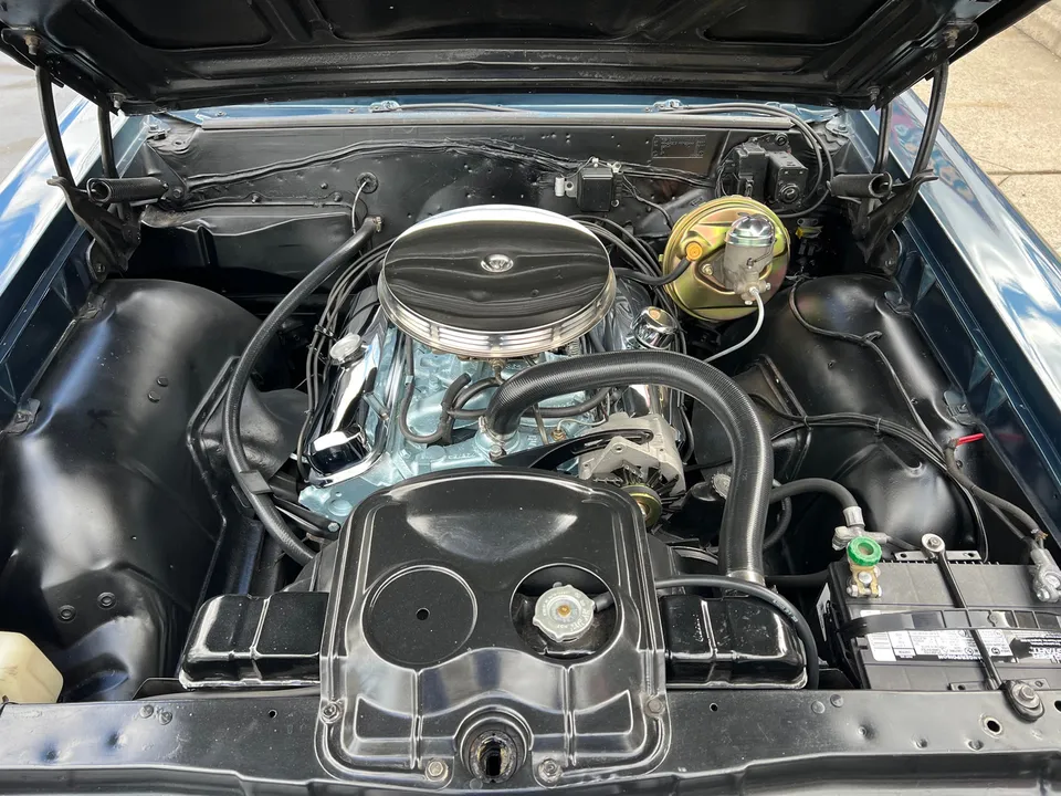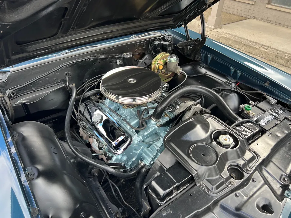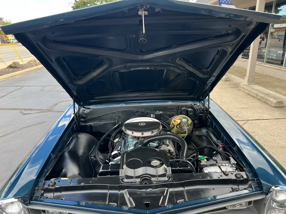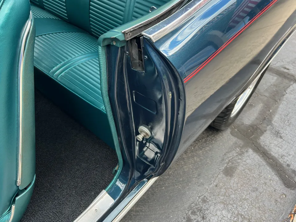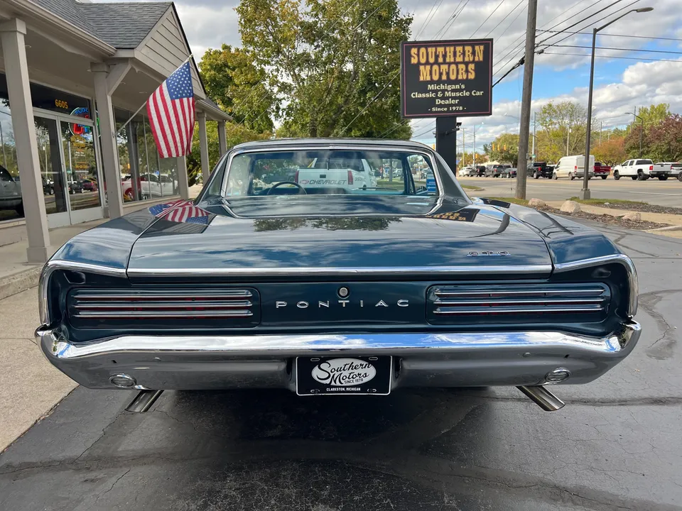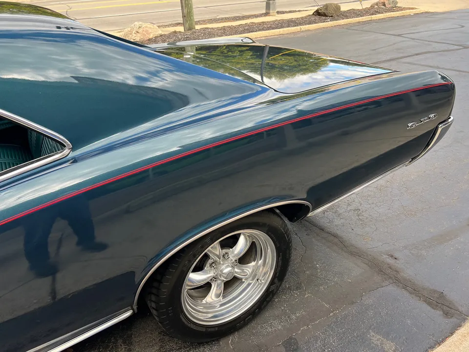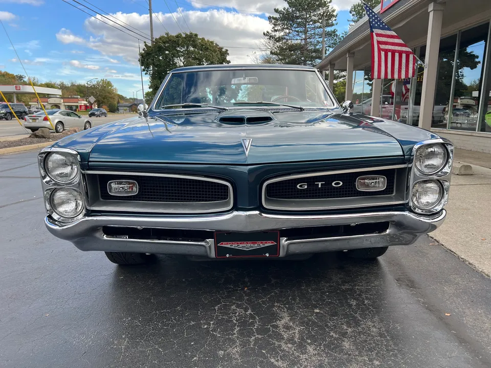 PHS Documented (242) GTO, factory (L) Mariner turquoise metallic car, factory (220) turquoise vinyl interior, 389 ci/335 hp engine, 4 bbl, factory intake & exhaust manifolds, factory chrome air cleaner & valve covers, power steering, power brakes, factory Harrison radiator with shroud, 400 turbohydramatic transmission, factory bucket seats with center console, Hurst His/Hers sifter, factory dash, aftermarket tach & gauges, wood wheel, Retrosounds radio, Flowmaster dual exhaust with chrome tips, factory 10 bolt 3.55 Safe-T-Track rear axle, 255/50ZR17 rear tires, 245/45ZR17 fronts, 17” American Racing Torque Thrust wheels, dual chrome mirrors, GR-RRR!