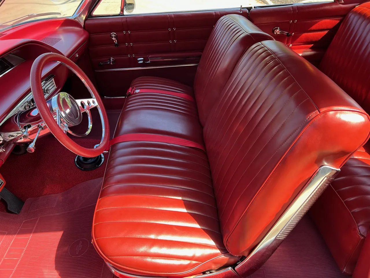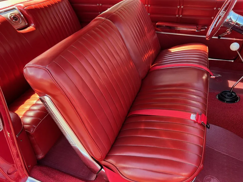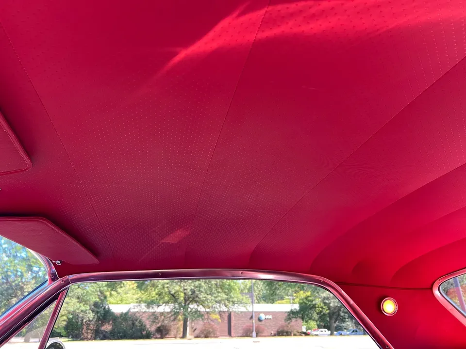 Clean Kentucky car, Body-Up Restoration, beautiful Riverside red paint, factory red vinyl interior, 350 ci engine, 4 speed manual transmission, Edelbrock 4 bbl, Edelbrock aluminum intake, ceramic headers, billet air cleaner & valve covers, power steering, power front disc brakes, Vintage air conditioning, aluminum pulleys, chrome oil pan, Griffin aluminum radiator with electric fan, factory bench seat, chrome tilt column with billet wheel, factory dash, Retrosounds radio, factory shifter, Magnaflow dual exhaust with chrome tips, factory 3.23 rear end, 255/55ZR18 rear tires, 205/50ZR17 fronts, 17 & 18” chrome Ridler wheels, dual antenna, Ready to Cruise!IN STOCK