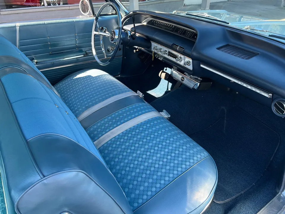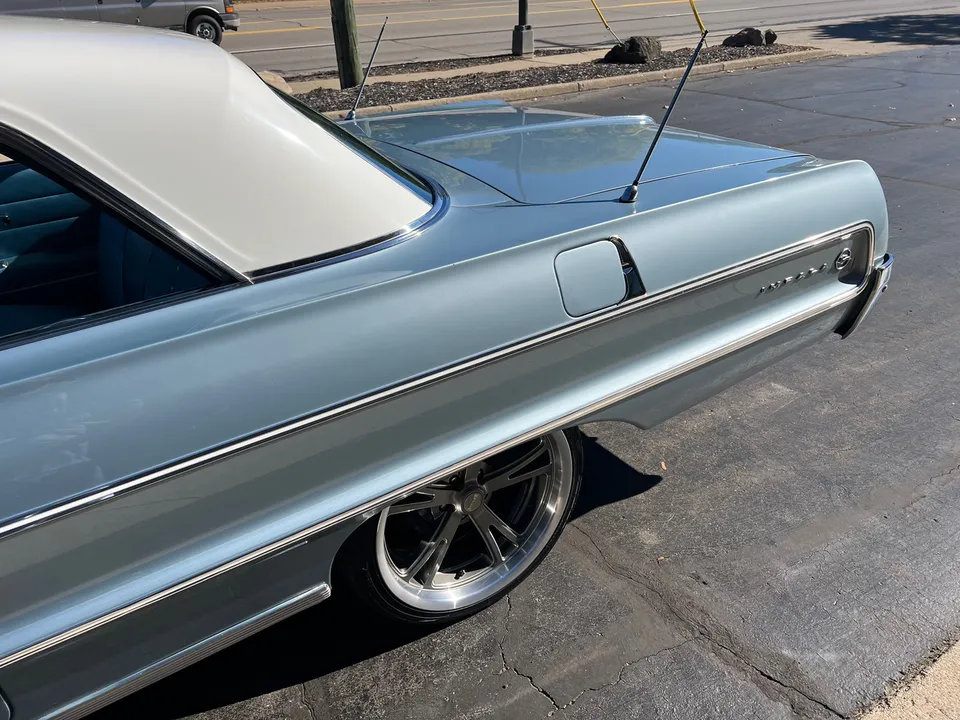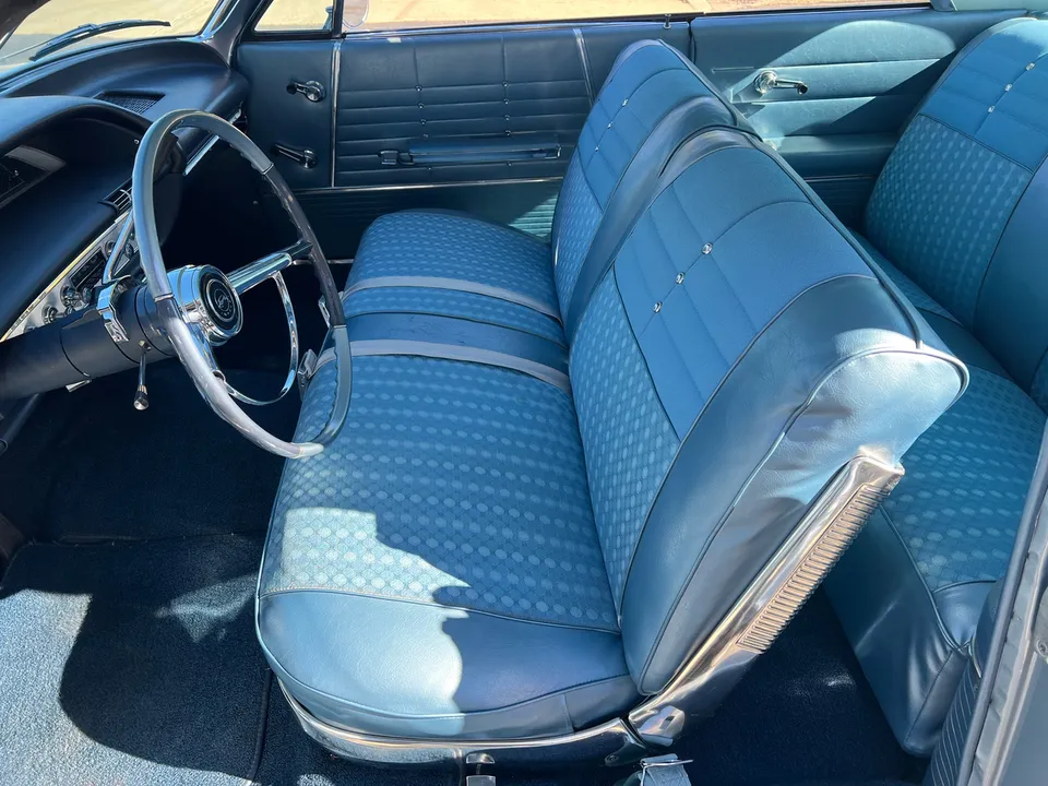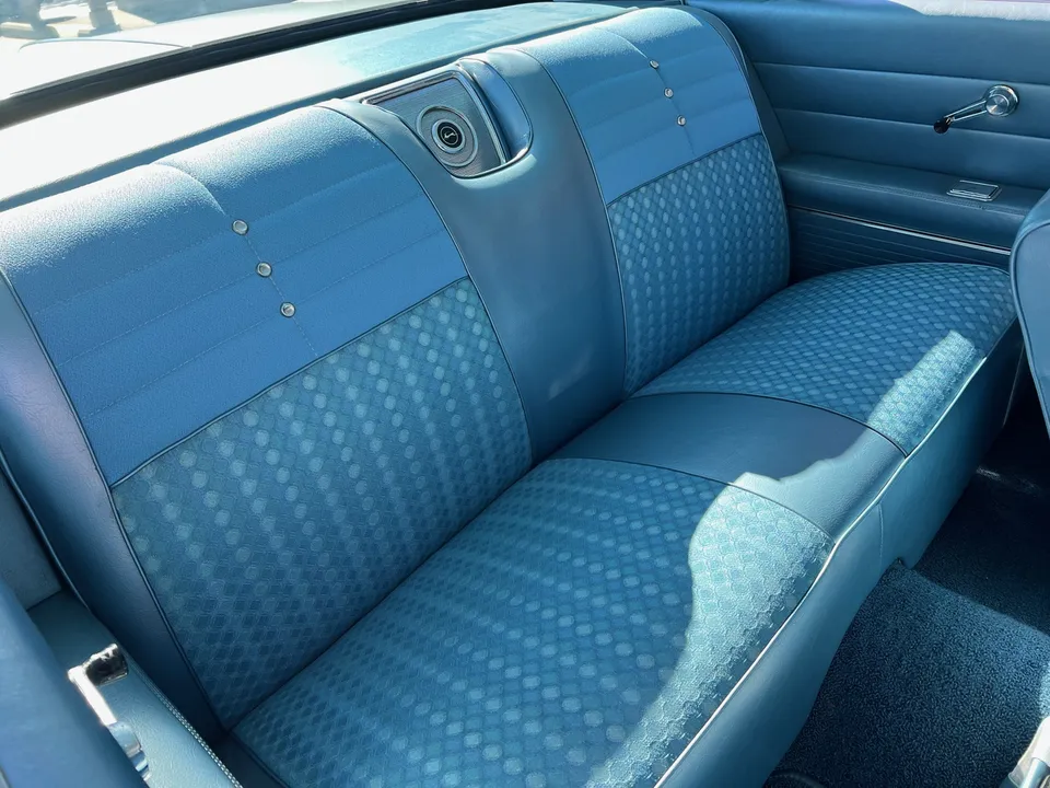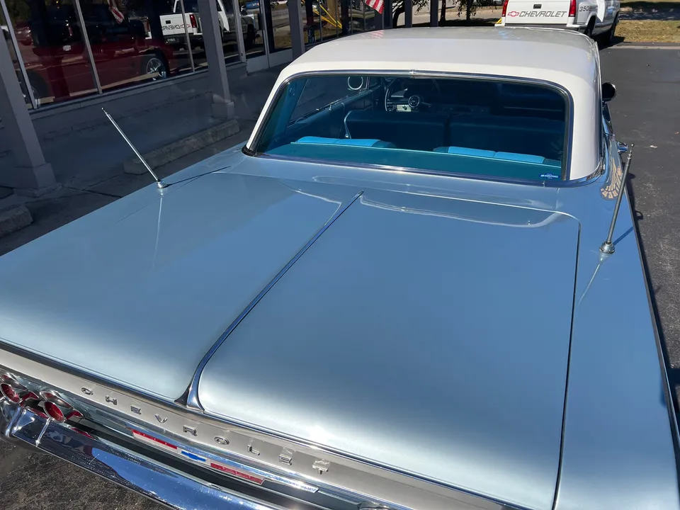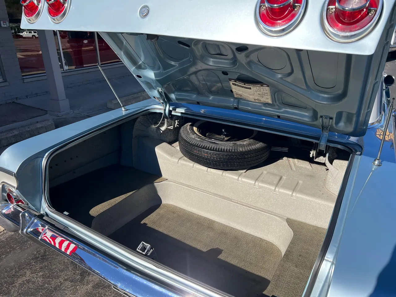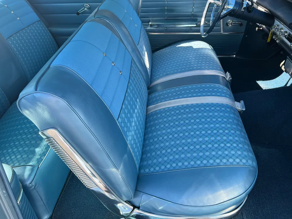 Frame-Off Restored, beautiful (912) two tone silver blue metallic & Ermine white paint, factory (842) blue interior, factory 327 ci engine, 4 bbl, factory intake & exhaust manifolds, factory aire cleaner & valve covers, power steering, power brakes, factory air conditioning, Harrison radiator with shroud, automatic transmission, factory bench seat, original dash & gauges, Delco am radio, factory tissue dispenser, dual exhaust, factory rear axle, 235/35ZR20 Nitto tires, 20” Ridler wheels, factory jack with spare, original owner’s manual, dual chrome mirrors, dual antenna, Drive Anywhere!