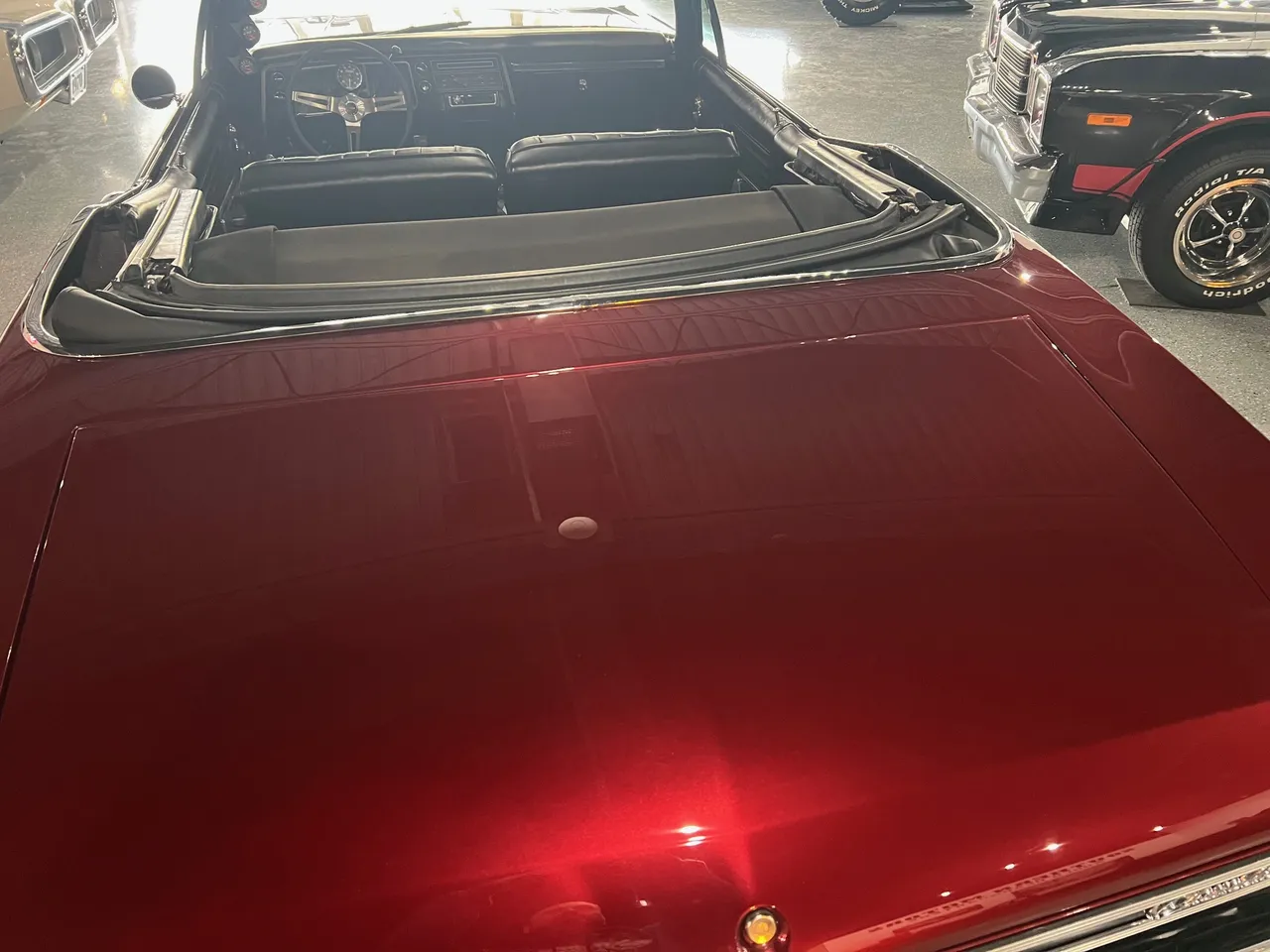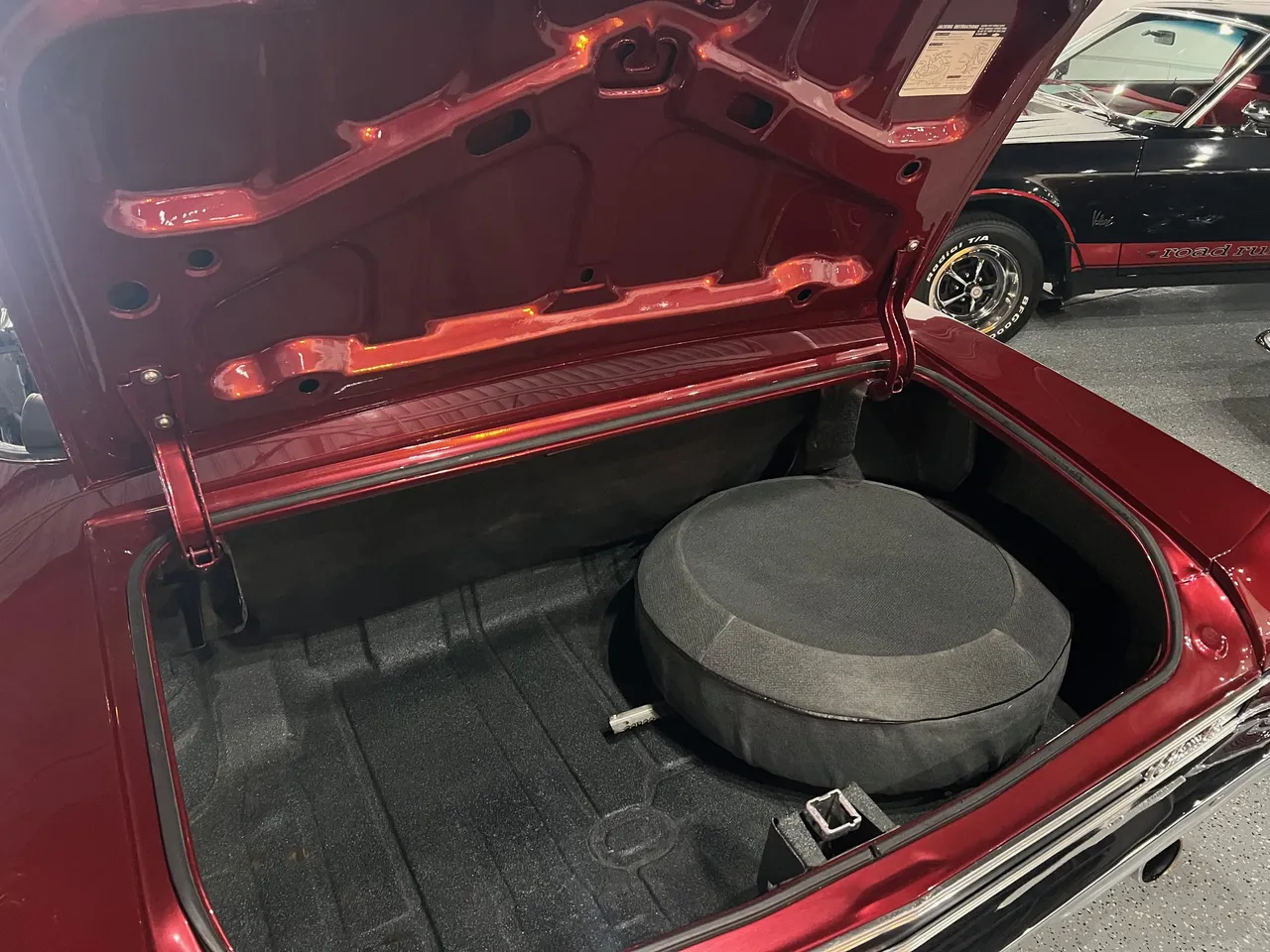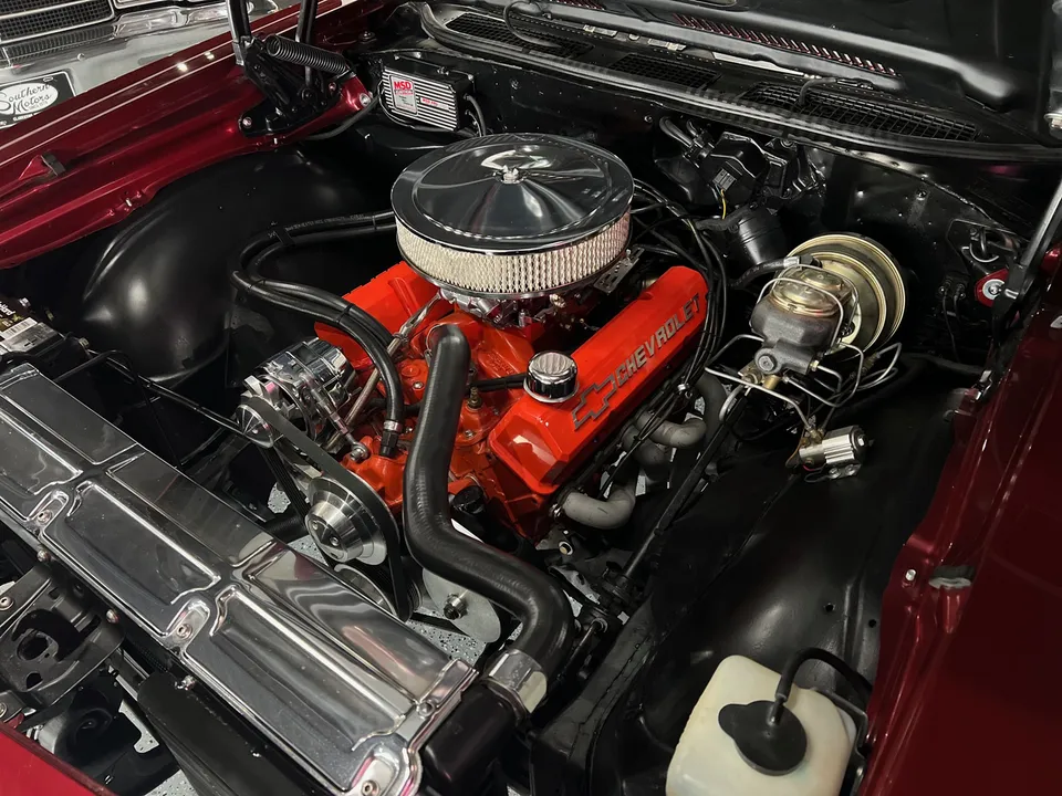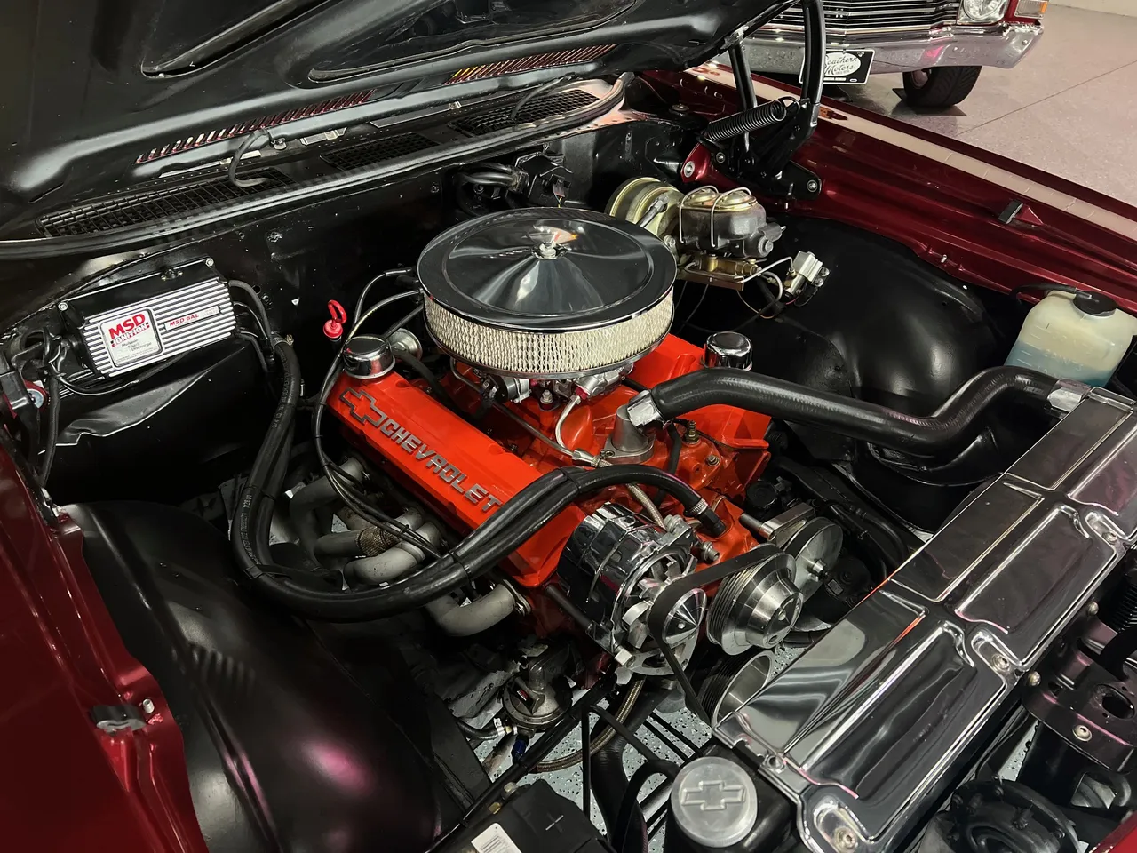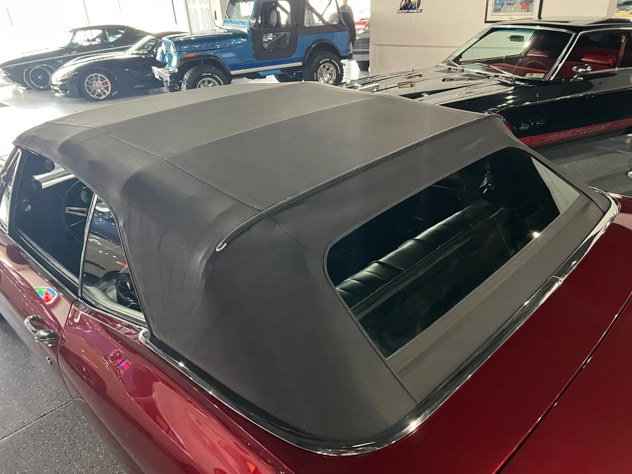 Recent Frame-Up Restoration, clean Virginia car, stunning factory (N) Cordovan maroon metallic car, factory black vinyl top, new black convertible top, 383 ci stroker engine, Brawler Performance dual feed 4 bbl, Edelbrock Performer RPM aluminum intake, GM “double hump” heads, mild camshaft, headers, chrome air cleaner, billet Chevrolet valve covers, MSD 6AL ignition, power steering, power front disc brakes, billet front runner system, custom radiator with dual electric fans, 700R4 automatic overdrive transmission with lock-up converter, factory bench seat, factory dash, Sport steering wheel, aftermarket tach with pillar pod gauges, JVC sound system, power top, 3” Flowmaster dual exhaust with chrome tips, 10 bolt 3.73 limited slip rear axle with ladder bars, 255/45R18 rear tires, 235/45R17 fronts, 17 & 18” American Racing Torque Thrust wheels, One Bad Bowtie!