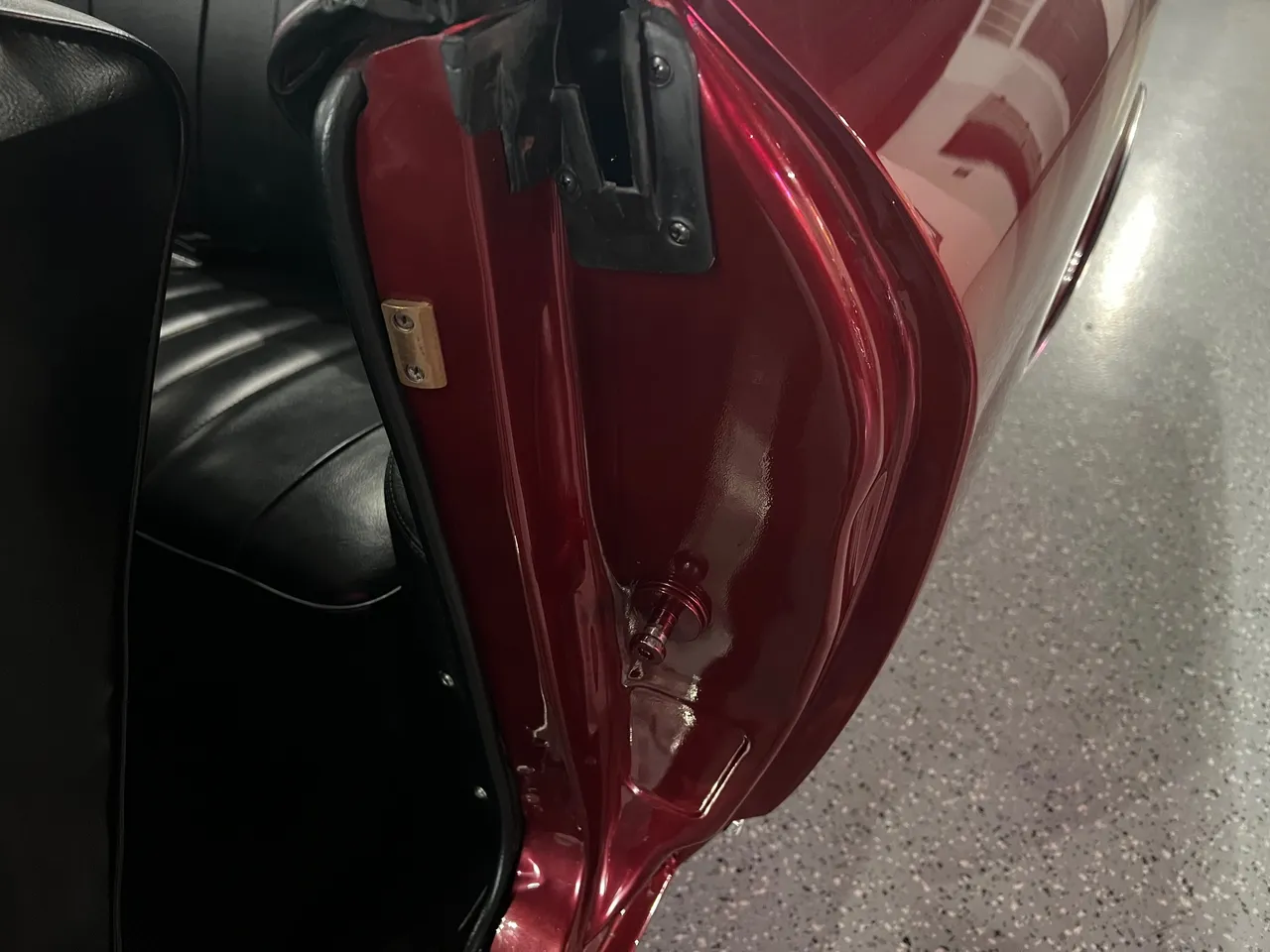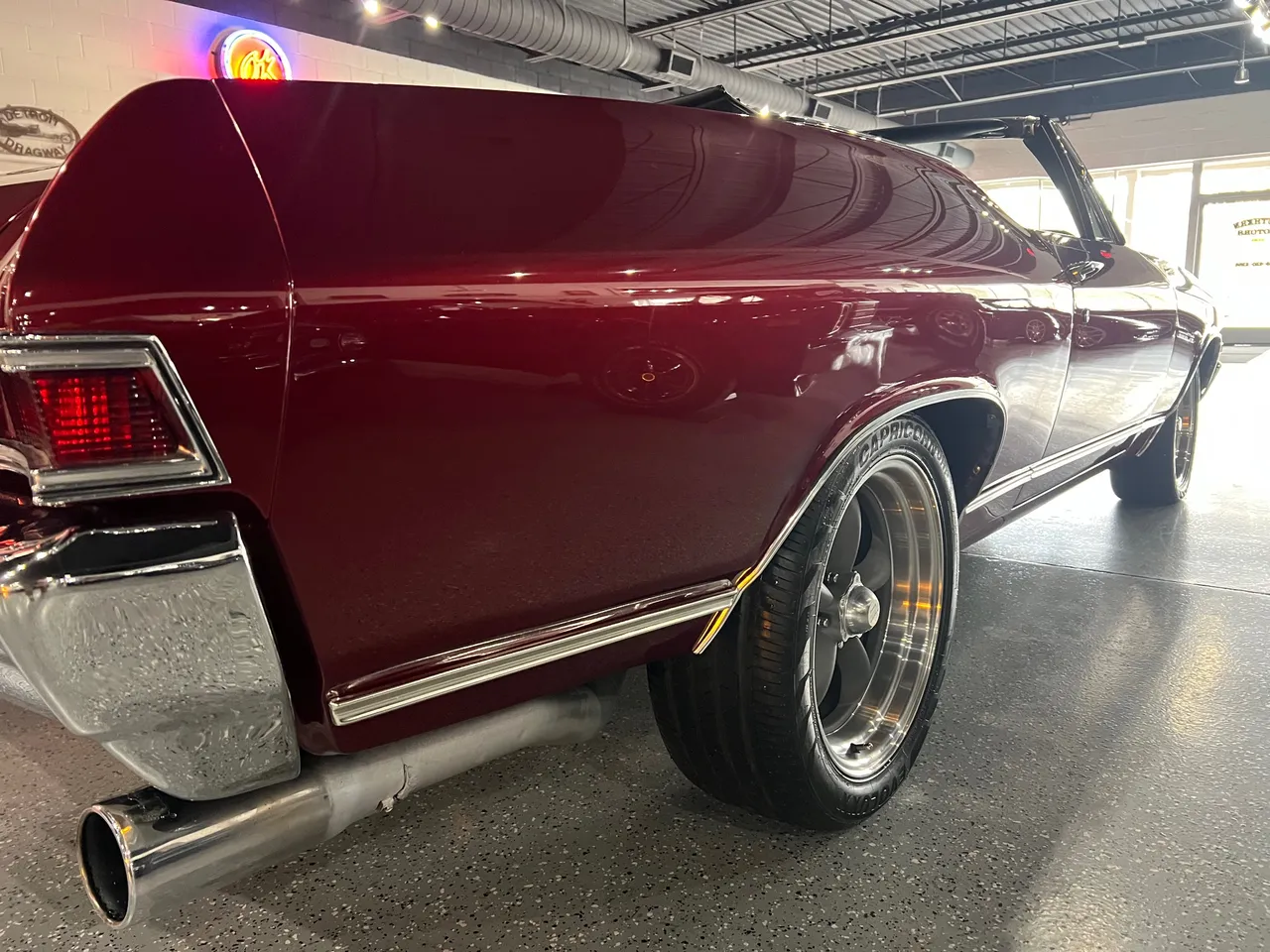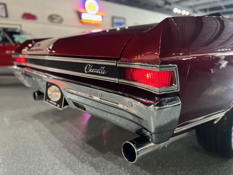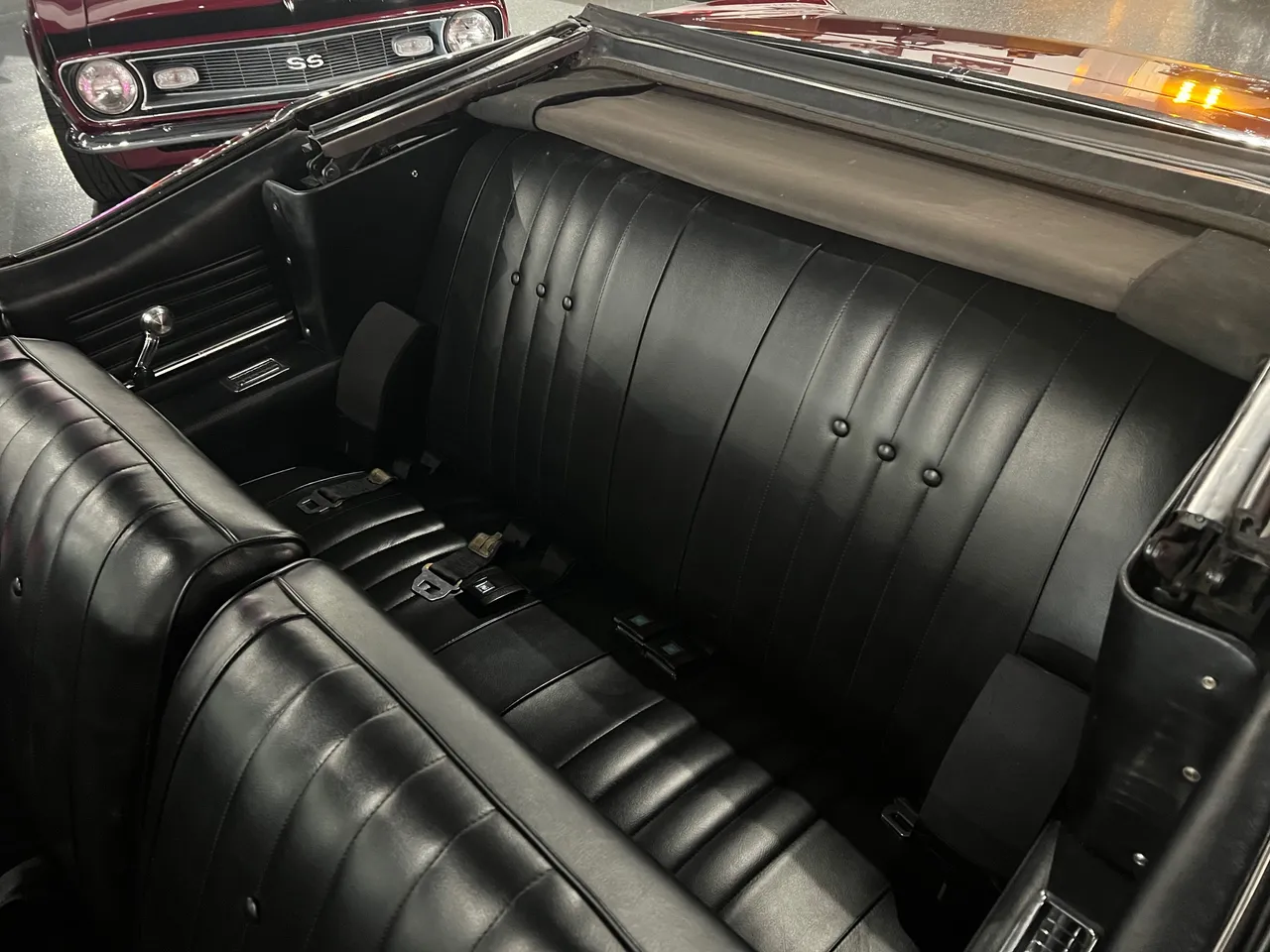Recent Frame-Up Restoration, clean Virginia car, stunning factory (N) Cordovan maroon metallic car, factory black vinyl top, new black convertible top, 383 ci stroker engine, Brawler Performance dual feed 4 bbl, Edelbrock Performer RPM aluminum intake, GM “double hump” heads, mild camshaft, headers, chrome air cleaner, billet Chevrolet valve covers, MSD 6AL ignition, power steering, power front disc brakes, billet front runner system, custom radiator with dual electric fans, 700R4 automatic overdrive transmission with lock-up converter, factory bench seat, factory dash, Sport steering wheel, aftermarket tach with pillar pod gauges, JVC sound system, power top, 3” Flowmaster dual exhaust with chrome tips, 10 bolt 3.73 limited slip rear axle with ladder bars, 255/45R18 rear tires, 235/45R17 fronts, 17 & 18” American Racing Torque Thrust wheels, One Bad Bowtie!
