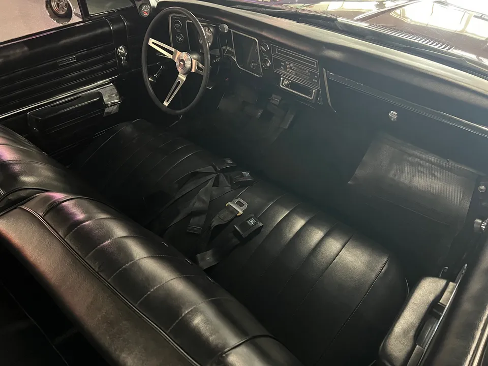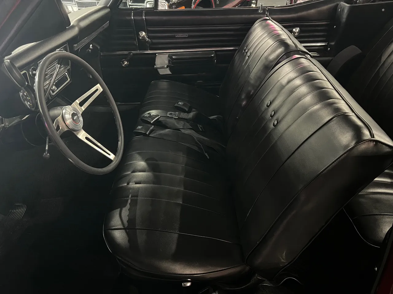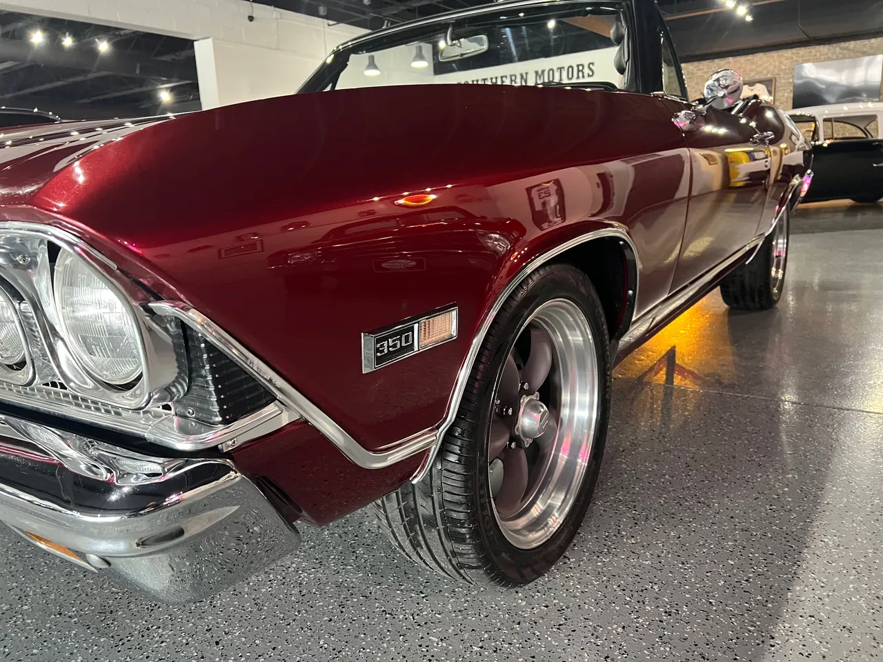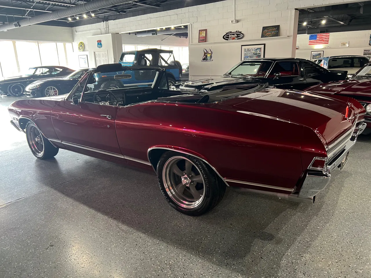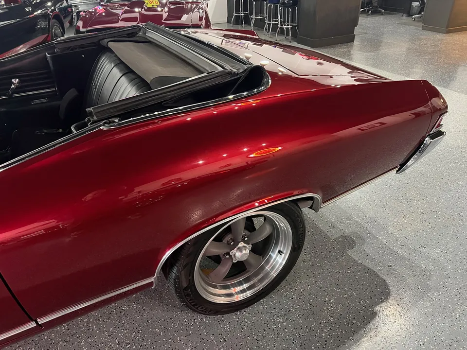 Recent Frame-Up Restoration, clean Virginia car, stunning factory (N) Cordovan maroon metallic car, factory black vinyl top, new black convertible top, 383 ci stroker engine, Brawler Performance dual feed 4 bbl, Edelbrock Performer RPM aluminum intake, GM “double hump” heads, mild camshaft, headers, chrome air cleaner, billet Chevrolet valve covers, MSD 6AL ignition, power steering, power front disc brakes, billet front runner system, custom radiator with dual electric fans, 700R4 automatic overdrive transmission with lock-up converter, factory bench seat, factory dash, Sport steering wheel, aftermarket tach with pillar pod gauges, JVC sound system, power top, 3” Flowmaster dual exhaust with chrome tips, 10 bolt 3.73 limited slip rear axle with ladder bars, 255/45R18 rear tires, 235/45R17 fronts, 17 & 18” American Racing Torque Thrust wheels, One Bad Bowtie!