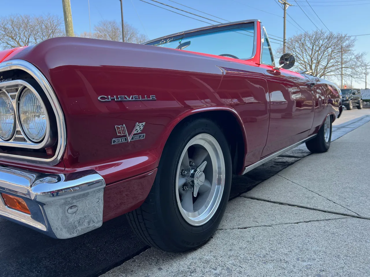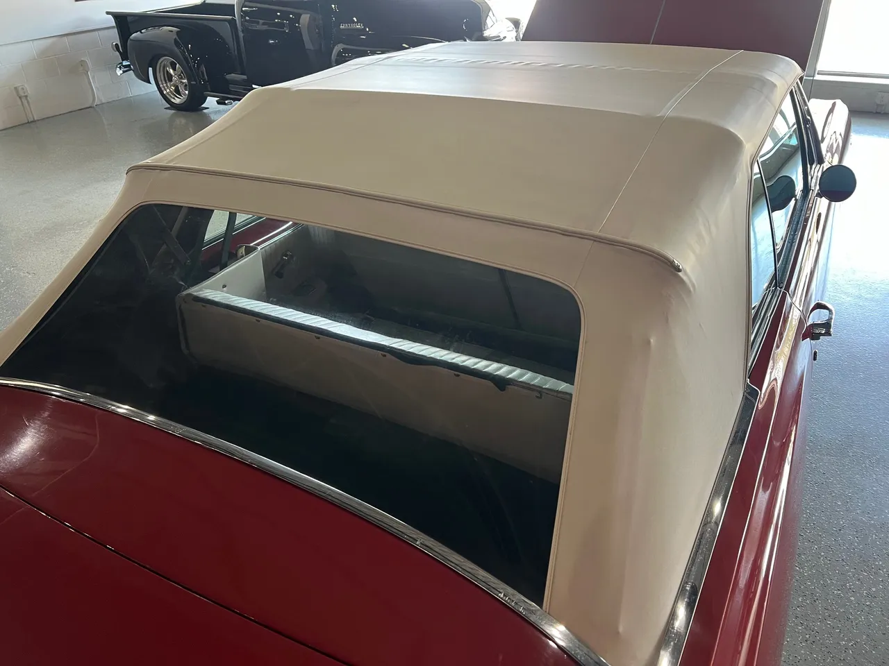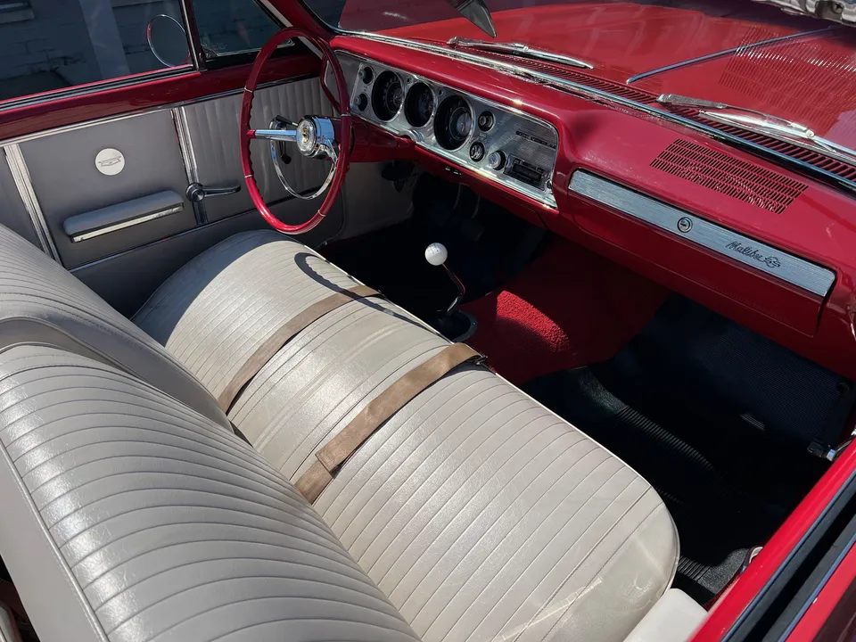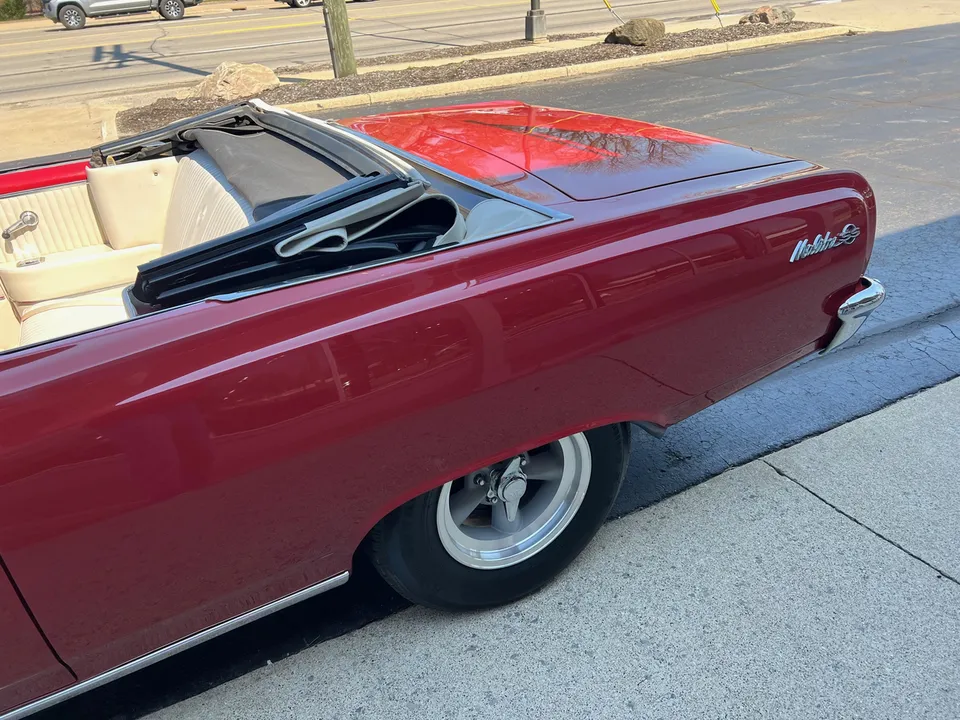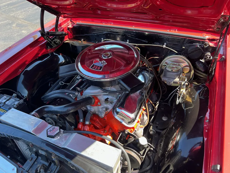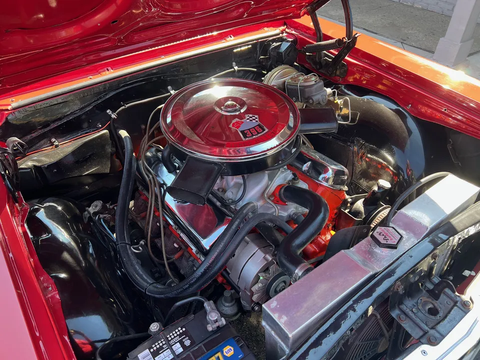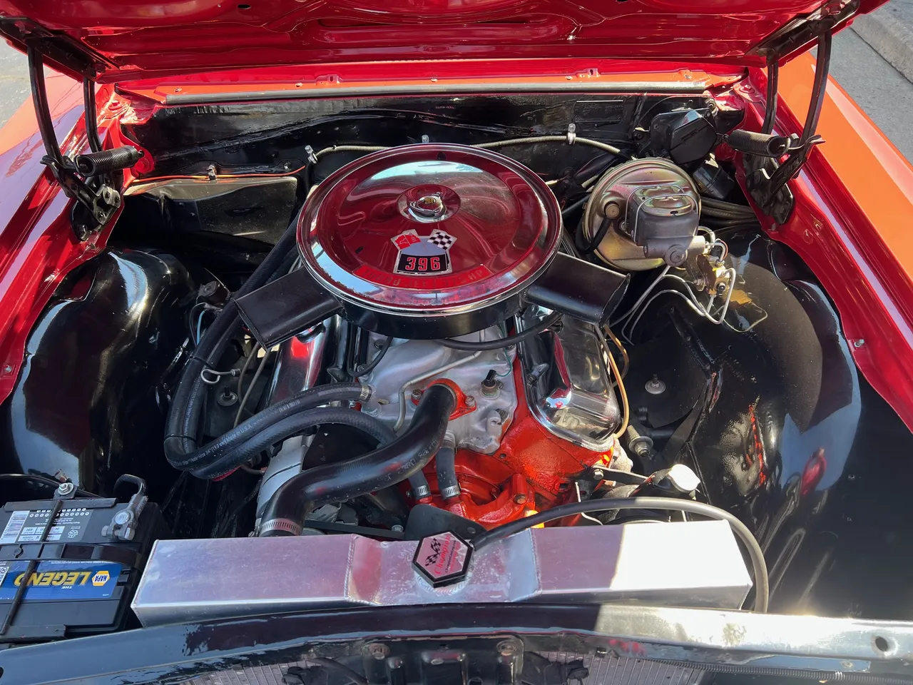Clean Tennessee car, Ember red paint, white convertible top, Ivory vinyl interior, 396 ci engine, Muncie 4-speed manual transmission, Holley 4 bbl, aluminum intake, HEI distributor, factory exhaust manifolds, mild camshaft, chrome air cleaner & valve covers, power steering, CPP power front disc brakes, tubular upper & lower control arms, aluminum radiator, factory bench seat, factory dash & gauges, Audiosounds radio, factory floor shifter, Flowmaster dual exhaust, 10 bolt 3.23 rear axle, boxed control arms, rear sway bar, 225/75R15 rear tires, 205/75R15 fronts, 15” American Racing Torque Thrust D wheels, factory jack with spare, Soft Ray glass, Ready to Cruise!