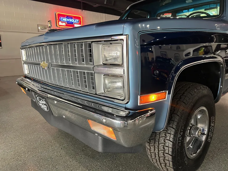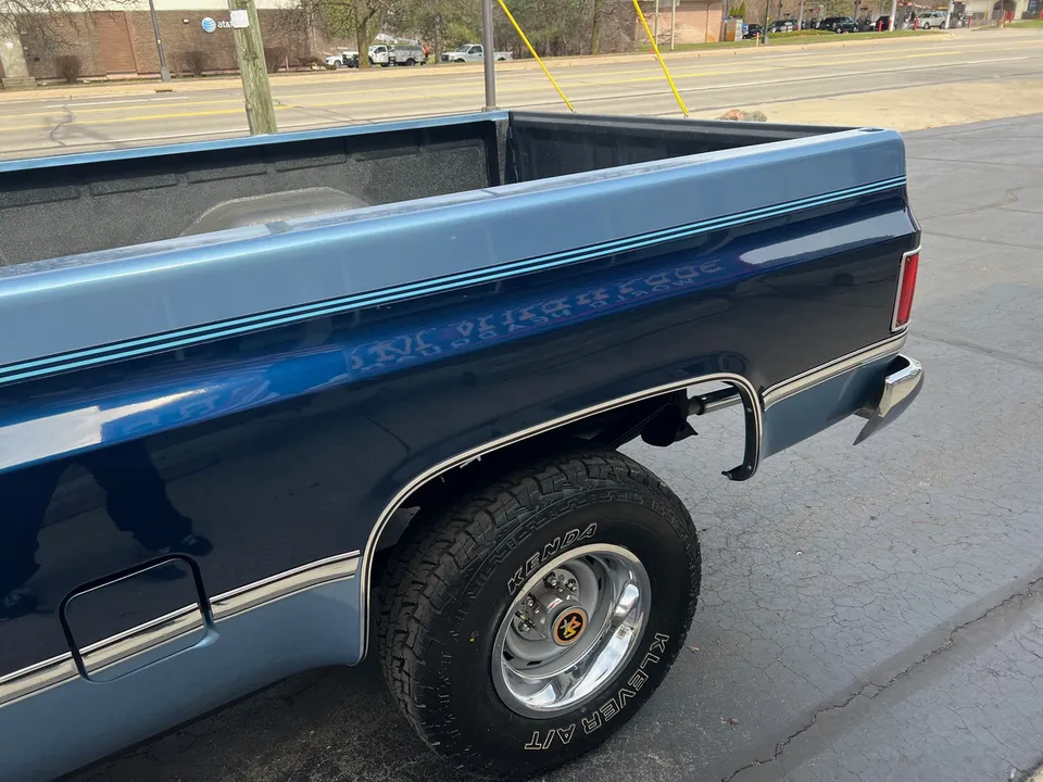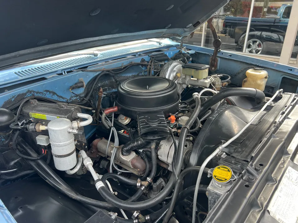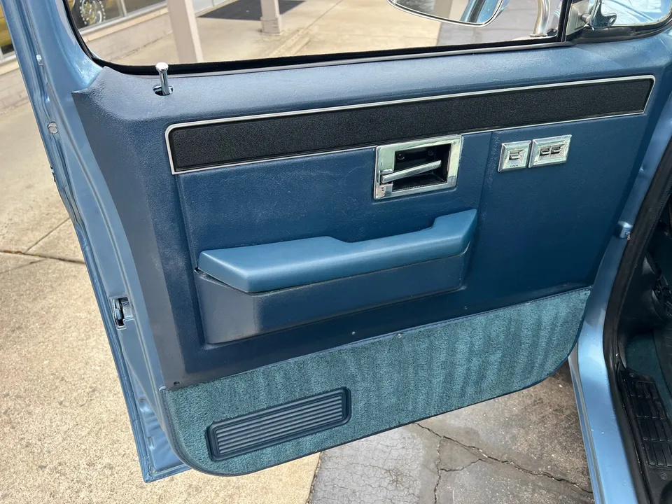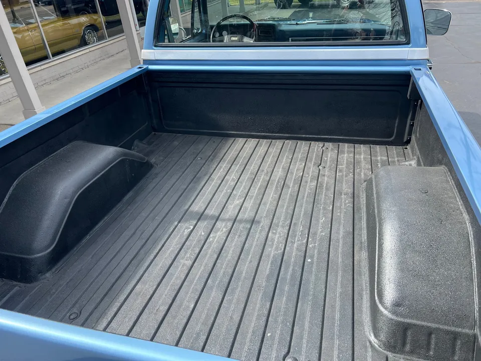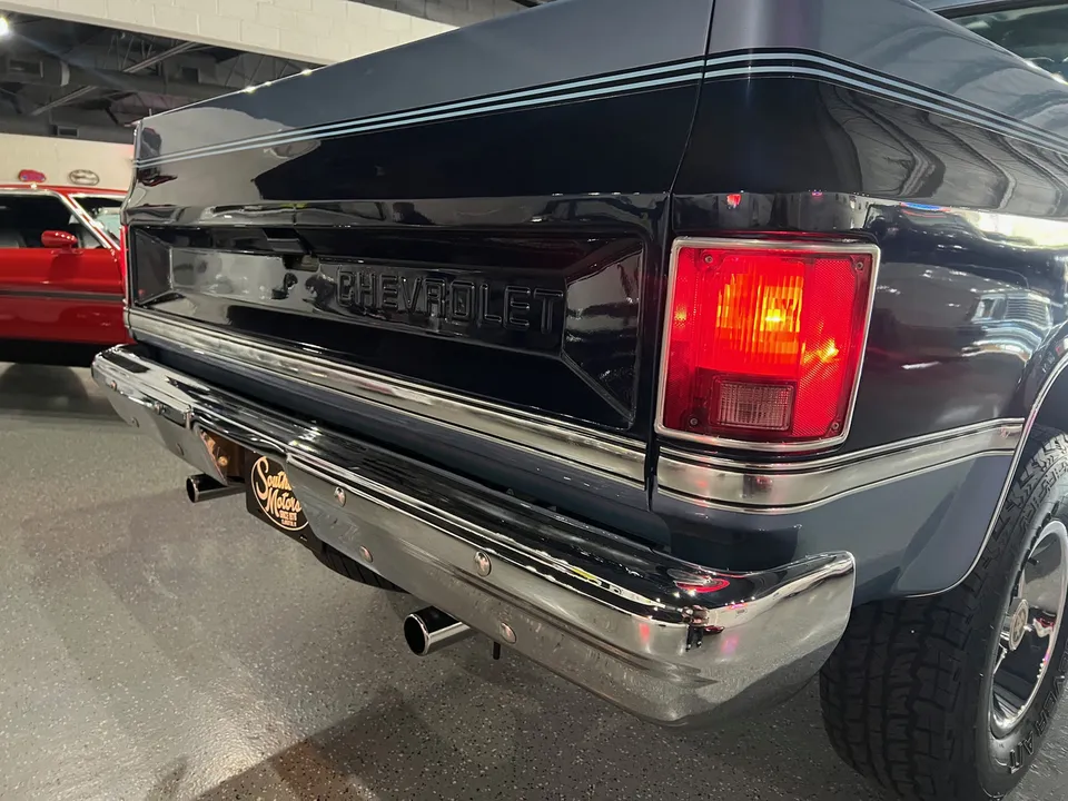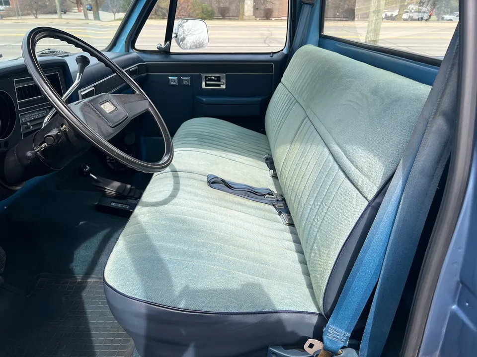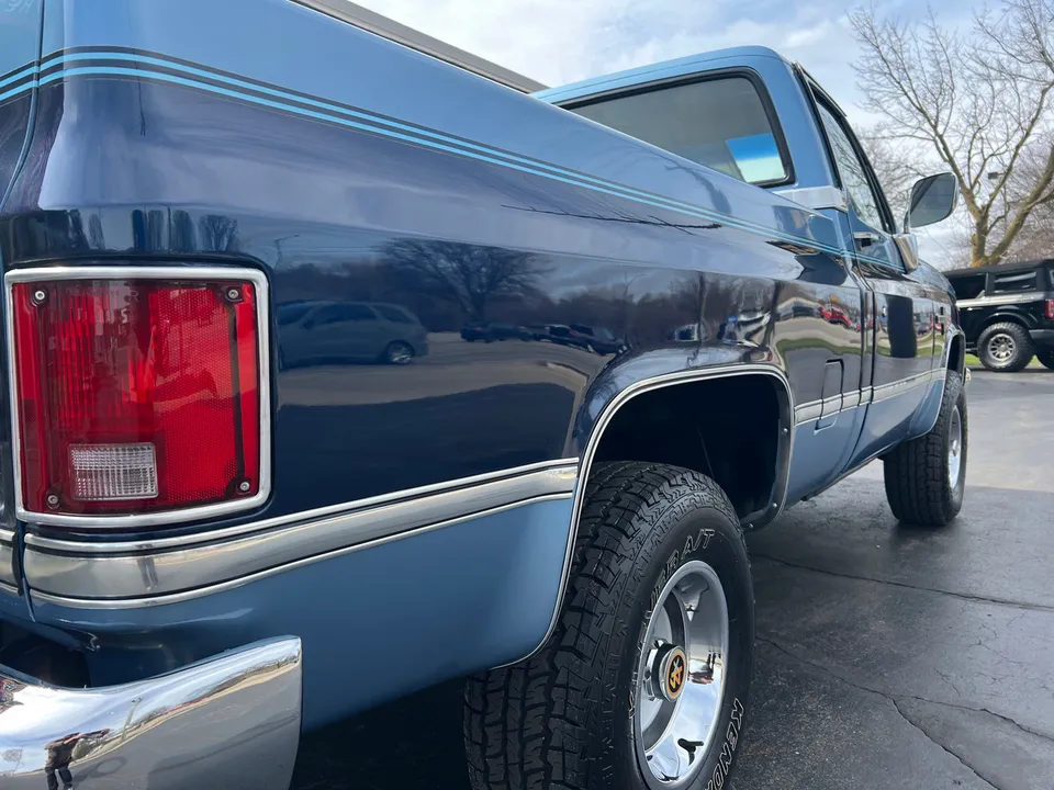 Clean Original Texas Short Box 4X4, beautiful two-tone blue metallic, two tone cloth interior, GM 305 ci crate engine, 4 bbl, factory intake & exhaust manifolds, factory air cleaner & valve covers, power steering, power front disc brakes, factory air conditioning, automatic transmission, factory bench seat, tilt column, factory dash & gauges, Delco am-fm radio, power windows & locks, cruise control, dual tanks, dual exhaust, factory rear axle, 31X10.5R15LT tires, factory 15” Rally wheels, Rhino lined bed, Soft Ray glass, dual chrome mirrors, Clean Carfax, Drive Anywhere!