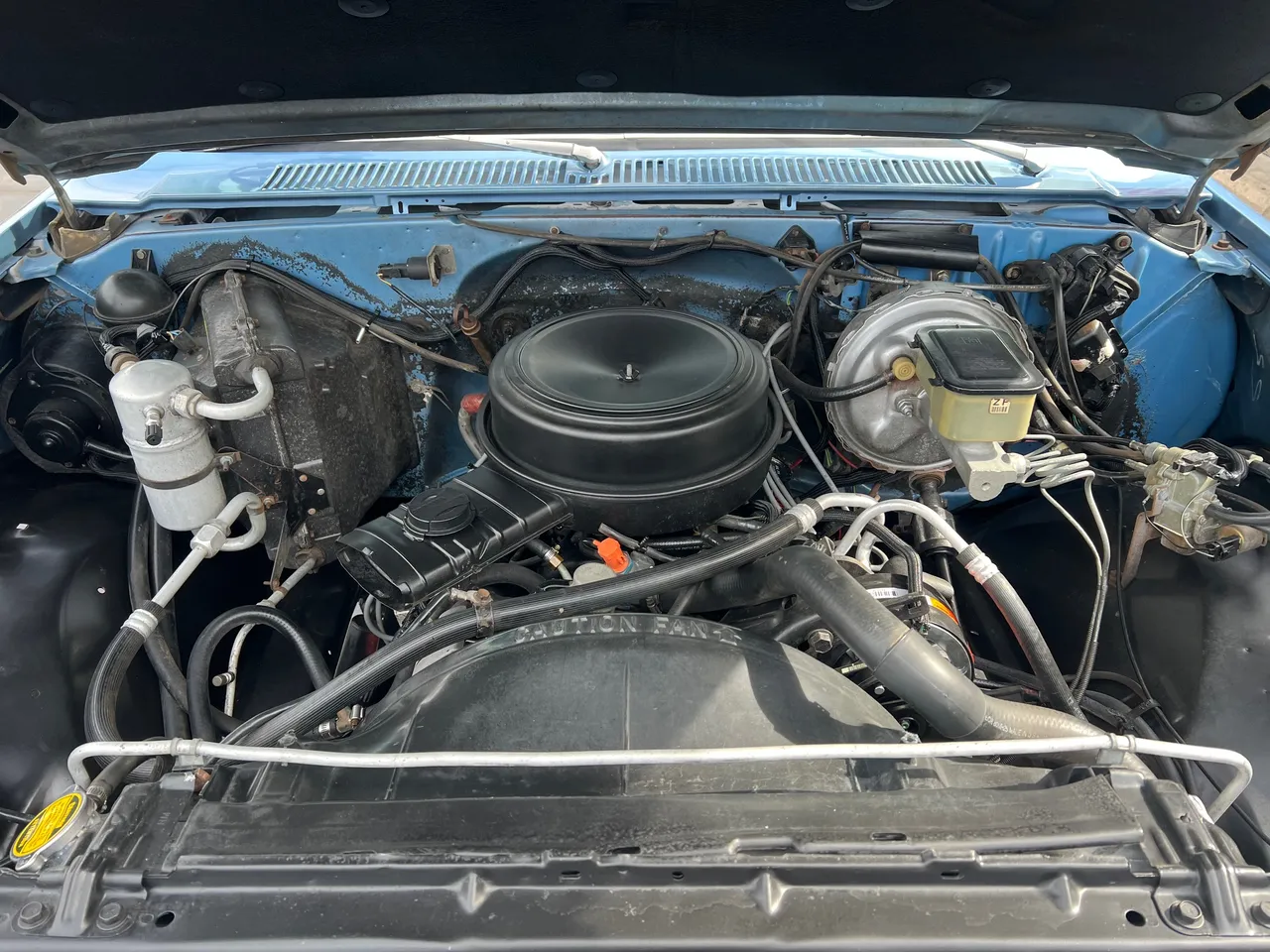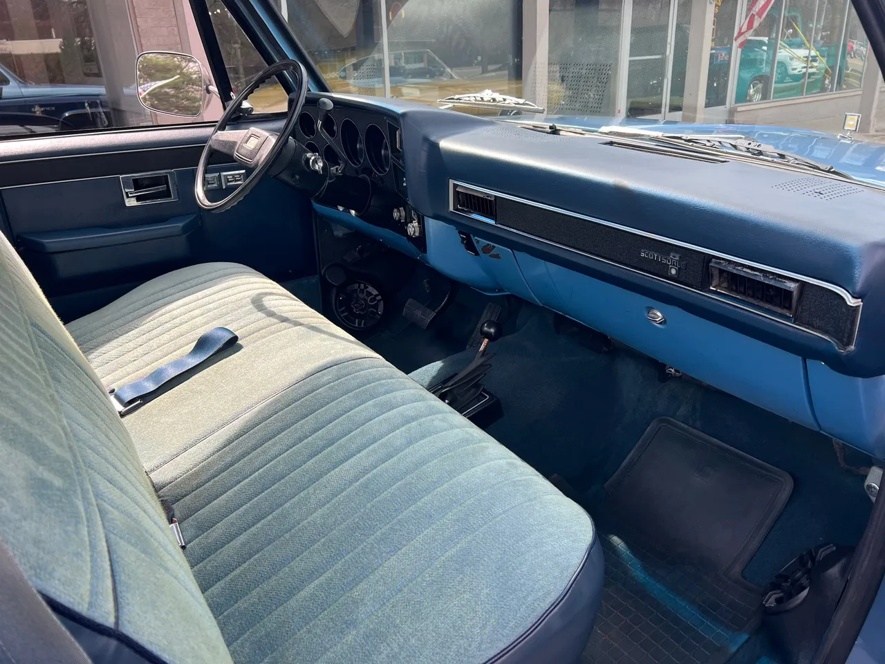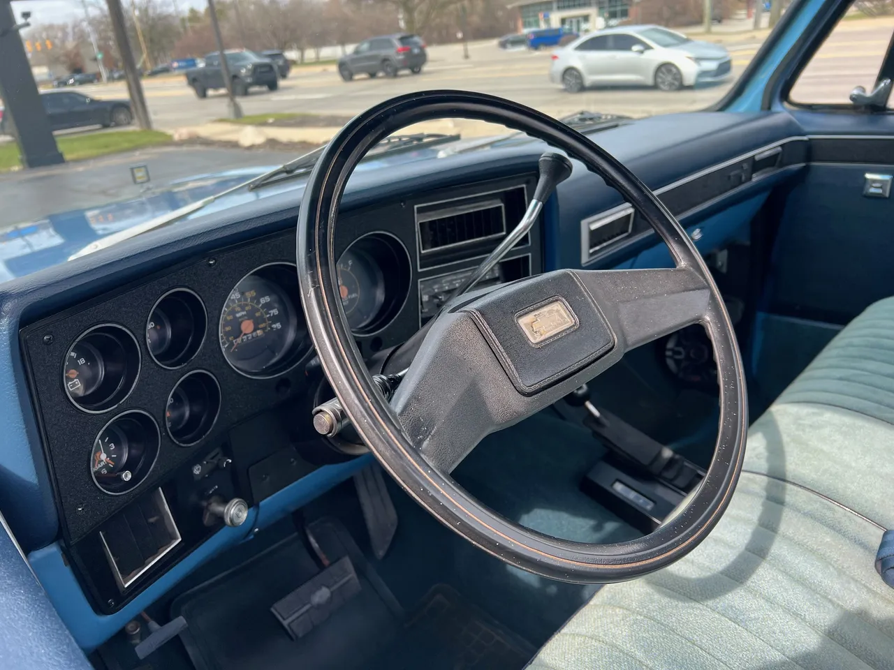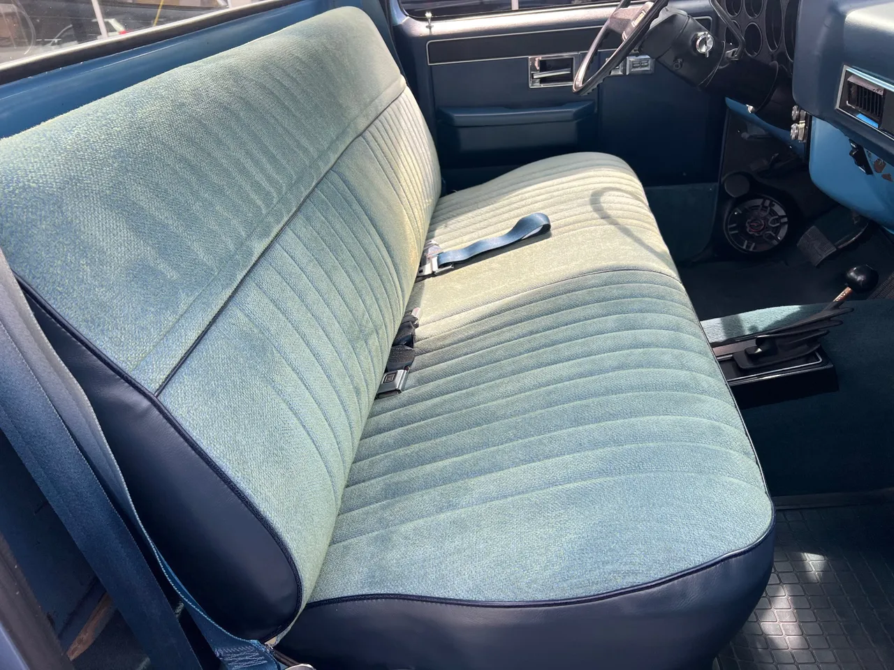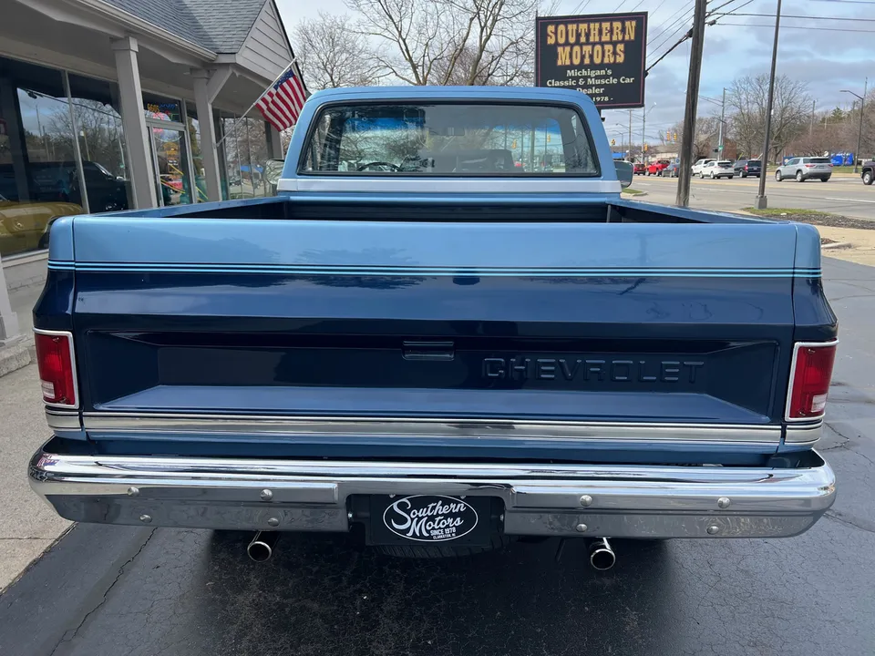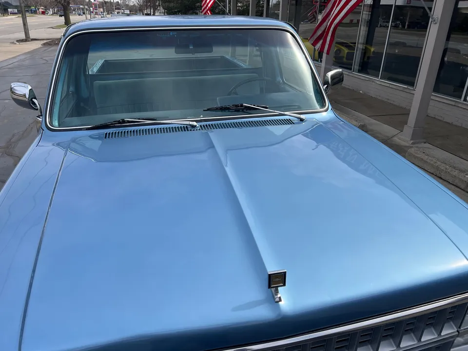 Clean Original Texas Short Box 4X4, beautiful two-tone blue metallic, two tone cloth interior, GM 305 ci crate engine, 4 bbl, factory intake & exhaust manifolds, factory air cleaner & valve covers, power steering, power front disc brakes, factory air conditioning, automatic transmission, factory bench seat, tilt column, factory dash & gauges, Delco am-fm radio, power windows & locks, cruise control, dual tanks, dual exhaust, factory rear axle, 31X10.5R15LT tires, factory 15” Rally wheels, Rhino lined bed, Soft Ray glass, dual chrome mirrors, Clean Carfax, Drive Anywhere!